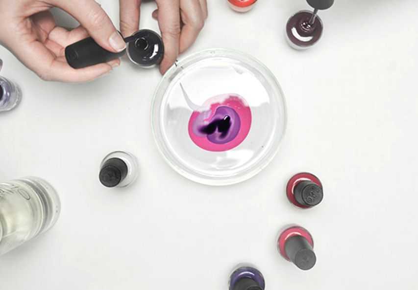 - Вот теперь можно с чистой совестью приступать к творческому процессу! Возьмите лак и капните в воду. Лучше всего поднести кисть как можно ближе к поверхности воды. Если капля расползается — всё замечательно, вы на пути к успеху
