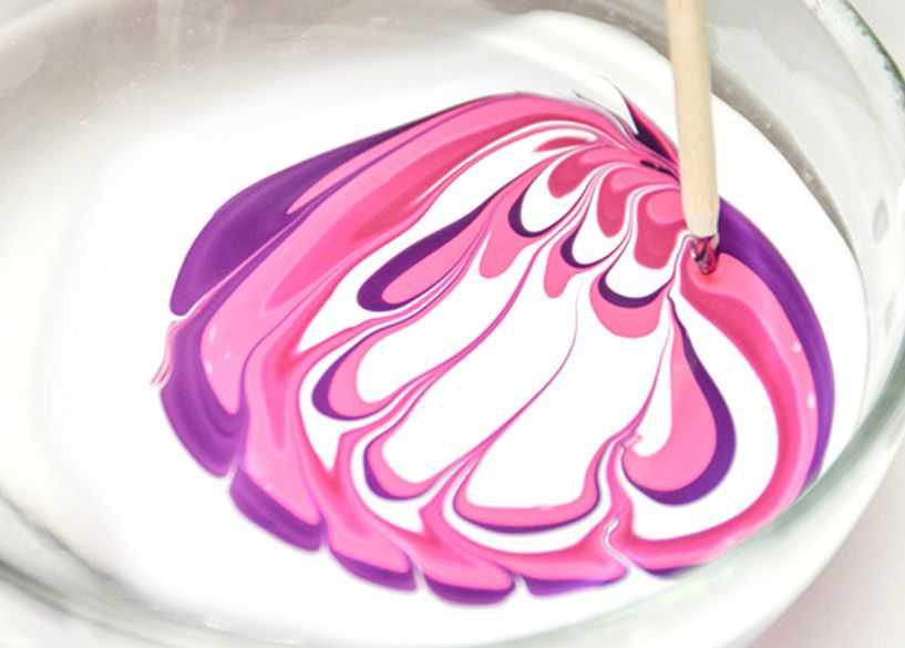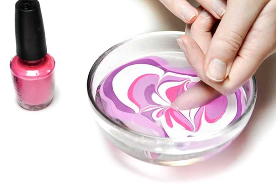 - Снова возьмите зубочистку или иголку, но на этот раз для того, чтобы аккуратно накрутить на неё излишки лака, оставшиеся в воде. Эта процедура даст вам возможность убирать с пальцев меньшее количество краски, чем могло бы быть