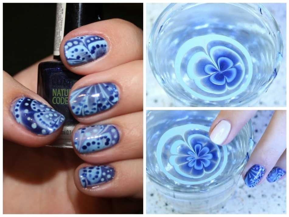 - После завершения узора плавным, но уверенным движением опустите палец ногтём вниз в любое приглянувшееся место рисунка. Обязательно опускайте ноготь параллельно поверхности, иначе в случае вертикального погружения лак просто превратится в непонятный комок на ногте
