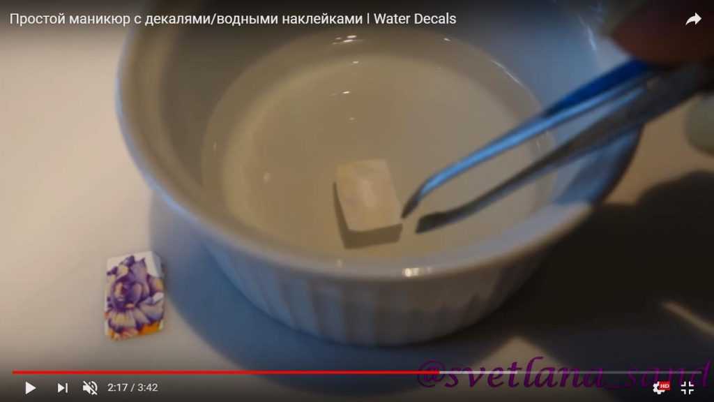 - Декоративные материалы, требующие использования жидкости. Для того чтобы перенести изображение на ногтевую пластину необходимо опустить его в теплую воду, а потом прижать его к ногтю и устранить бумажную основу.