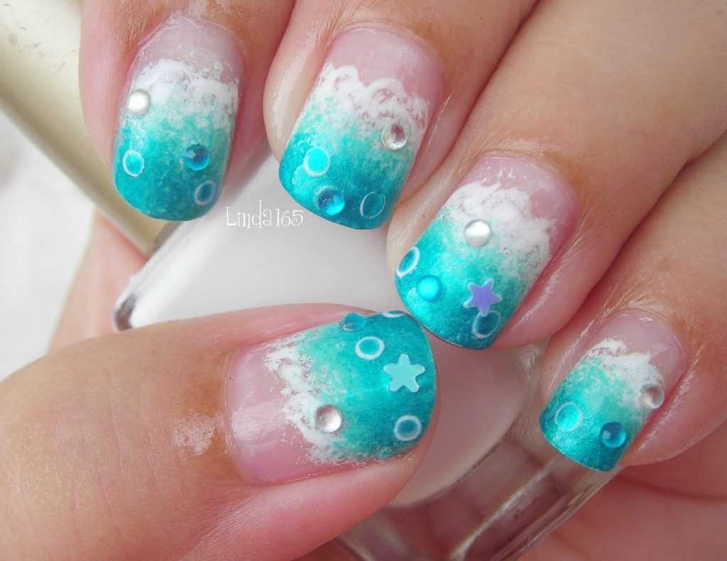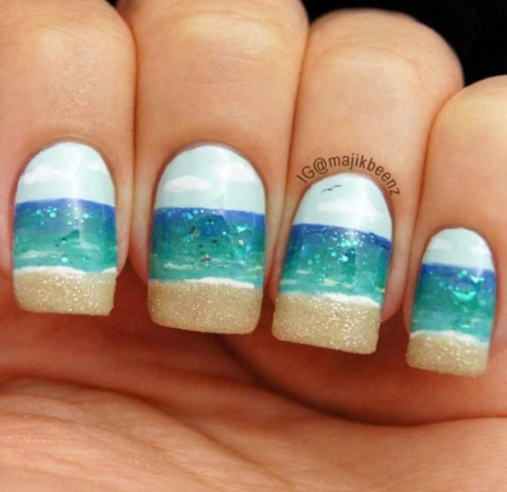 Любителям блесток и ярких переливающихся фрагментов предлагаю рассмотреть одну ослепительную задумку. Среди долгосрочных и надежных вариантов дизайна ногтей выбирают применения глиттера или слюды в качестве изображения морской пены. Эффектное сочетание с песочным орнаментом станет полноценным изображением берега моря.