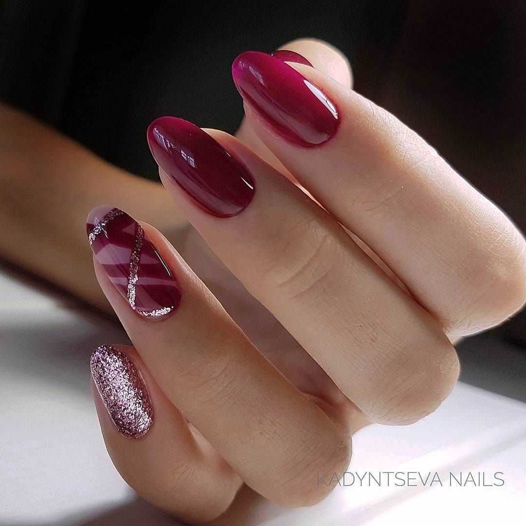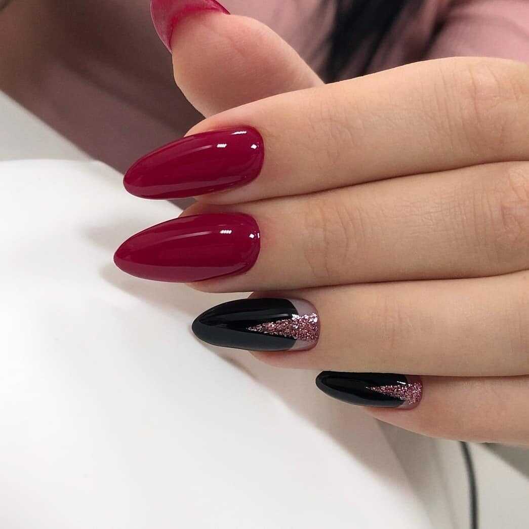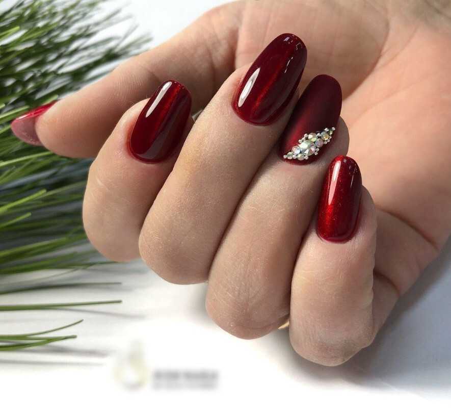 Дизайн с ромбом, выложенным стразами на большом пальце, отлично сочетается с темными тонами лака. Лунный маникюр со стразами в красном цвете — шикарный вариант для лета 2022 года. При создании темного педикюра рекомендуется использовать матовый топ, такой педикюр будет смотреться наиболее эффектно и выразительно.