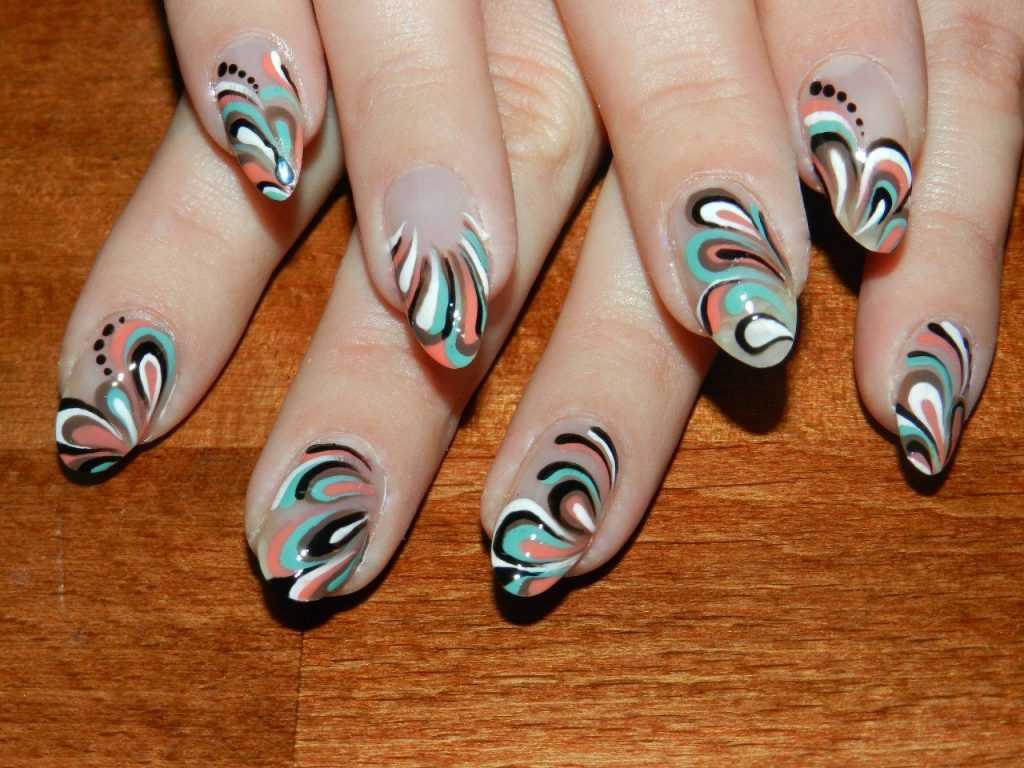 Также необычно и смело смотрится такие идеи узоров на ярких тонах покрытия.