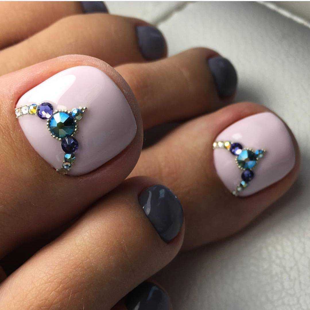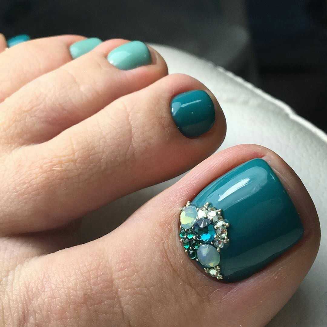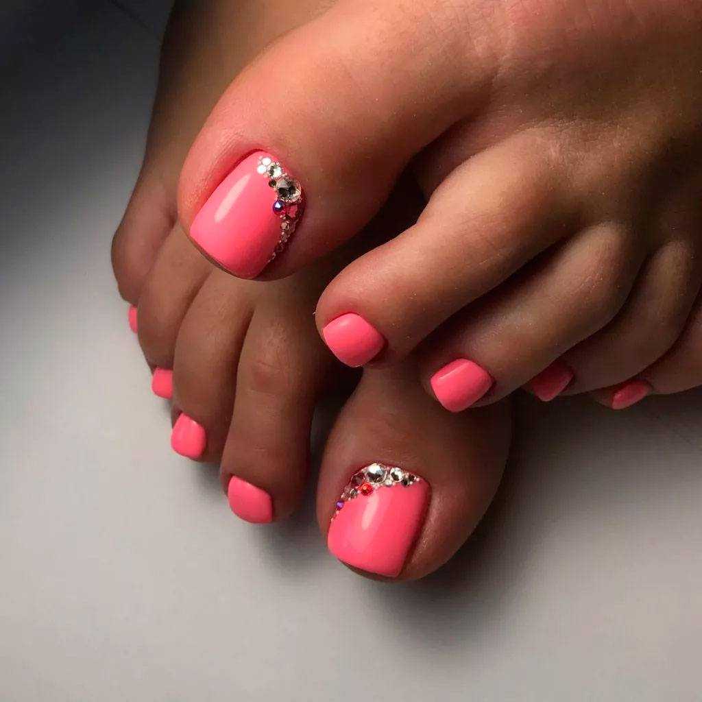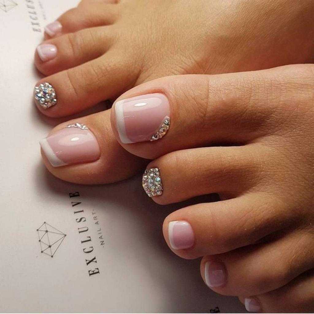 Стразы и блестки. Как и в случае с френчем, дополнительный декор чаще размещают на руках, а ножки покрывают в один тон. Но тут, конечно, дело вкуса.