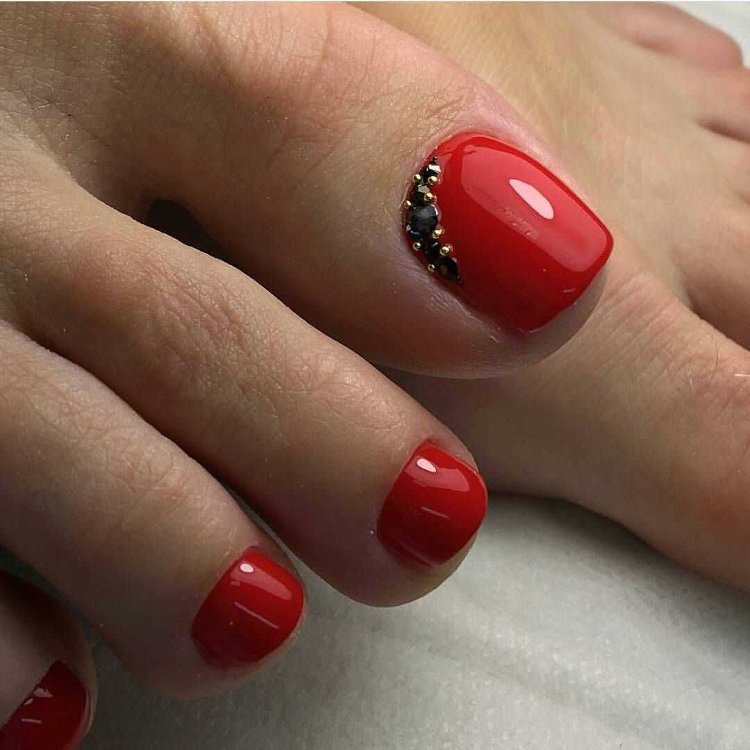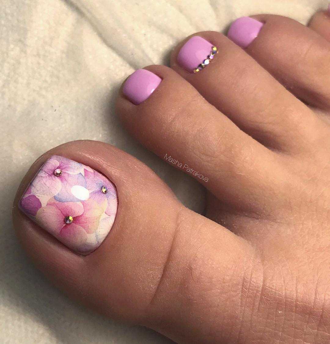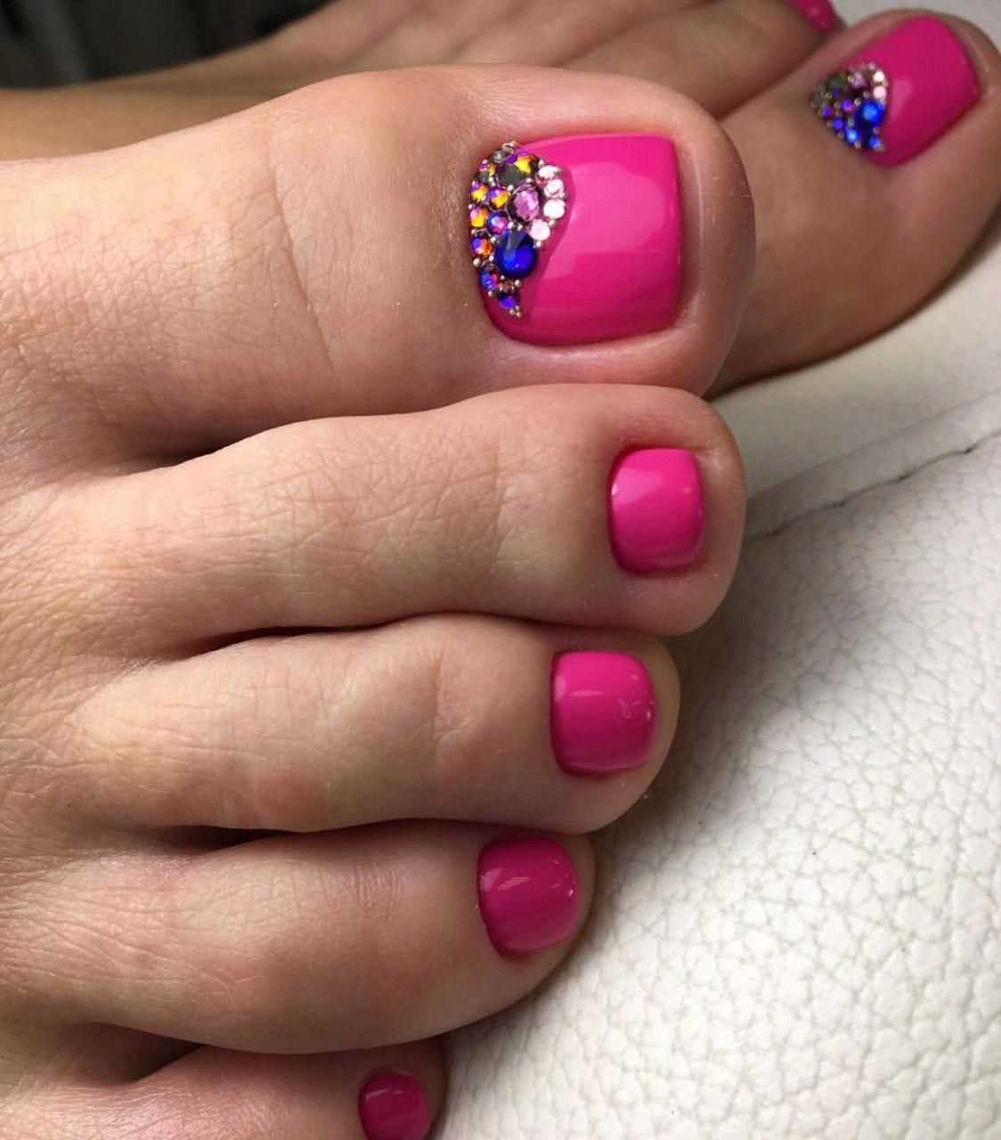 Стразы и блестки. Как и в случае с френчем, дополнительный декор чаще размещают на руках, а ножки покрывают в один тон. Но тут, конечно, дело вкуса.