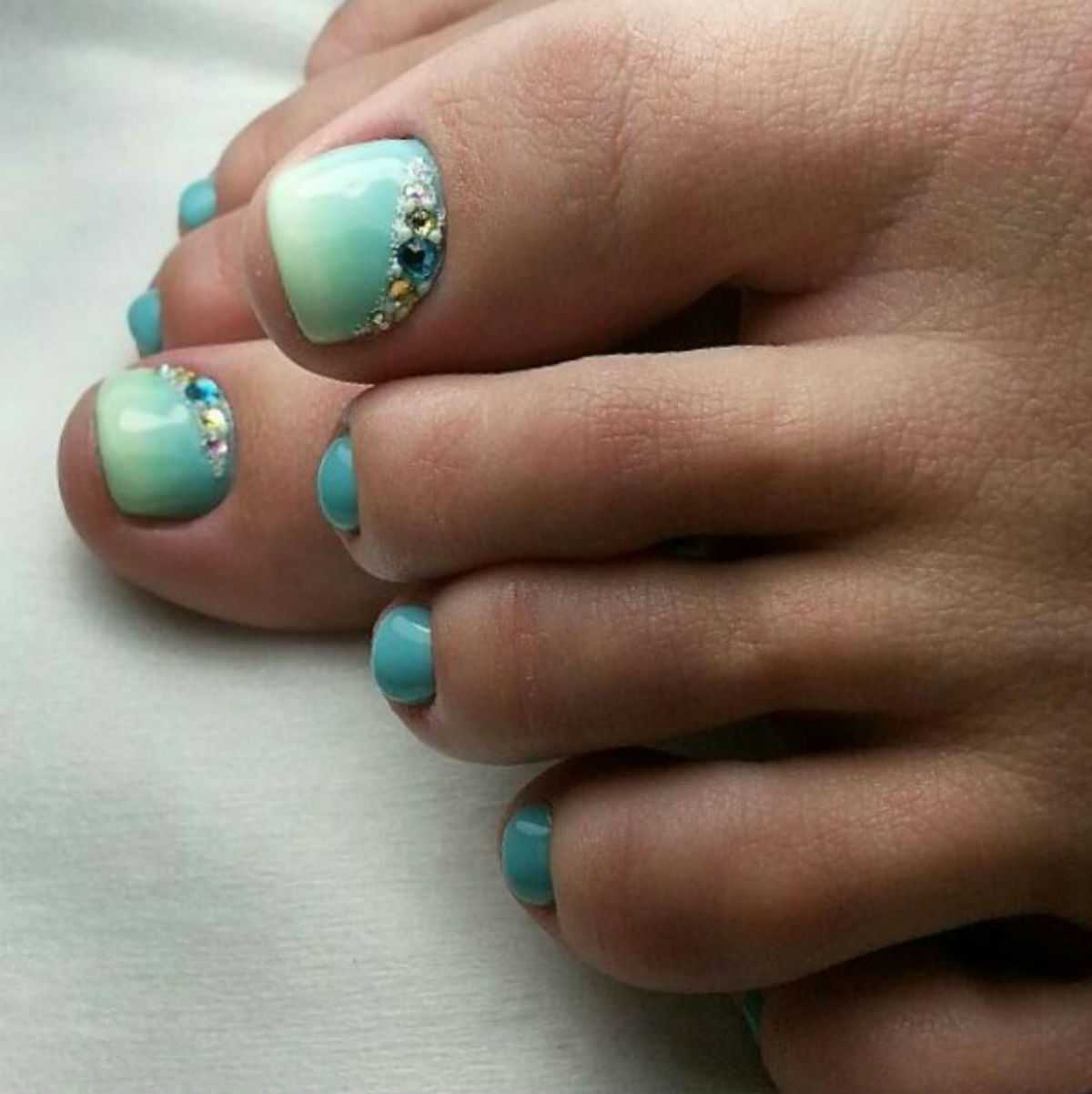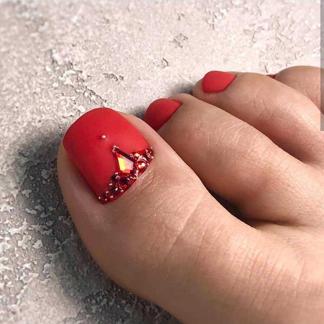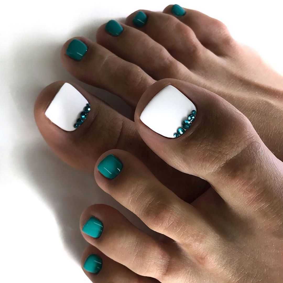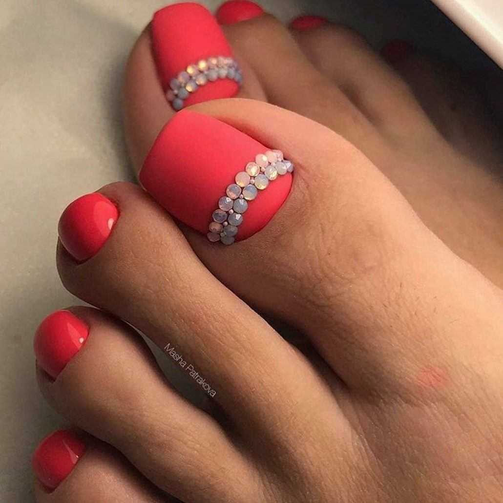 Стразы и блестки. Как и в случае с френчем, дополнительный декор чаще размещают на руках, а ножки покрывают в один тон. Но тут, конечно, дело вкуса.