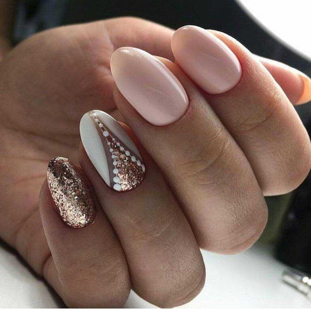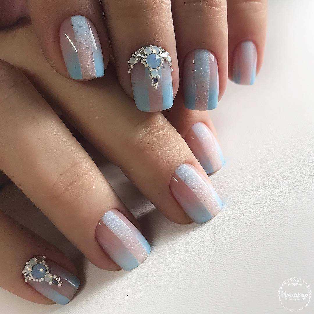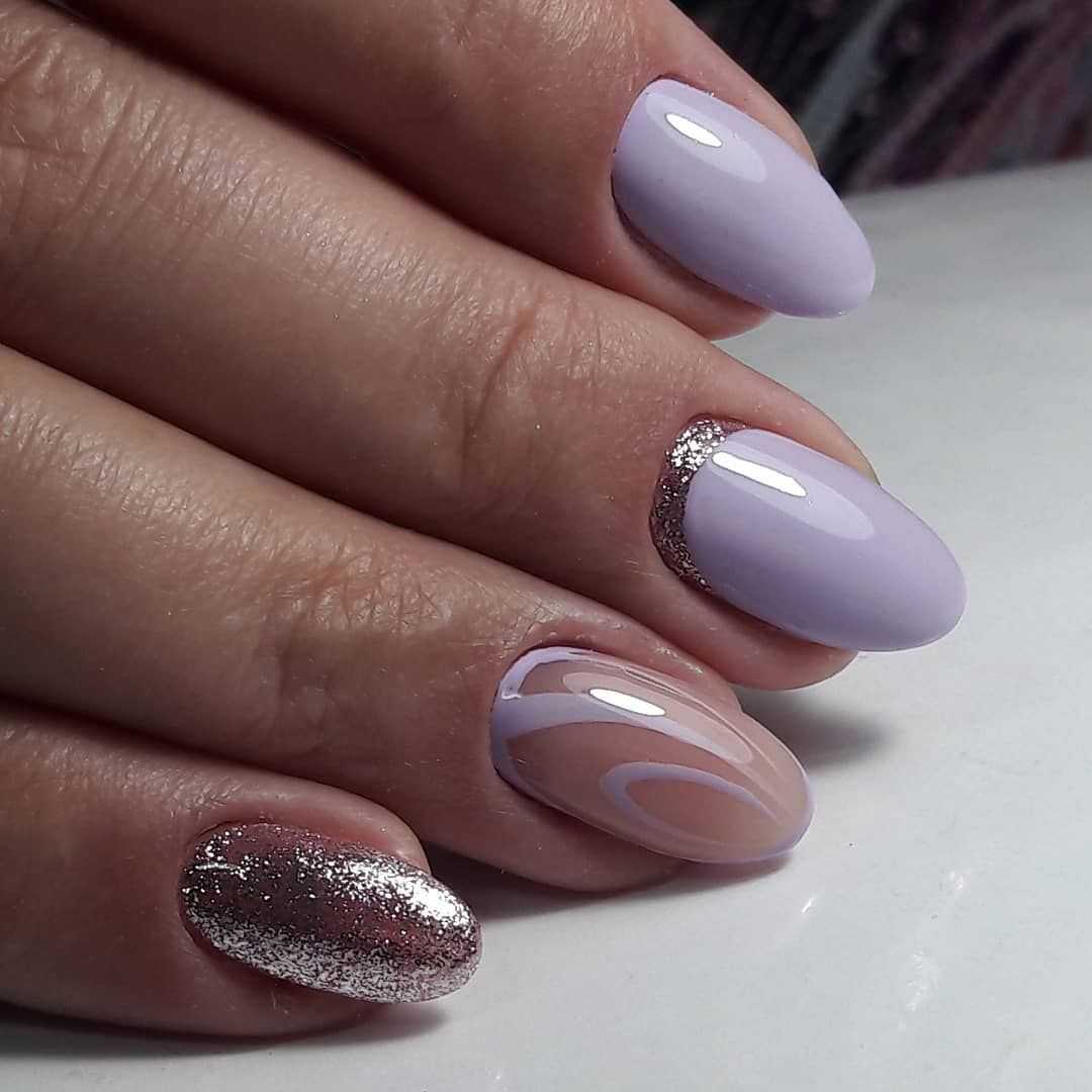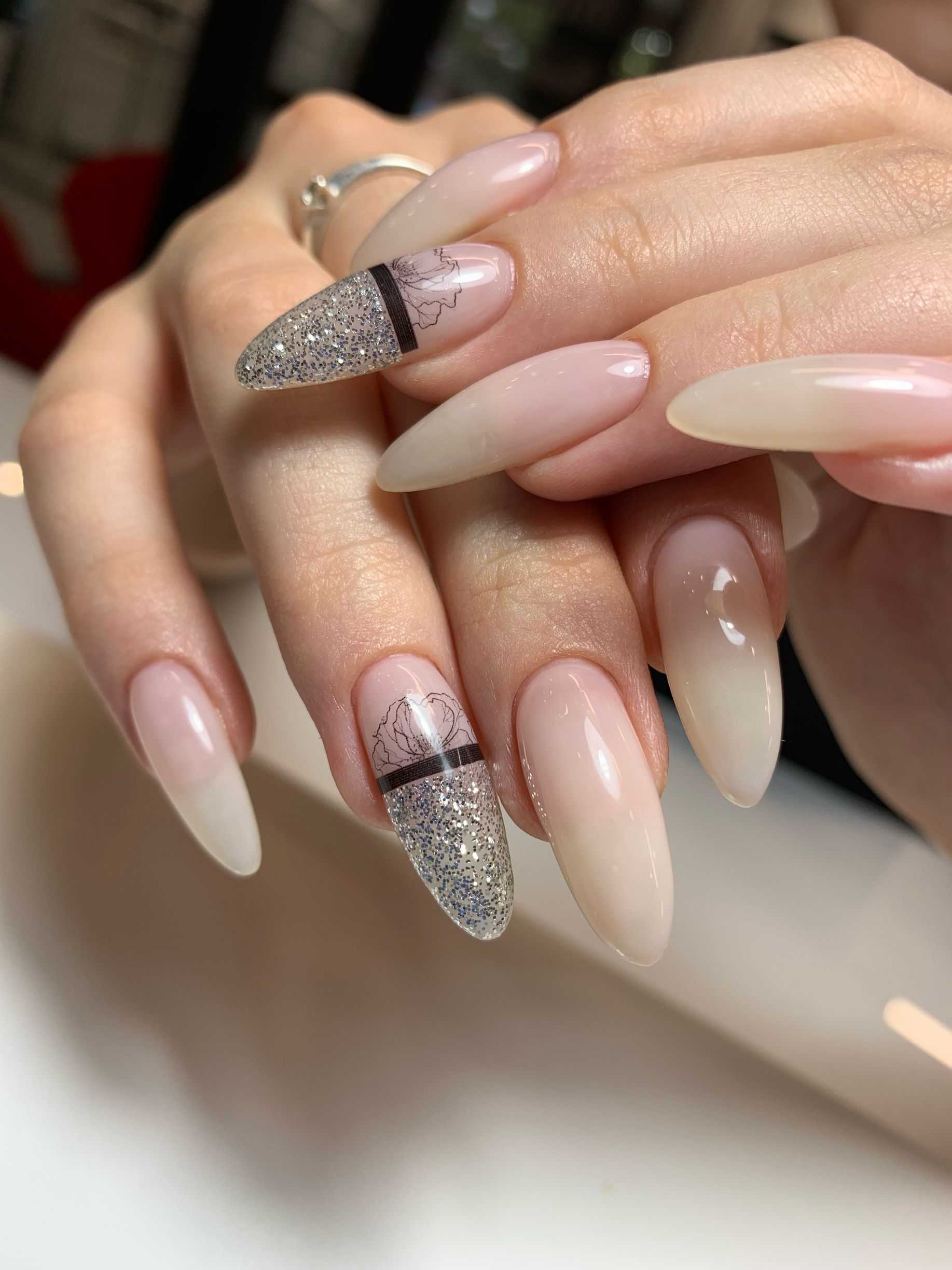 Что касается техник маникюра в этих оттенках, то стоит отдать предпочтение классике: френчу, лунному дизайну, градиенту, однотонному маникюру. Такой дизайн будет смотреться естественно и очень нежно. Дополняйте нежные оттенки серебряным или золотым глиттером, втиркой, пайетками разной формы и размера.