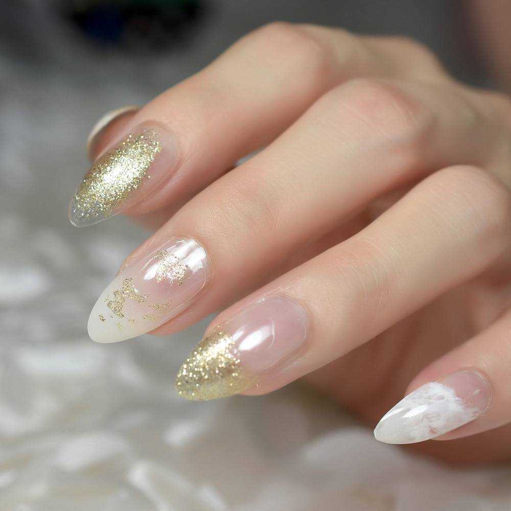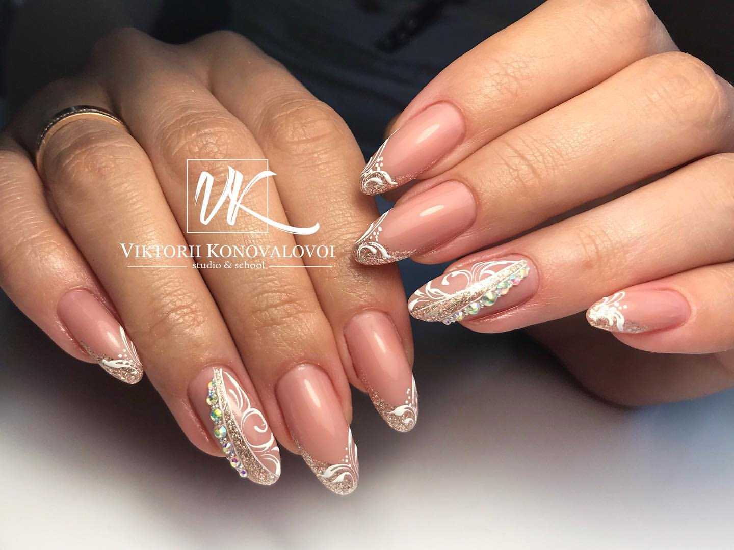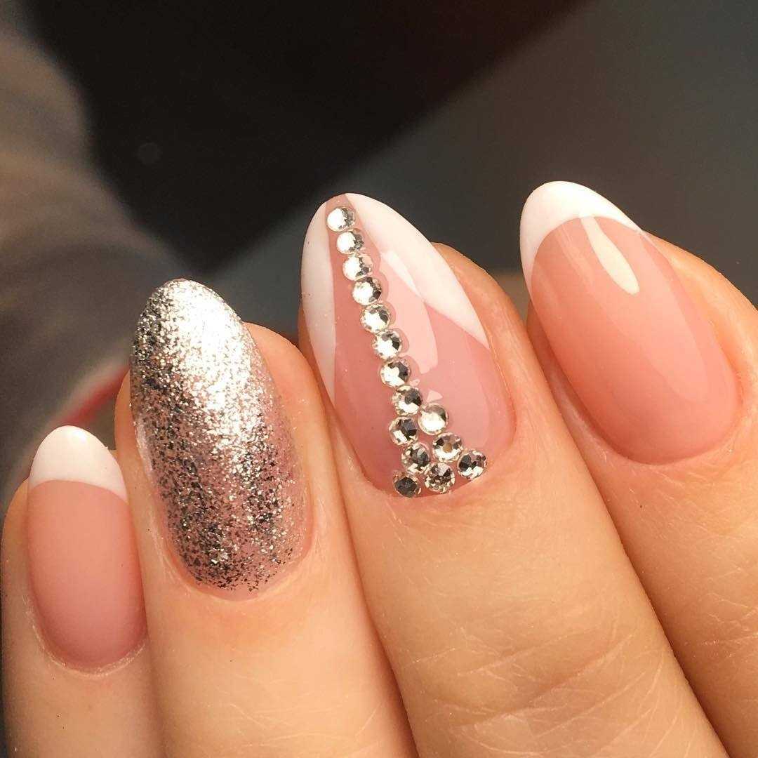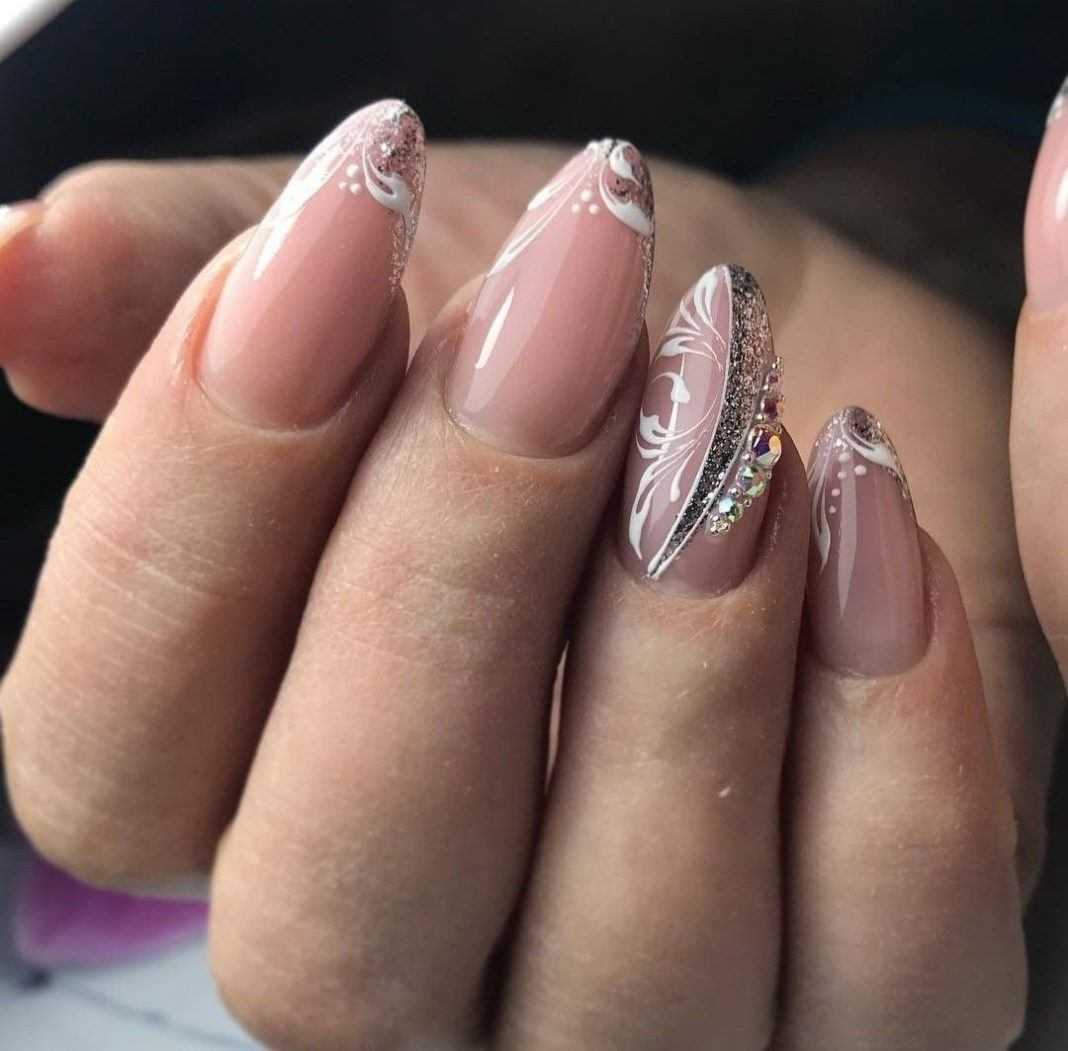 Ноготки белого цвета считаются бессменным хитом нейл-дизайна, ведь не смотря на свою простоту и лаконичность, белый лак не только шикарно смотрится на ноготках, но и считается универсальной основой для декорирования. На ногтевых пластинах миндалевидной формы белый маникюр смотрится особенно красиво и предлагает модницам массу идей дизайна с использованием блёсток, которые идеально впишутся как в повседневный, так и праздничный образ. Особенно привлекают такие решения барышень, собирающихся под венец. Модный миндалевидный маникюр с белым лаком и блёстками — это в первую очередь однотонный нейл-арт с блестящим акцентом на паре ноготков и классических френч с блестящей прорисовкой улыбки. А также различные полоски, рисунки и композиции из мелких блестящих частиц, бусин и камней. Главное – не увлекаться количеством элементов декора. Минимализм в этом случае считается залогом успешного нейл-арта.