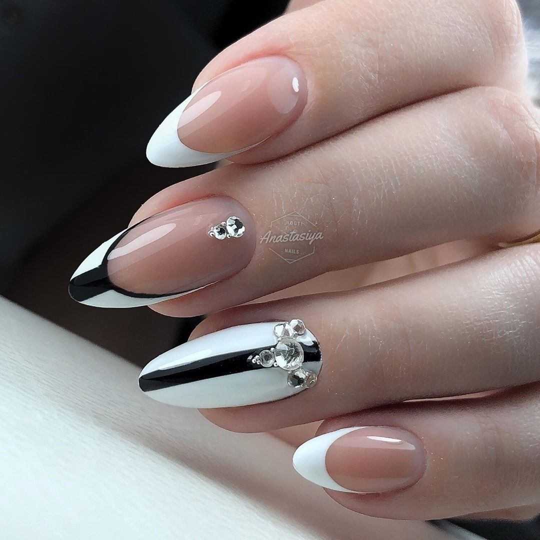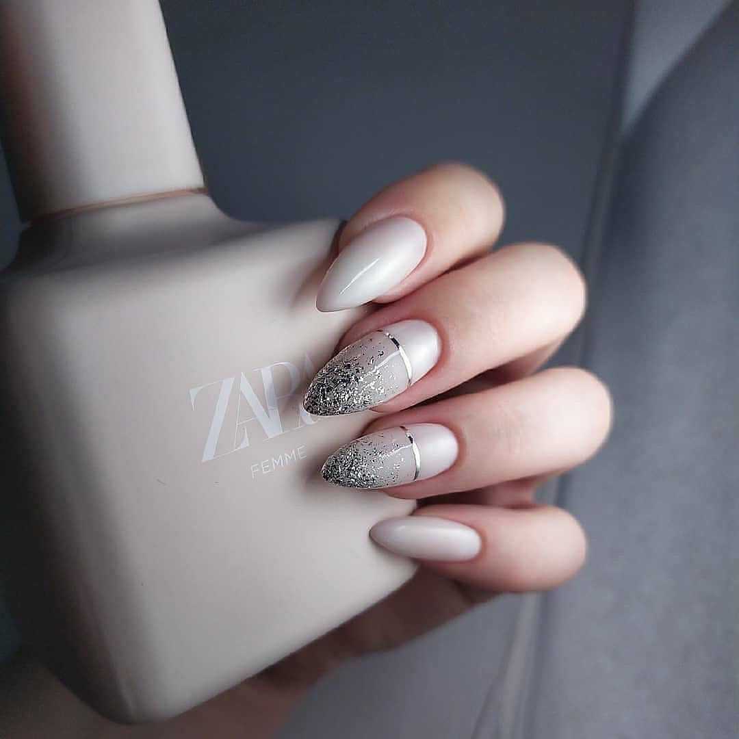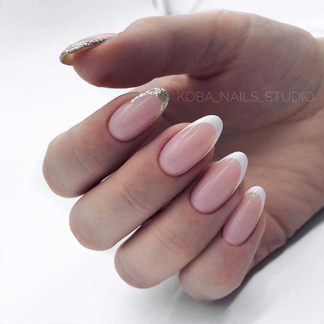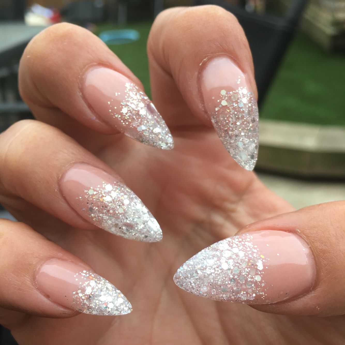 Ноготки белого цвета считаются бессменным хитом нейл-дизайна, ведь не смотря на свою простоту и лаконичность, белый лак не только шикарно смотрится на ноготках, но и считается универсальной основой для декорирования. На ногтевых пластинах миндалевидной формы белый маникюр смотрится особенно красиво и предлагает модницам массу идей дизайна с использованием блёсток, которые идеально впишутся как в повседневный, так и праздничный образ. Особенно привлекают такие решения барышень, собирающихся под венец. Модный миндалевидный маникюр с белым лаком и блёстками — это в первую очередь однотонный нейл-арт с блестящим акцентом на паре ноготков и классических френч с блестящей прорисовкой улыбки. А также различные полоски, рисунки и композиции из мелких блестящих частиц, бусин и камней. Главное – не увлекаться количеством элементов декора. Минимализм в этом случае считается залогом успешного нейл-арта.