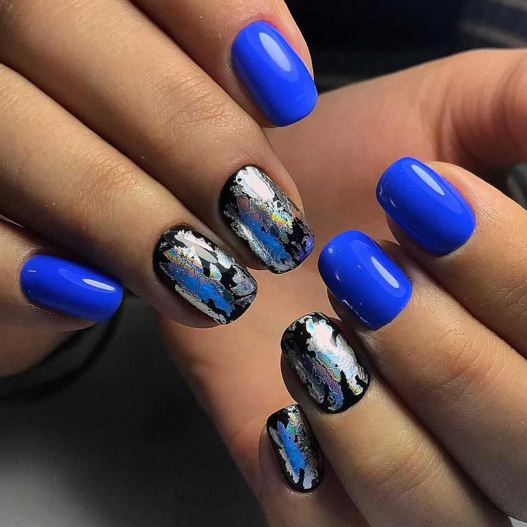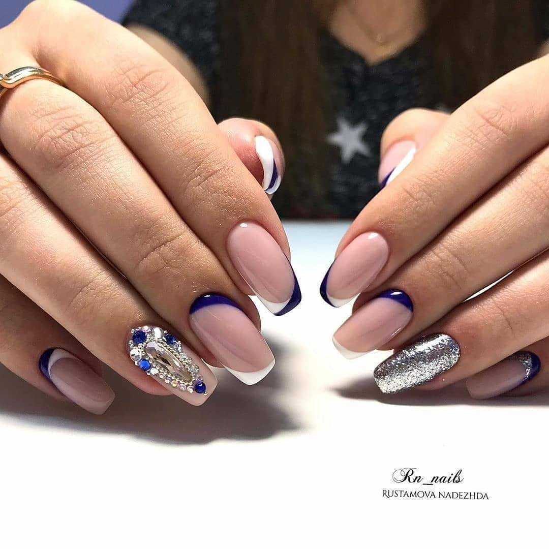 Как мы уже говорили, ноготки синего цвета сами по себе представляют собой нечто особенное. А маникюр в таком исполнении с дополнениями в виде блёсток достоин самой королевы. В списке модных тенденций великолепные идеи матового и глянцевого нейл-дизайна, изумительные вариации френча, маникюр с флористическим дизайном и геометрией, который чудесно смотрится даже на коротких ногтевых пластинах, а также однотонный нейл-арт и оригинальные идеи сочетания синей палитры с другими оттенками. Блёстки во всех этих примерах только подчёркивают грациозность синего цвета и характер выбранной техники.