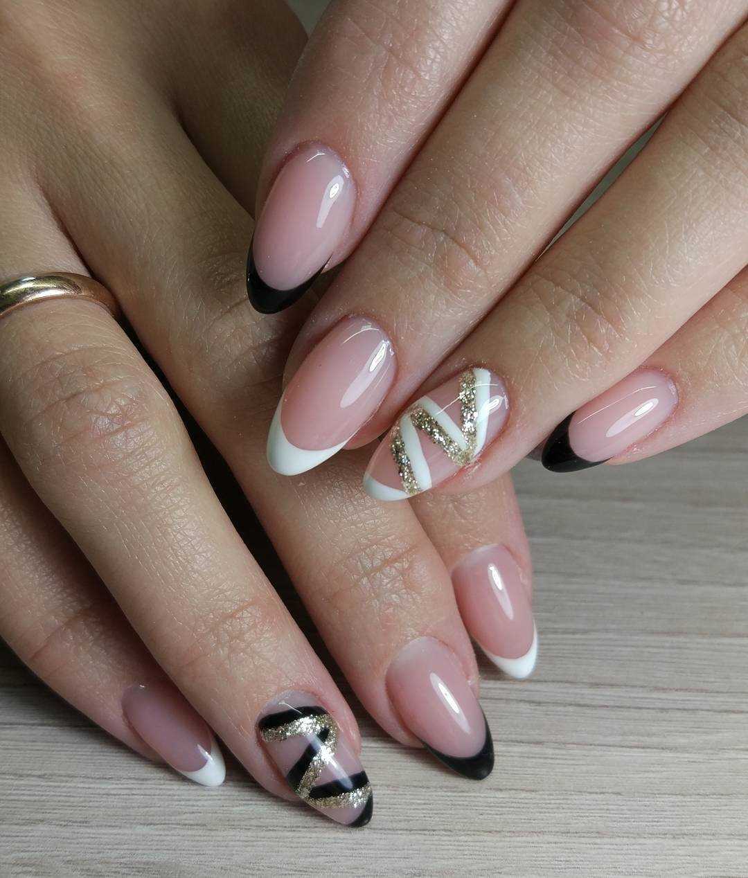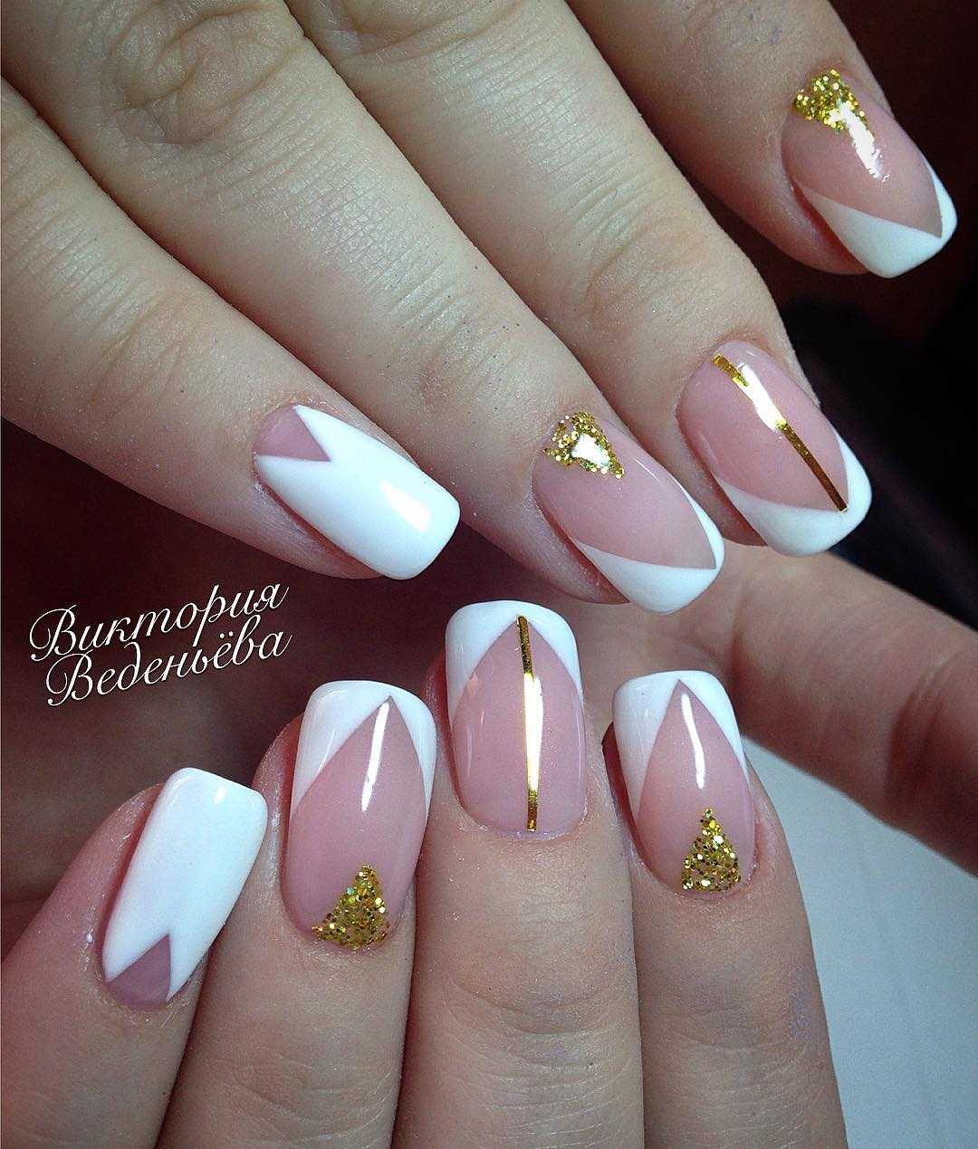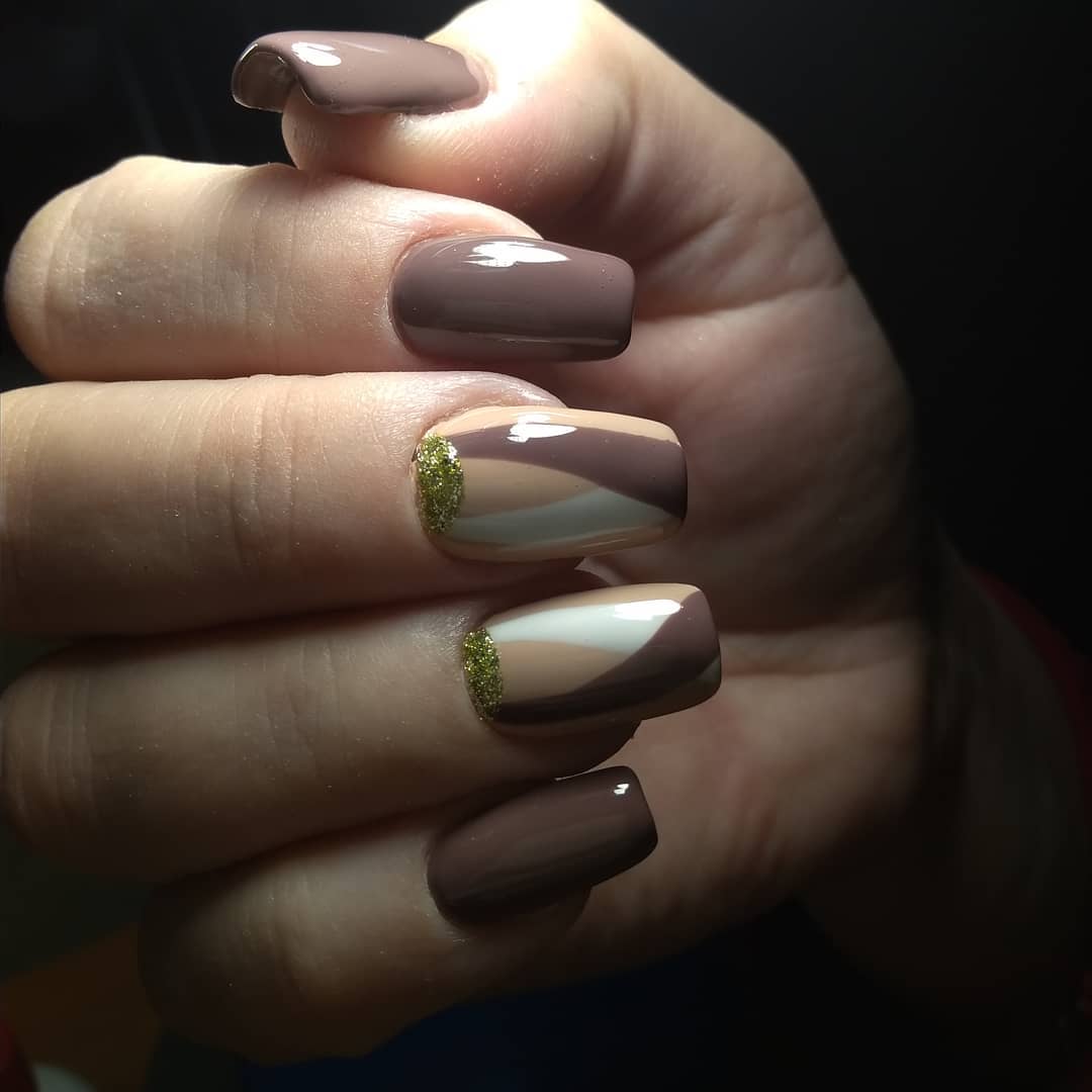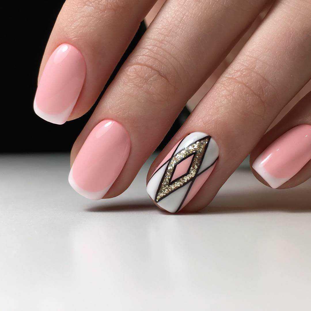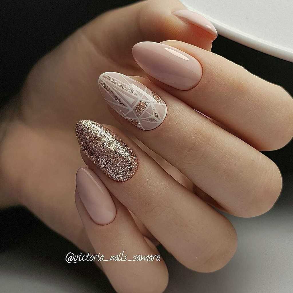 Маникюр с геометрическим рисунком – тренд 2021 года. Его выбирают уверенные в себе модницы, которые предпочитают строгие линии во всем. Однако блестки добавляют ему яркости и шика. В основном это золотистые и серебристые детали.