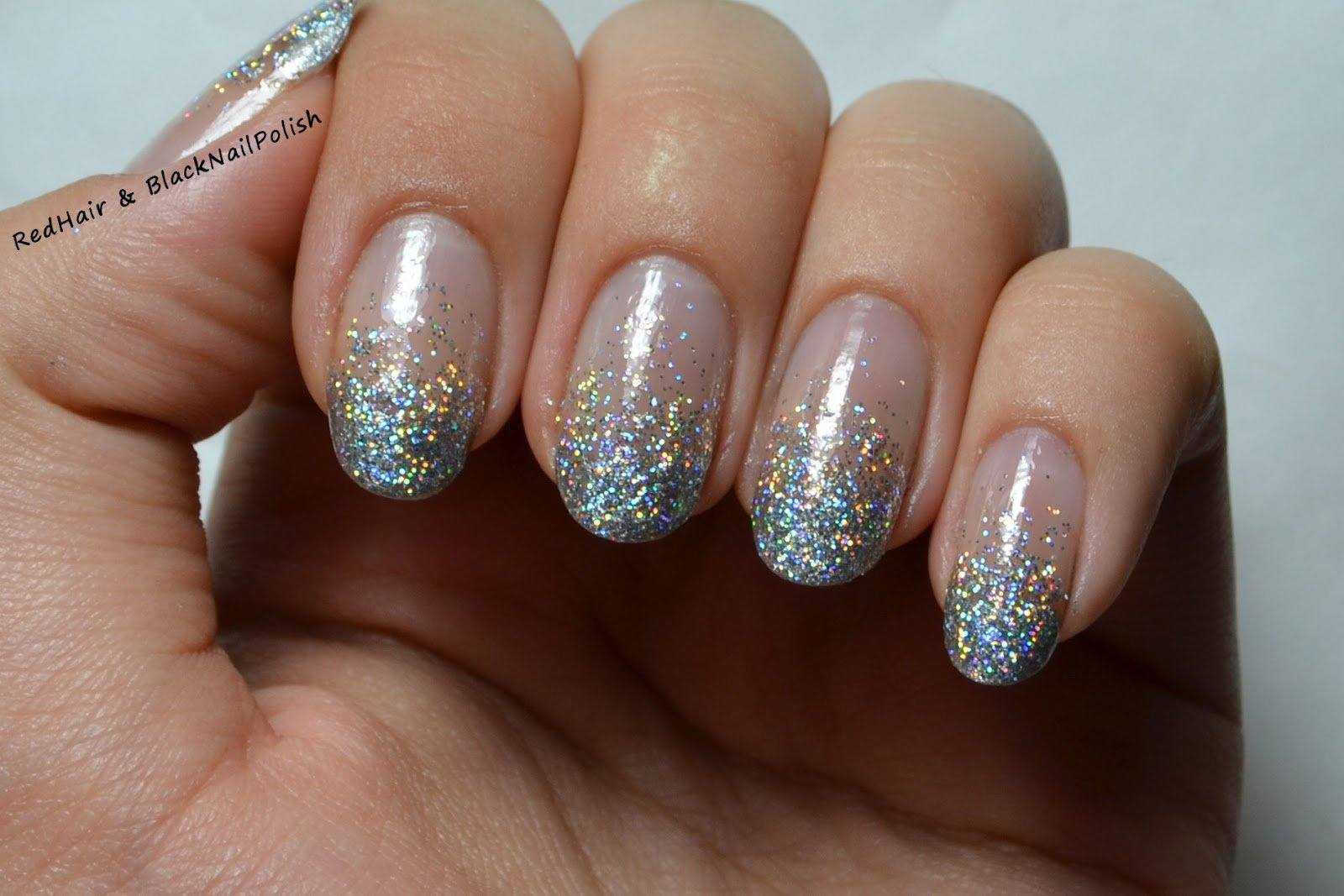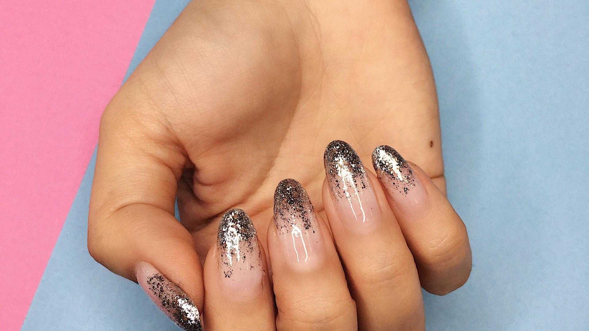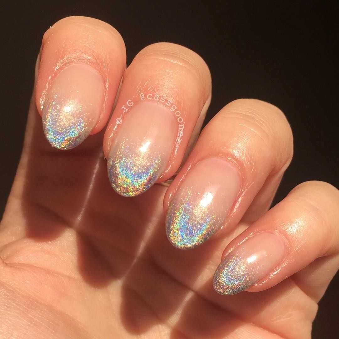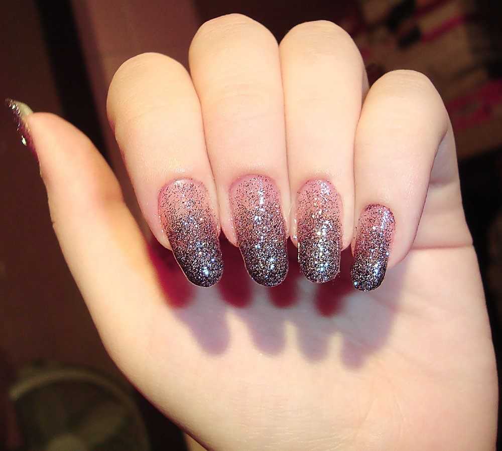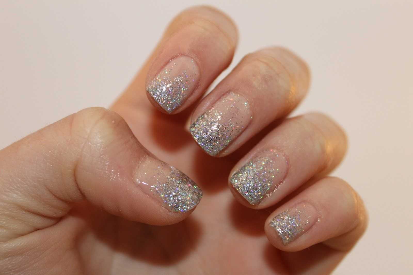 Для дизайна можно использовать сухие блестки, гель-лаки с глиттером и шиммером. Профессиональные нейл-мастера просто посыпают ногти сухими блестками и при необходимости распределяют их по ногтевой пластине маникюрной кистью. При создании маникюра в домашних условиях воспользуйтесь губкой или спонжем, на который нанесен гель-лак с шиммером. Это поможет создать плавный переход от блестящего декора к основному оттенку гель-лака.
