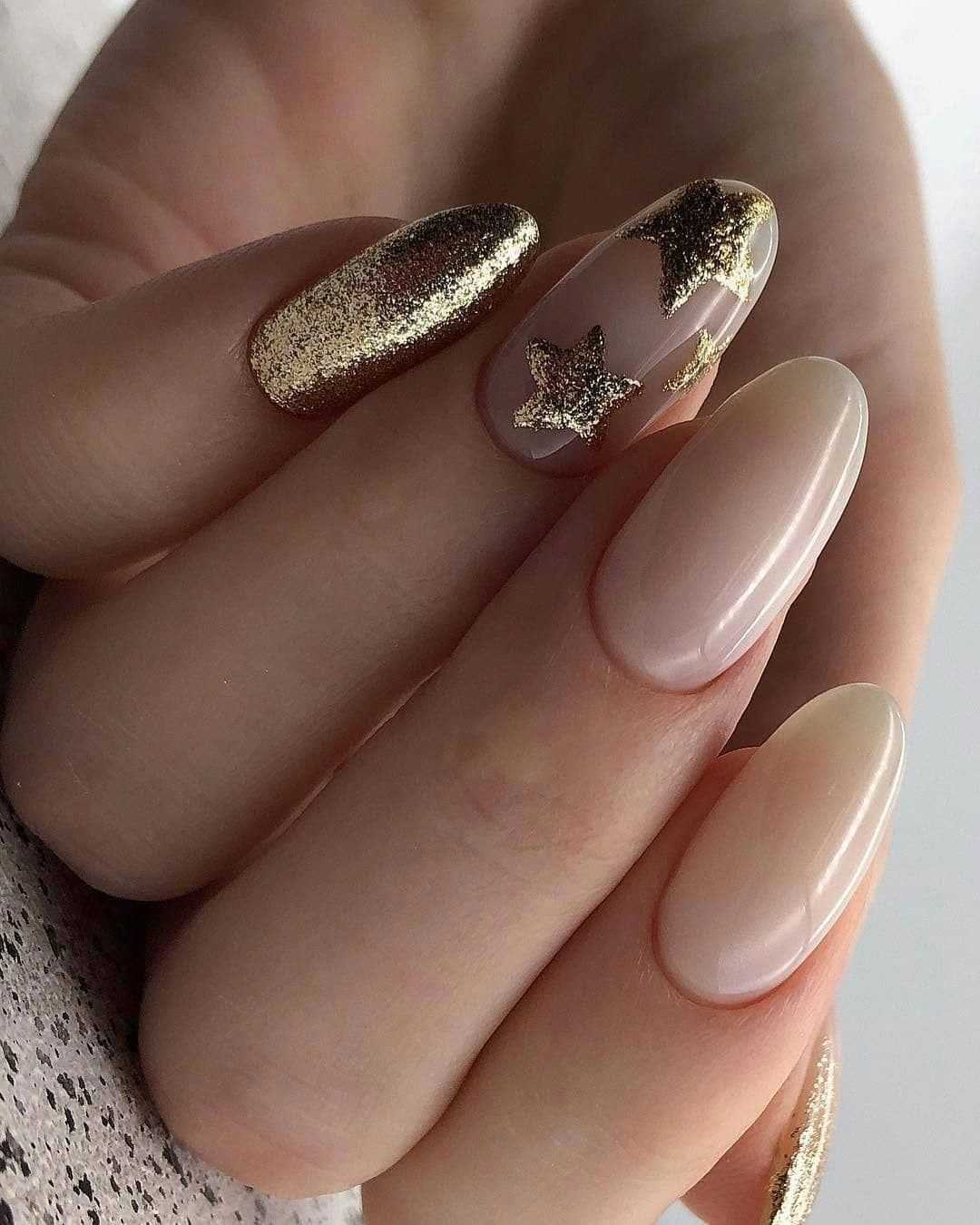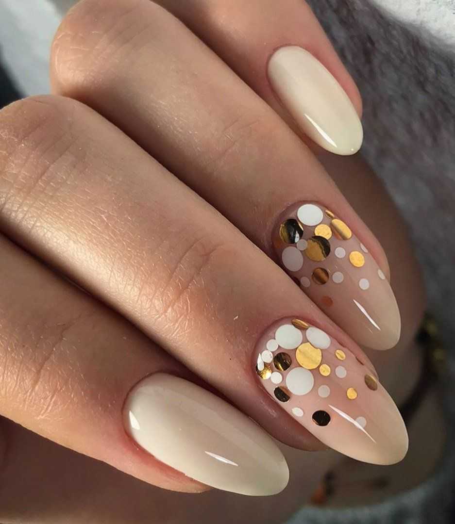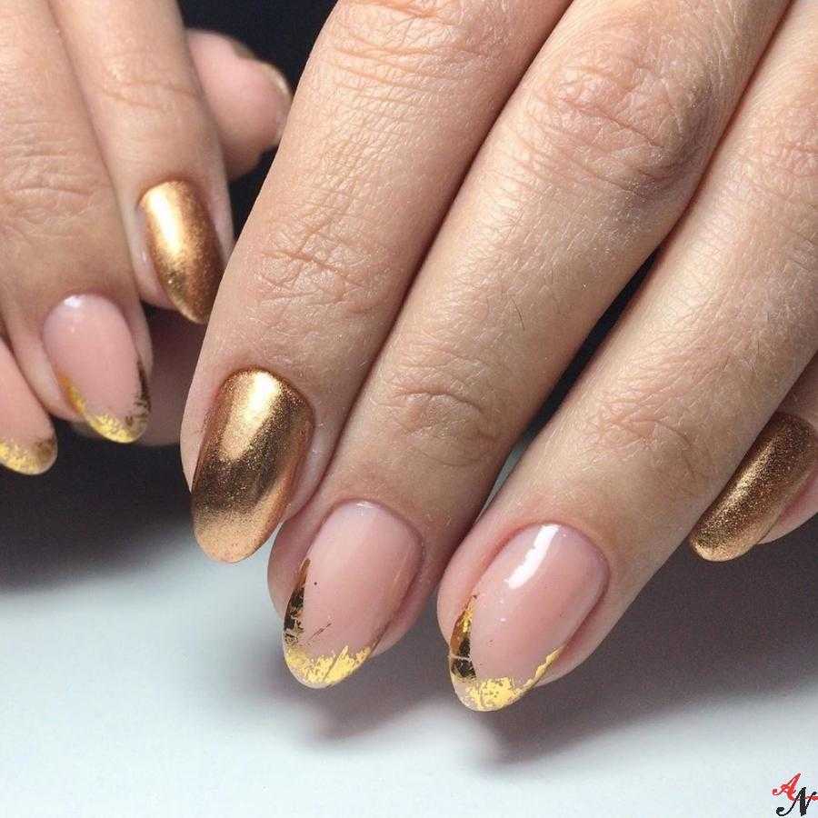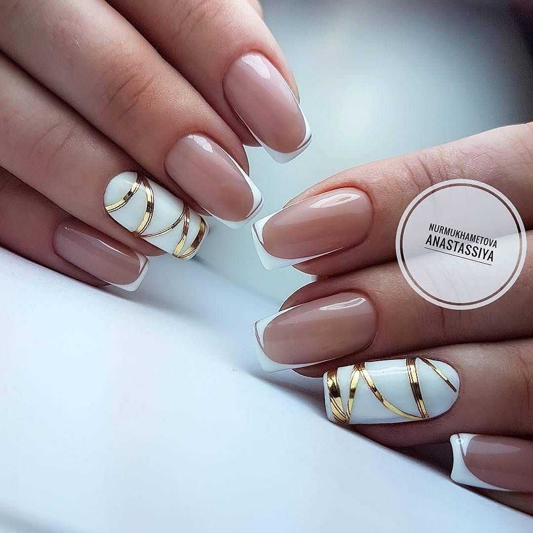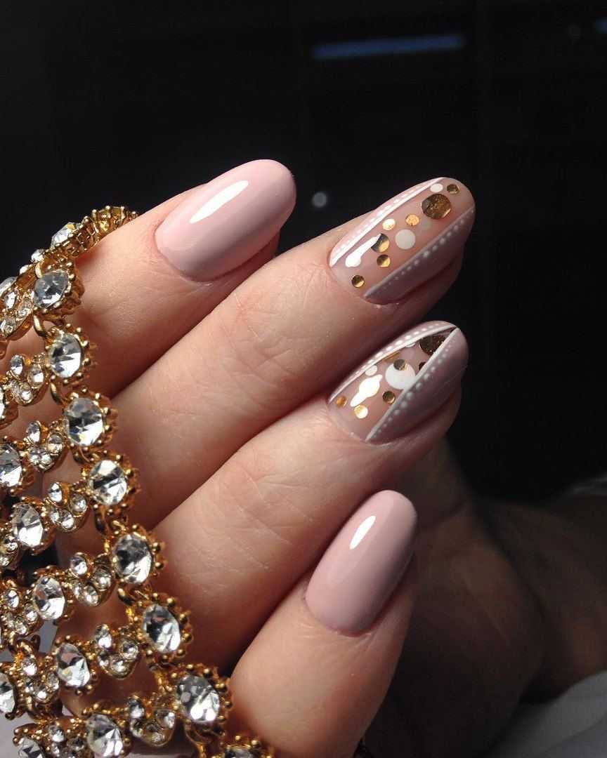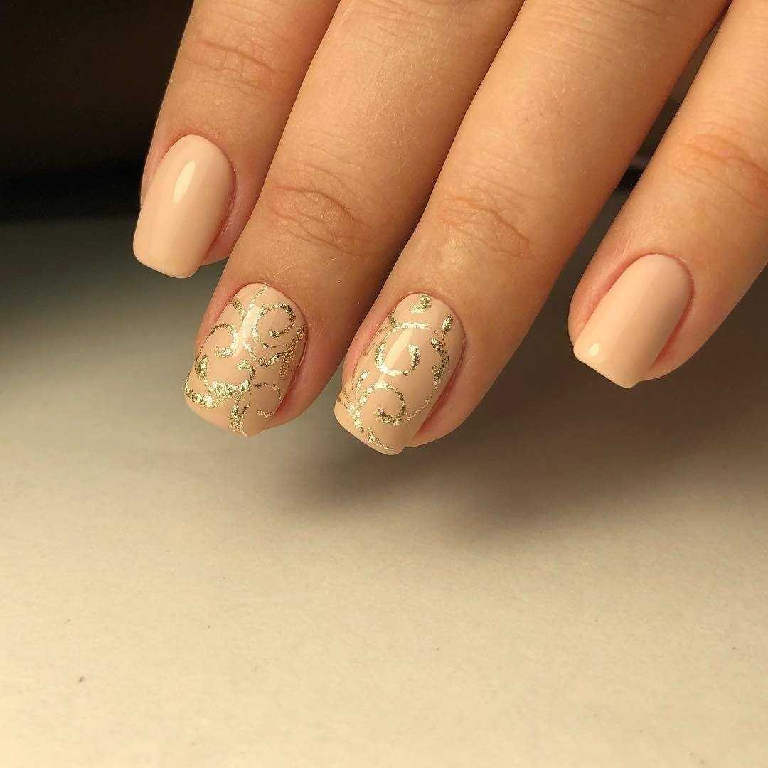 Нюдовые оттенки великолепно сочетаются с золотым декором. При этом маникюр не будет выглядеть слишком заметно и вызывающе. Все дело в схожей цветовой палитре, что позволяет создать удивительно красивые и визуально нежные нейл-арты.
