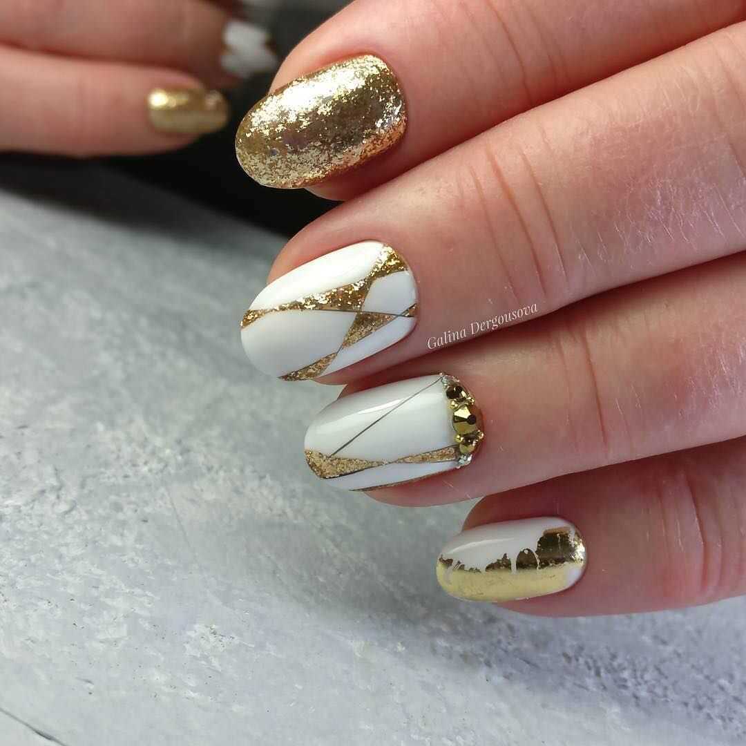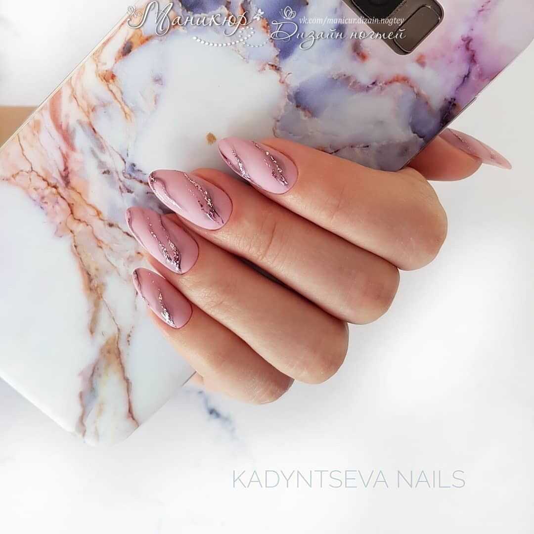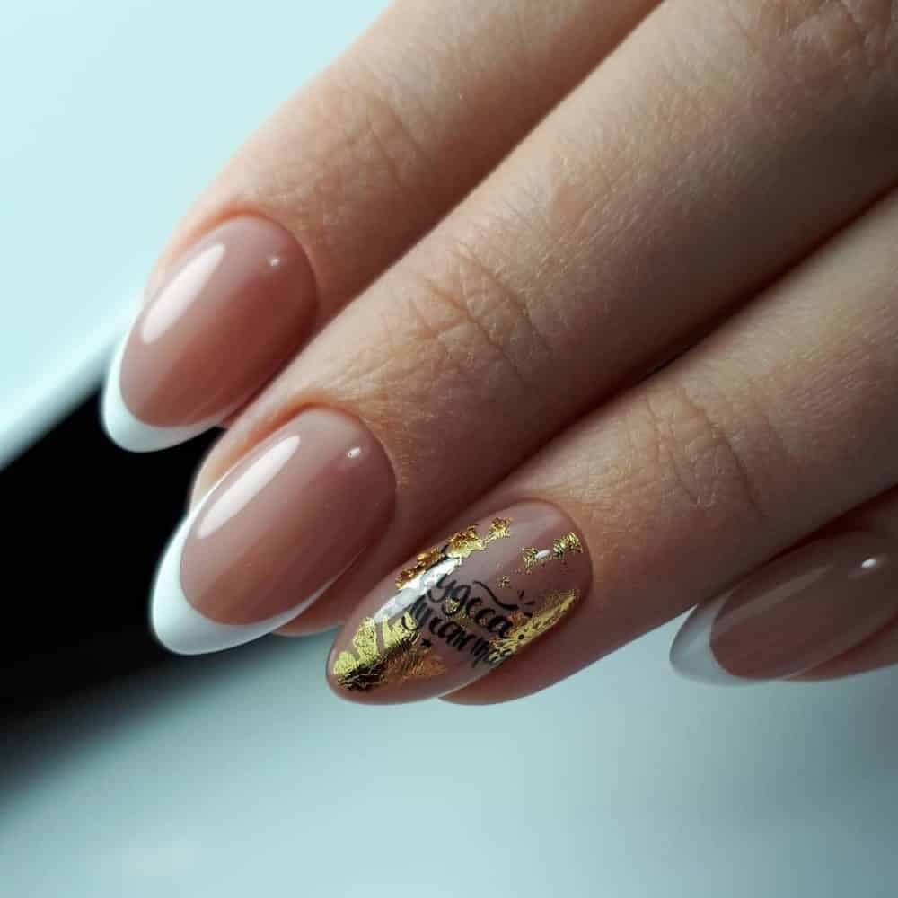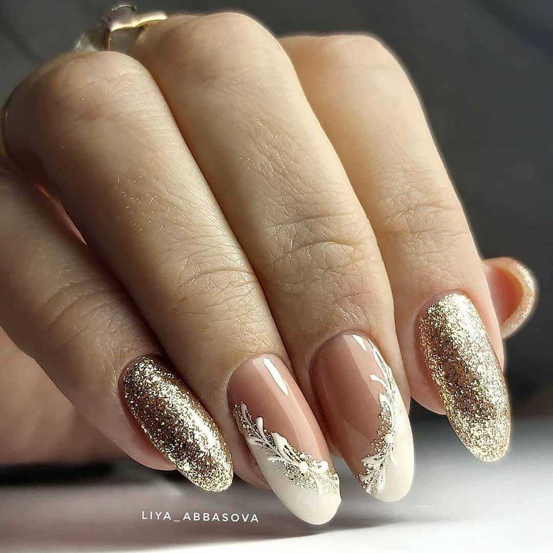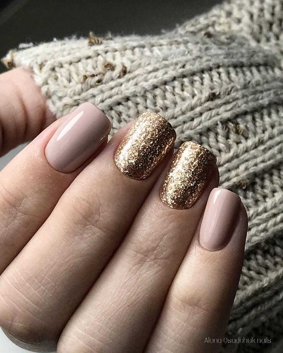 Нюдовые оттенки великолепно сочетаются с золотым декором. При этом маникюр не будет выглядеть слишком заметно и вызывающе. Все дело в схожей цветовой палитре, что позволяет создать удивительно красивые и визуально нежные нейл-арты.