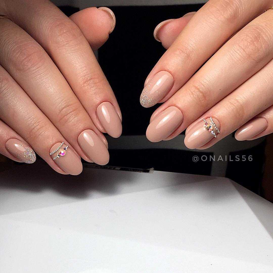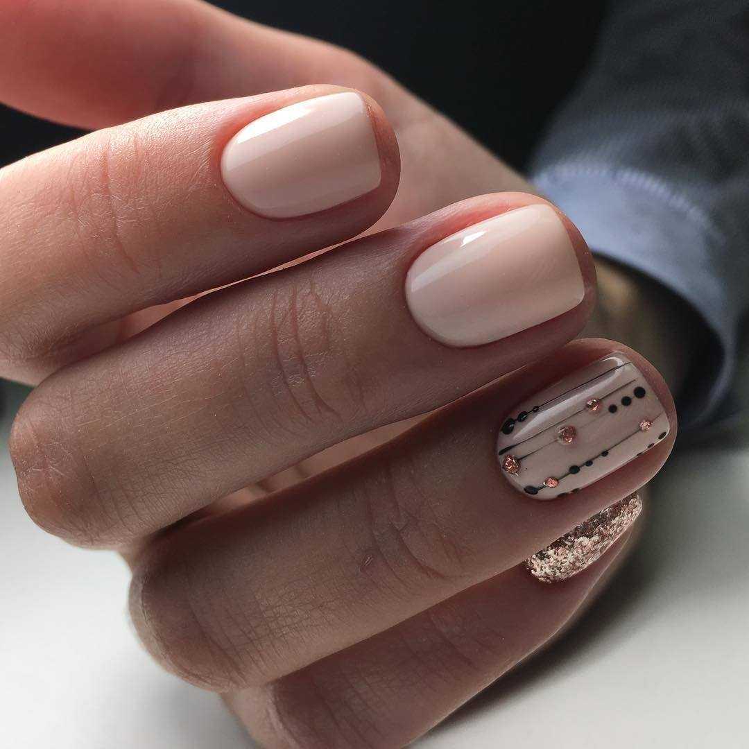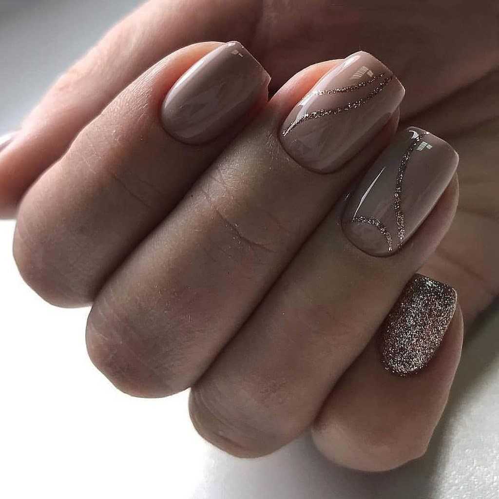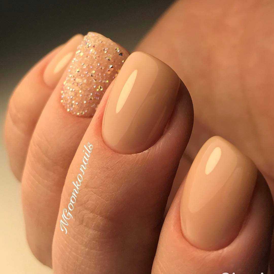 На нюдовом фоне красиво выглядит растяжка блестками, дизайн с геометрией, флористикой. Под блестящий декор обычно выделяется 1-2 ноготка, остальные же покрываются однотонным нюдовым оттенком. В однотонном исполнении красиво выглядит кофейный, серый, бежевый, молочный цвета. При этом можно без опасений использовать золотой глиттер. В сочетании с нюдовыми тонами он будет смотреться сдержаннее и мягче.