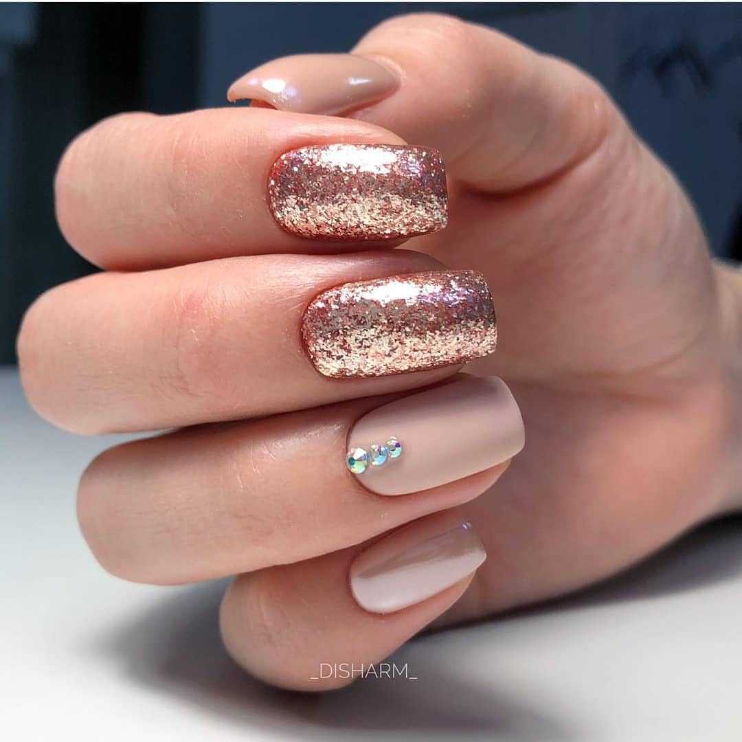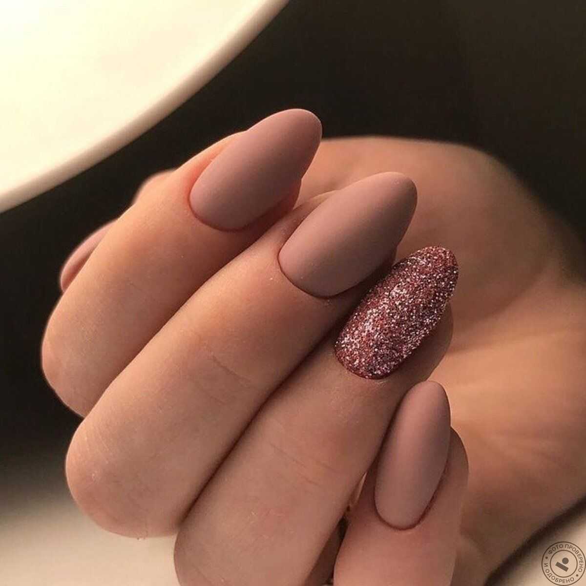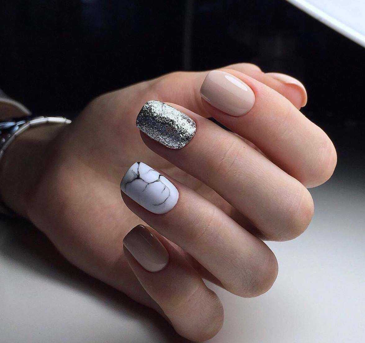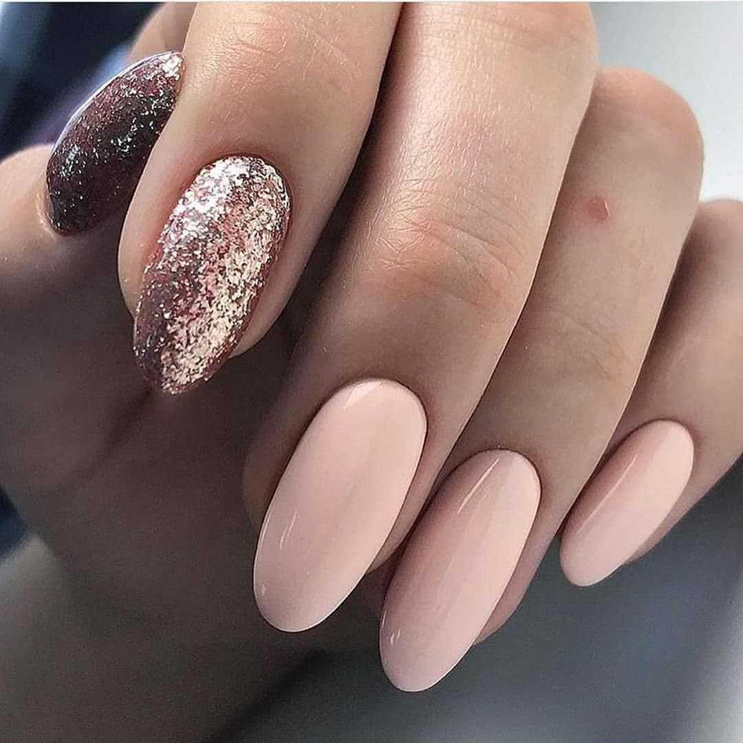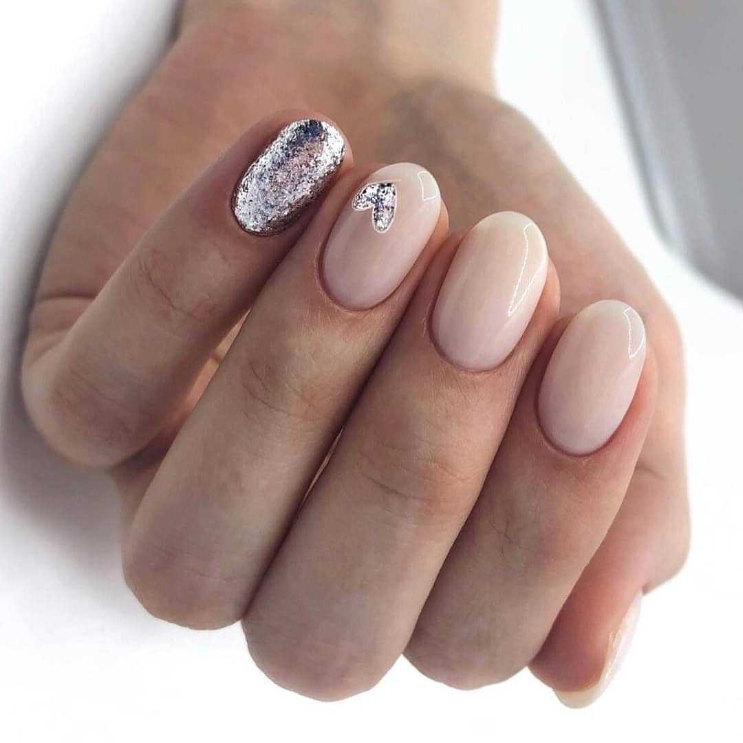 На нюдовом фоне красиво выглядит растяжка блестками, дизайн с геометрией, флористикой. Под блестящий декор обычно выделяется 1-2 ноготка, остальные же покрываются однотонным нюдовым оттенком. В однотонном исполнении красиво выглядит кофейный, серый, бежевый, молочный цвета. При этом можно без опасений использовать золотой глиттер. В сочетании с нюдовыми тонами он будет смотреться сдержаннее и мягче.