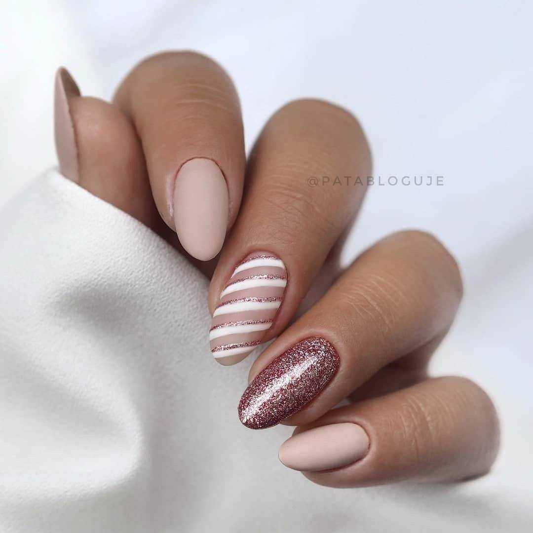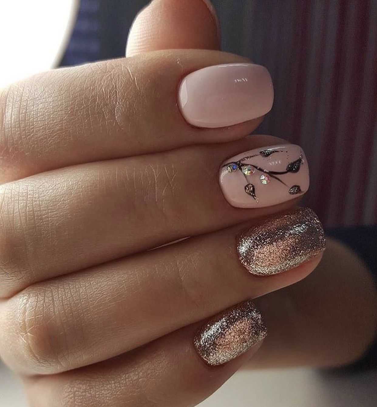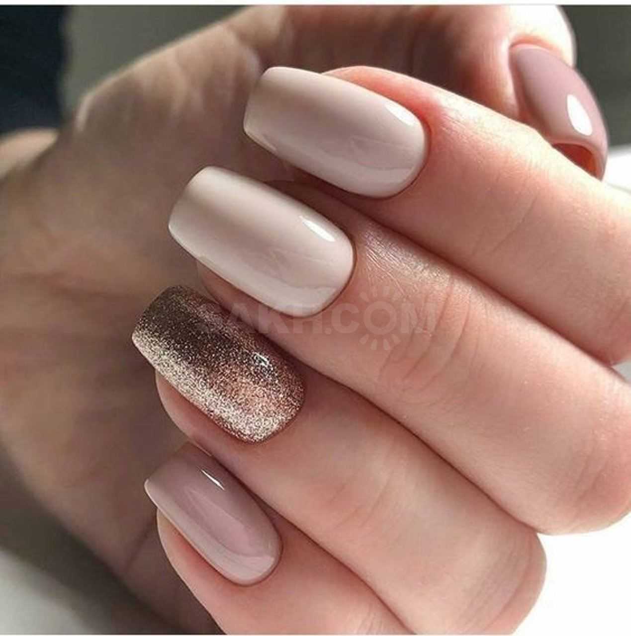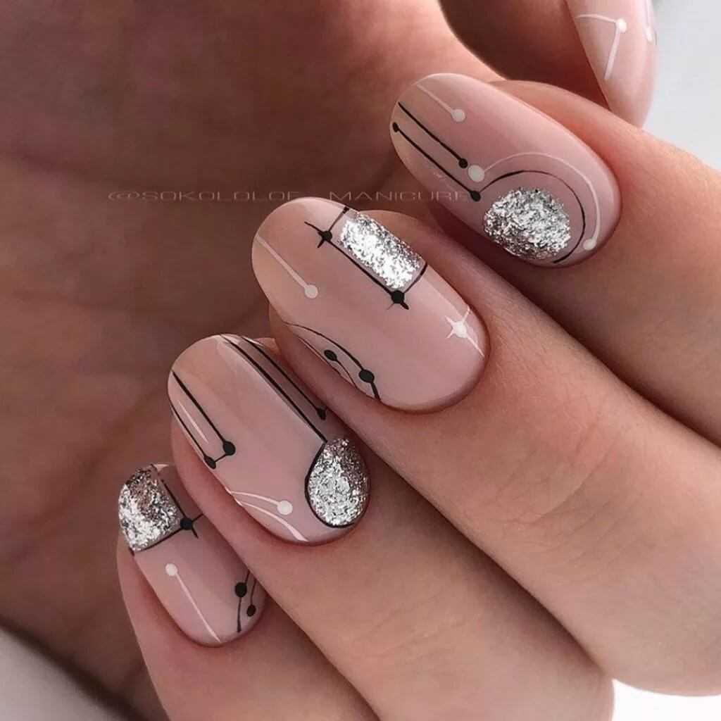 На нюдовом фоне красиво выглядит растяжка блестками, дизайн с геометрией, флористикой. Под блестящий декор обычно выделяется 1-2 ноготка, остальные же покрываются однотонным нюдовым оттенком. В однотонном исполнении красиво выглядит кофейный, серый, бежевый, молочный цвета. При этом можно без опасений использовать золотой глиттер. В сочетании с нюдовыми тонами он будет смотреться сдержаннее и мягче.