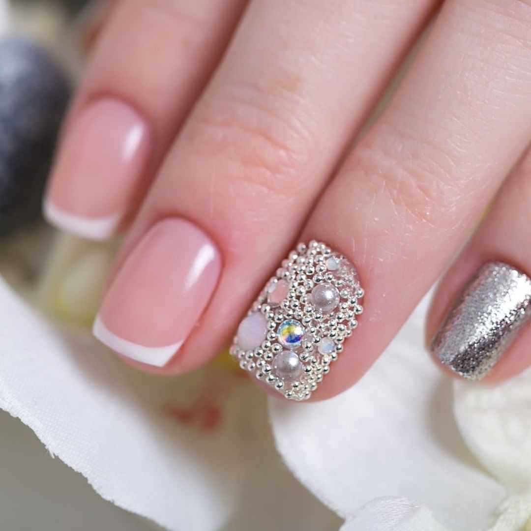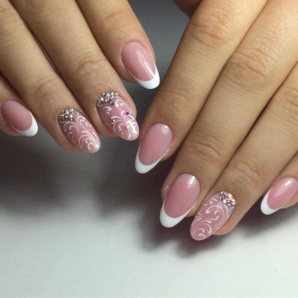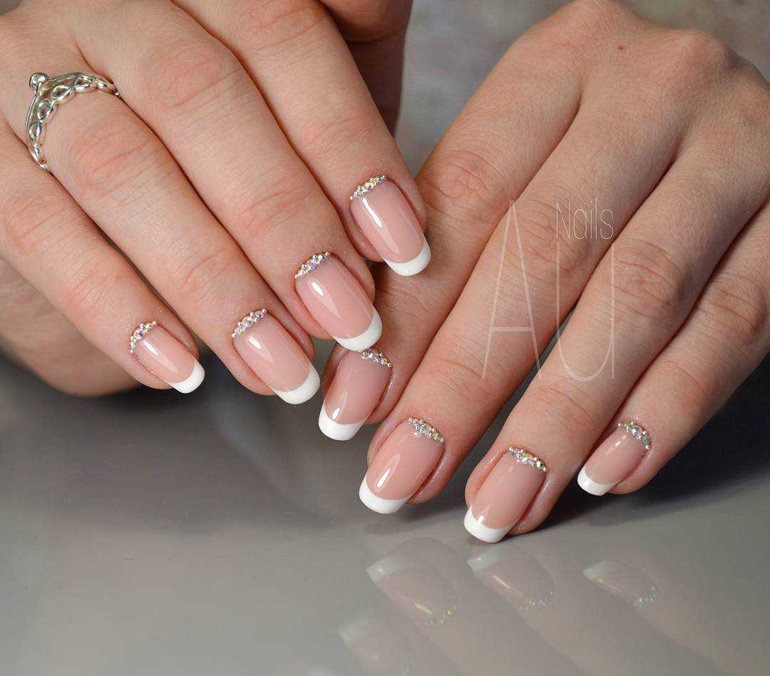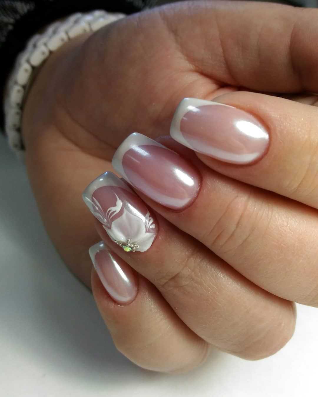 Великолепно смотрится градиентный бело-розовый маникюр, в котором один из ноготков выделен глиттером, мелкими прозрачными бульонками и стразами. Присмотритесь к классическому французскому маникюру, в создании которого как раз участвуют эти оттенки. Блестки при этом можно использовать для выделения края ногтя или отвести под блестящий декор какой-нибудь из ноготков.