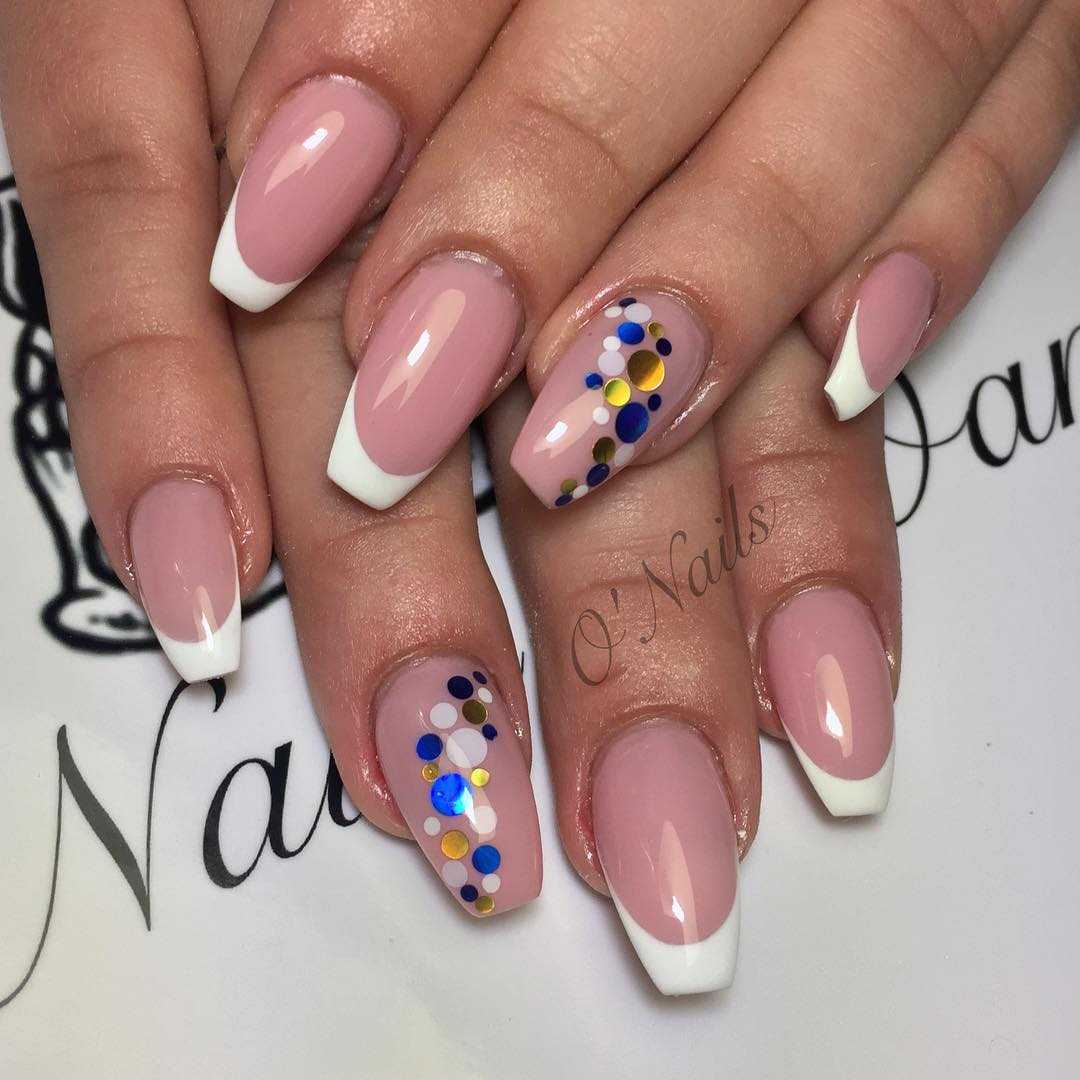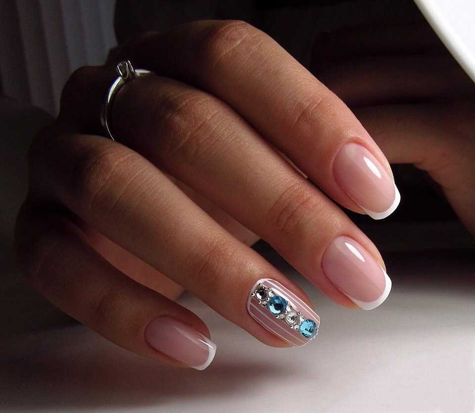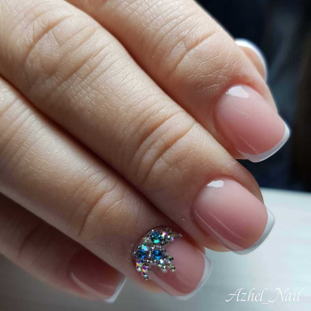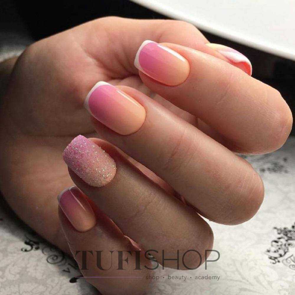 Великолепно смотрится градиентный бело-розовый маникюр, в котором один из ноготков выделен глиттером, мелкими прозрачными бульонками и стразами. Присмотритесь к классическому французскому маникюру, в создании которого как раз участвуют эти оттенки. Блестки при этом можно использовать для выделения края ногтя или отвести под блестящий декор какой-нибудь из ноготков.