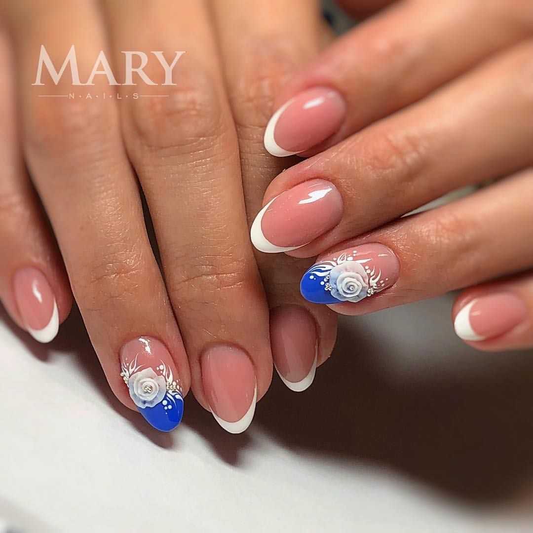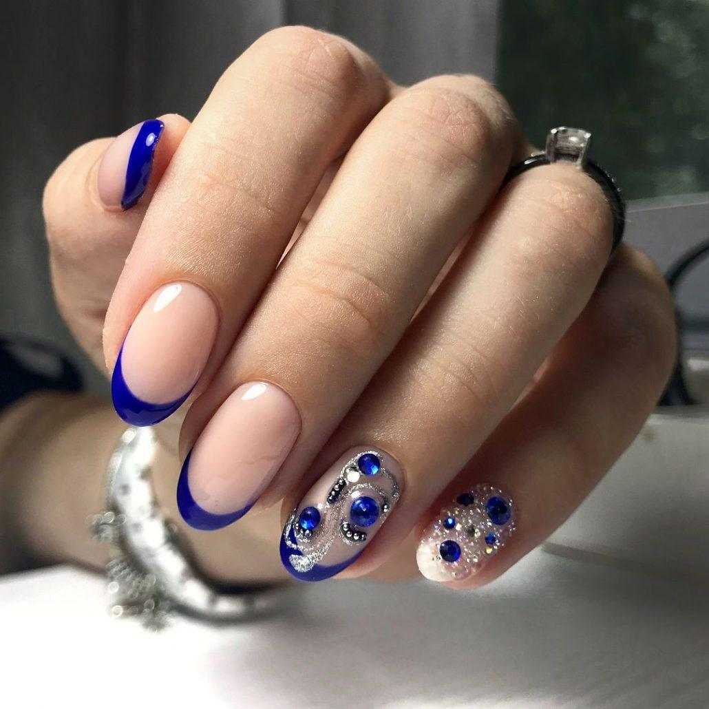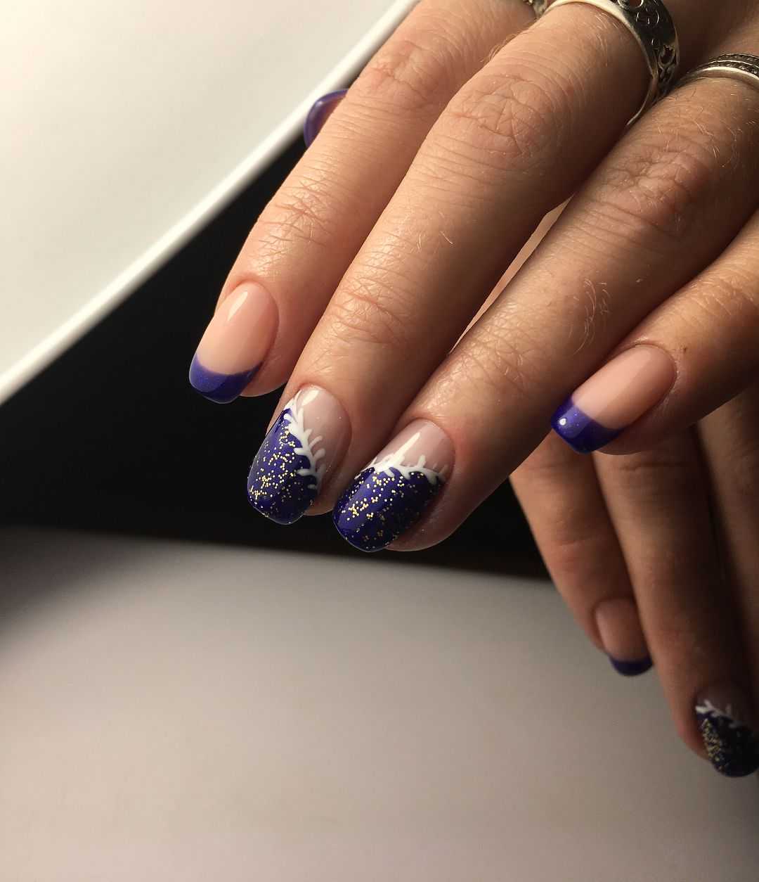 Насколько бы не видоизменялся френч, он всегда остаётся популярным и любимым многими модницами, поэтому его интересная вариация в синем цвете не менее достойно носит звание шедевра нейл-дизайна. Чтобы подчеркнуть особенности техники специалисты рекомендуют использовать синюю палитру для оформления улыбки на кончиках ногтевых пластин, которая прекрасно сочетается с пастельной или прозрачной основой, может быть классической, треугольной, двойной или скошенной. При создании маникюра в стиле минимализм достаточно продублировать синий «смайлик» тонкой полоской блестящего глиттера. Для оформления более эффектного варианта при помощи блёсток можно выделить полностью один из ноготков или совместить на паре пластин блестящие фрагменты с узорами.