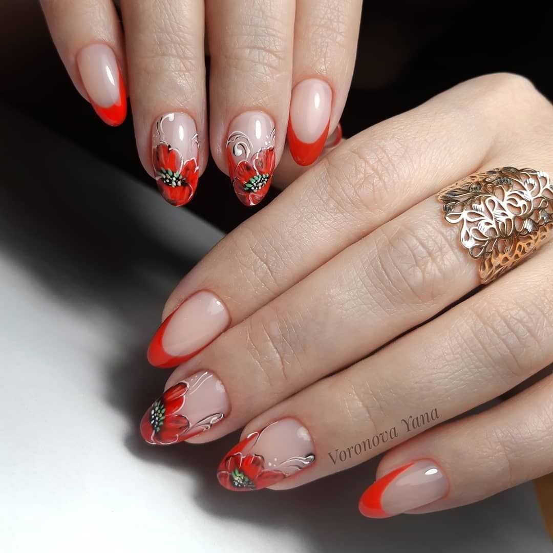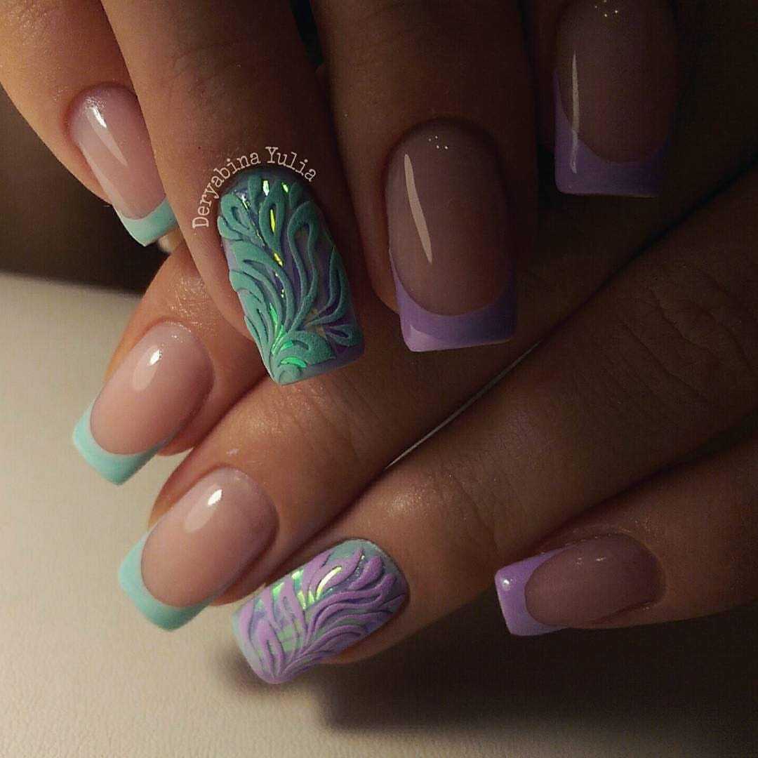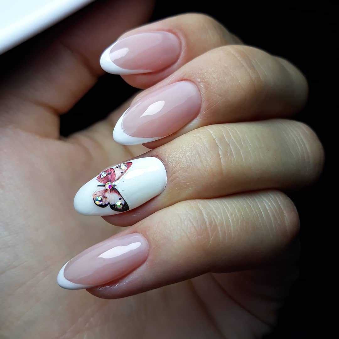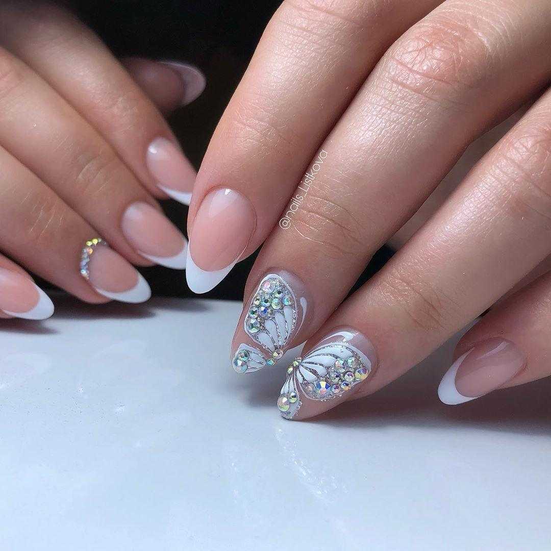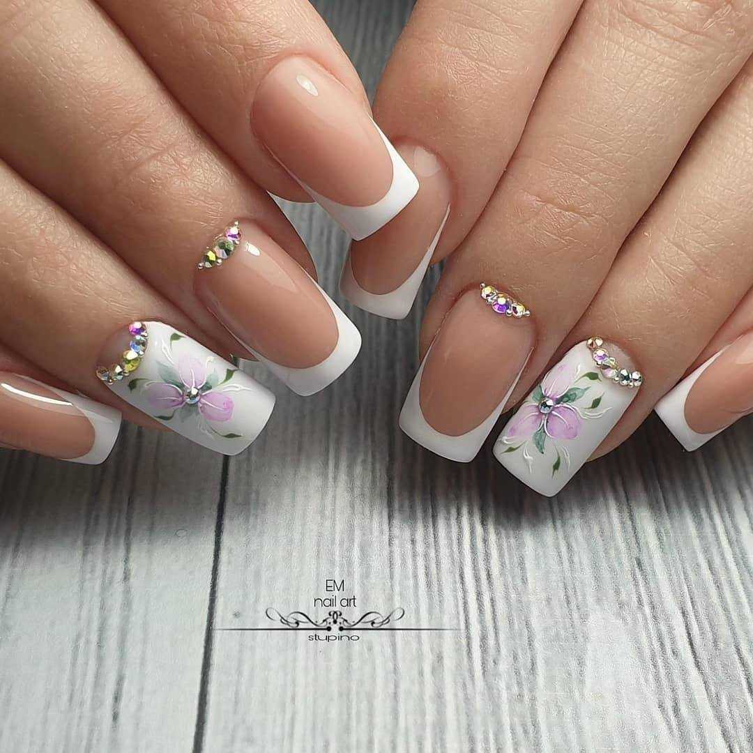 Как и всегда, французский маникюр достаточно актуальный и востребованный. Причем речь идет не только о классическом варианте, но и о современных решениях. Не слишком крупные рисунки прекрасно смотрятся на нескольких ноготках. В основном среди них цветочные и флористические мотивы, геометрия, абстракция и вензеля. В летнем сезоне френч часто дополняют изображения фруктов, ягод и бабочек. Поскольку данный вид дизайна часто делают на свадьбу, то рисунок также должен быть тематическим. Яркости маникюру придают блестки, но интенсивность зависит от выбранного варианта и плотности нанесения. Шиммер, глиттер и конфетти дают совершенно разный эффект на ноготках.