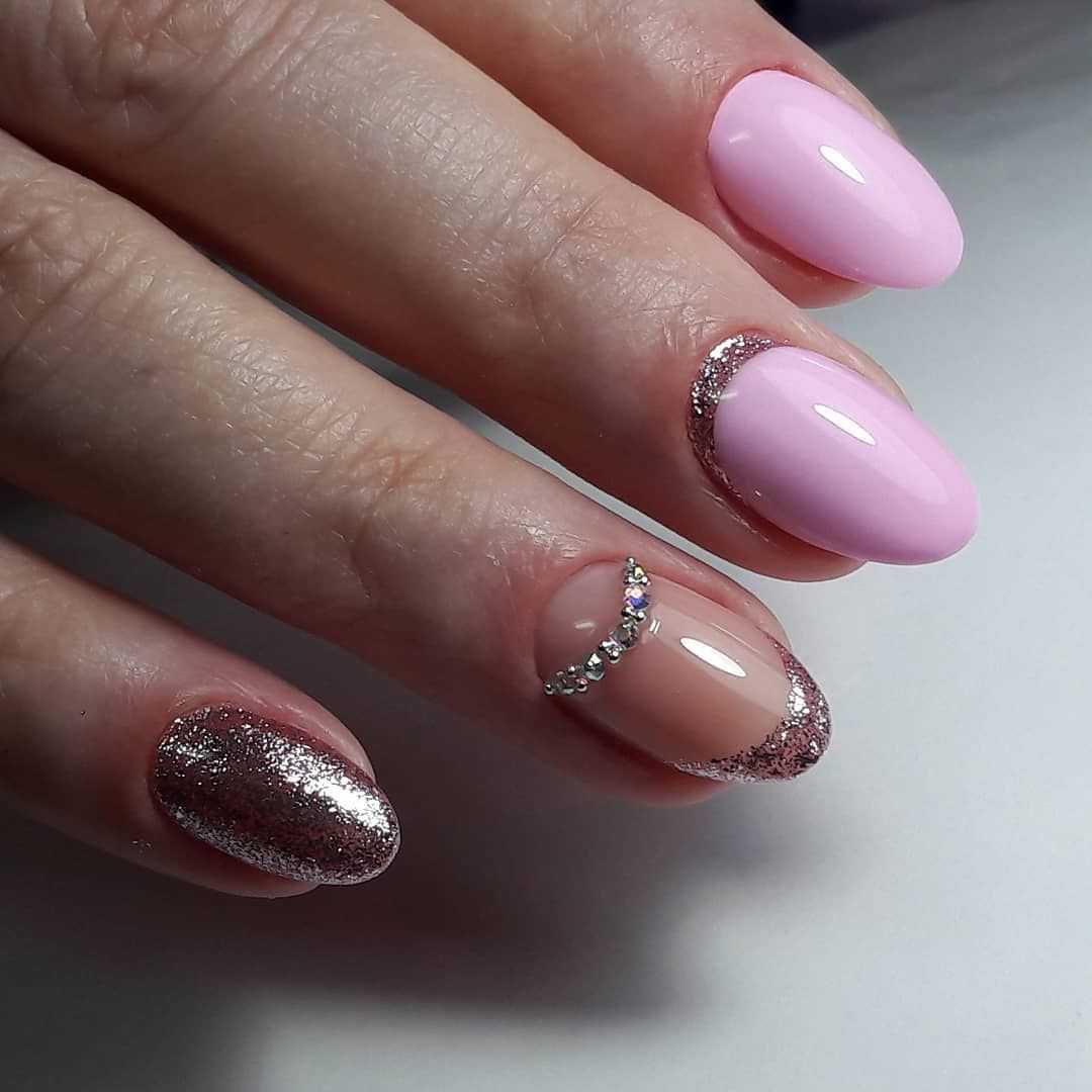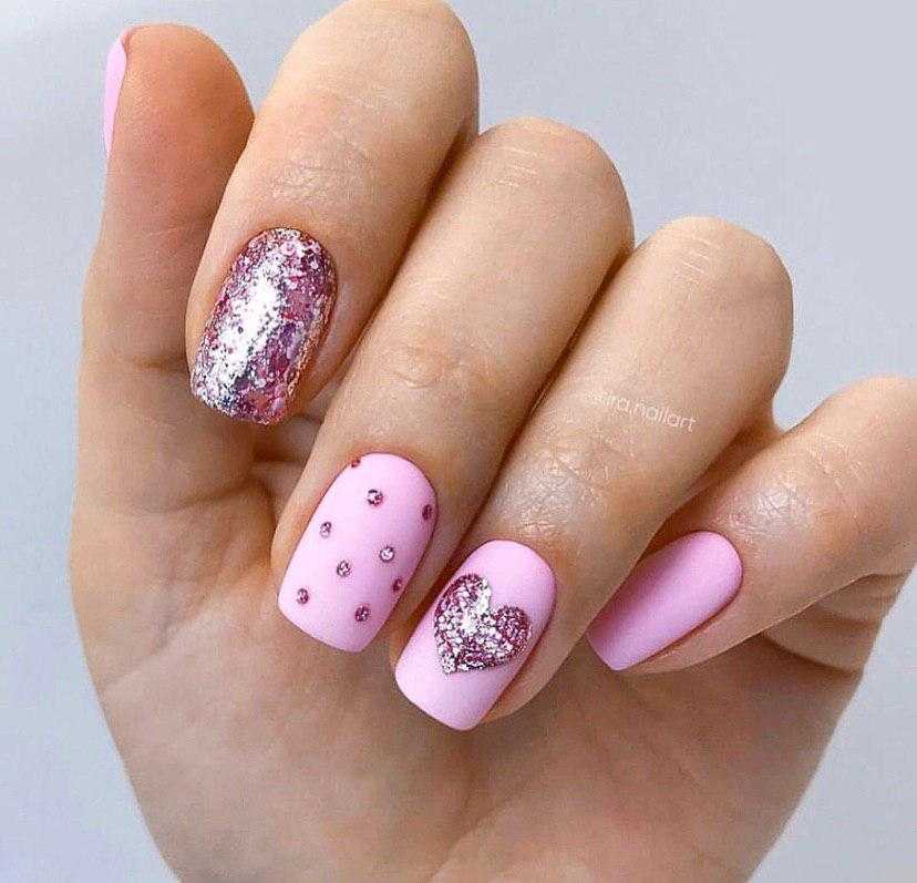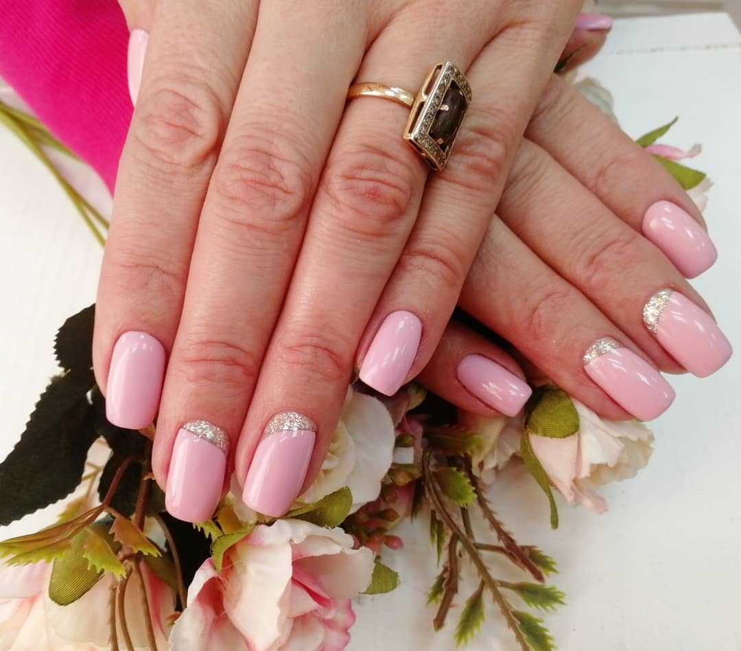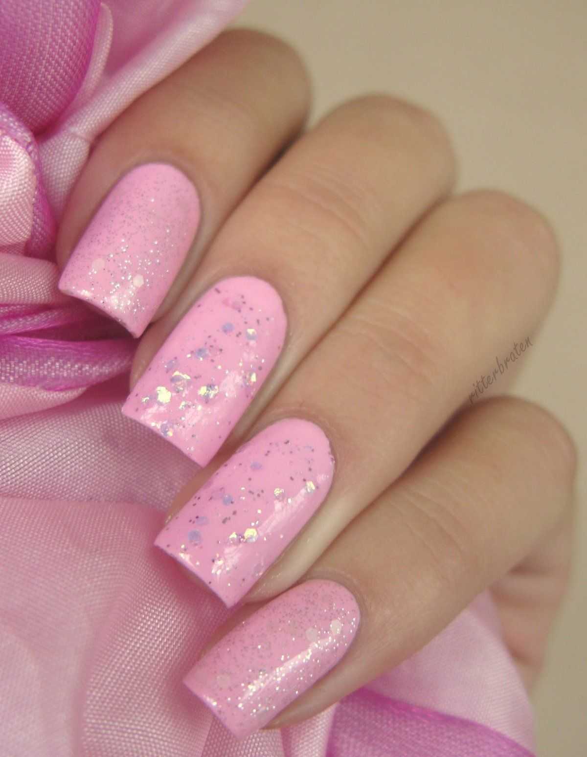 Розовая палитра богата разными оттенками, которые чудесно сочетаются с блёстками и шикарно смотрятся как на коротких, так и на длинных ноготках. Для создания модного розового маникюра изначально следует определиться с выбором основного покрытия, и, по мнению нейл-специалистов, светлокожим барышням лучше подходят светлые оттенки, а красоту смуглой кожи и тёмных волос следует подчеркнуть более яркими лаками. Для сохранения гармонии во всём образе, не стоит дублировать насыщенный розовый на ноготках в деталях одежды или аксессуарах.