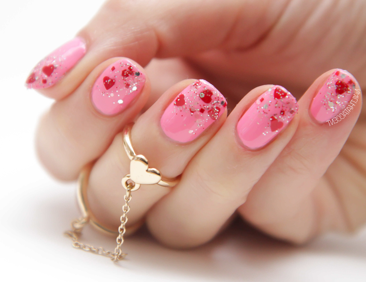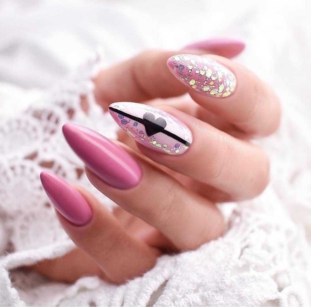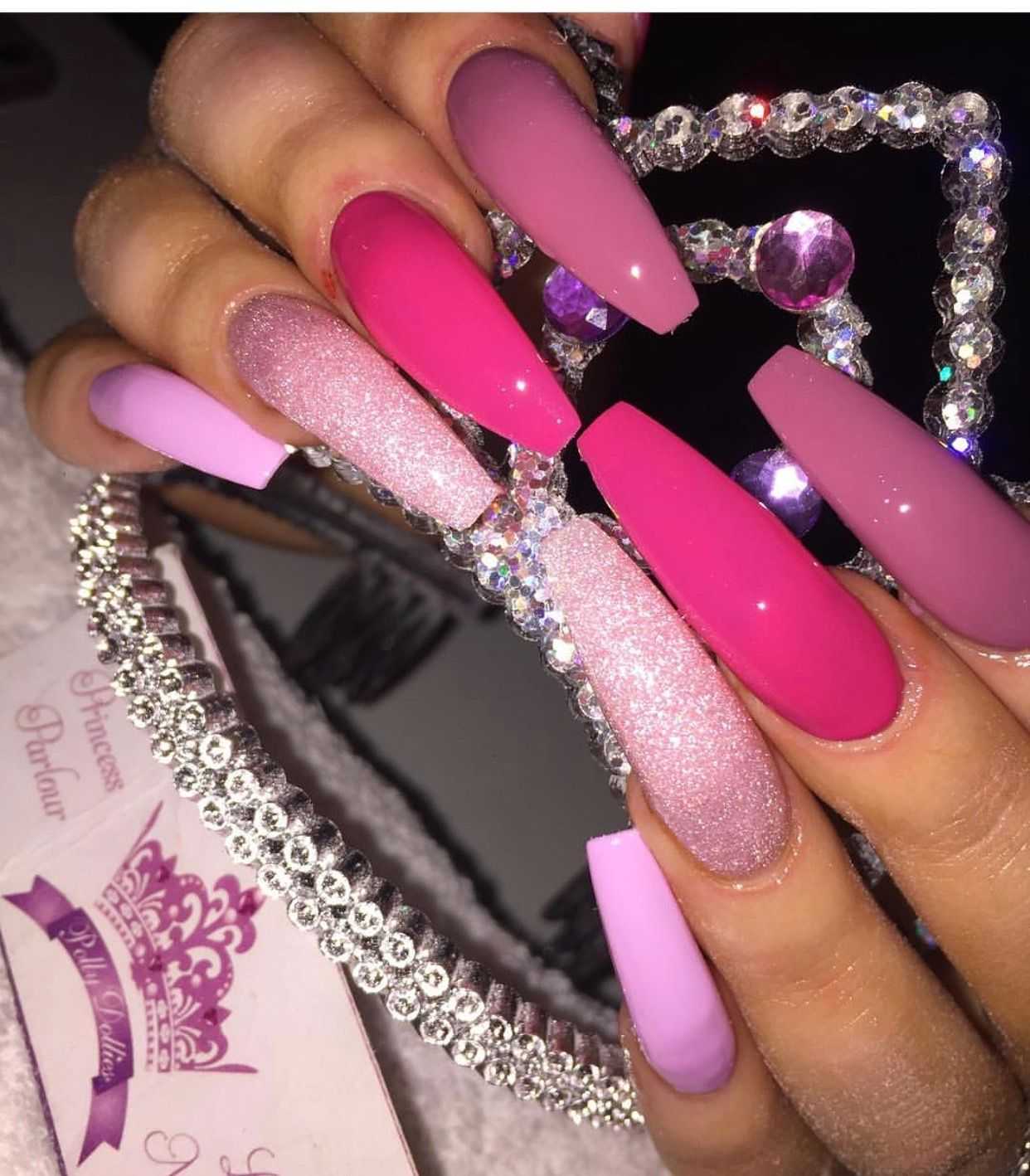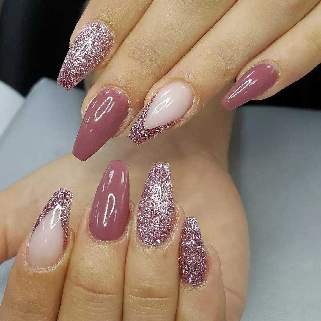 Розовая палитра богата разными оттенками, которые чудесно сочетаются с блёстками и шикарно смотрятся как на коротких, так и на длинных ноготках. Для создания модного розового маникюра изначально следует определиться с выбором основного покрытия, и, по мнению нейл-специалистов, светлокожим барышням лучше подходят светлые оттенки, а красоту смуглой кожи и тёмных волос следует подчеркнуть более яркими лаками. Для сохранения гармонии во всём образе, не стоит дублировать насыщенный розовый на ноготках в деталях одежды или аксессуарах.