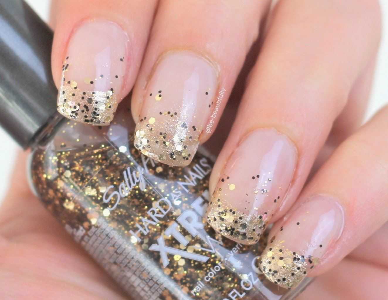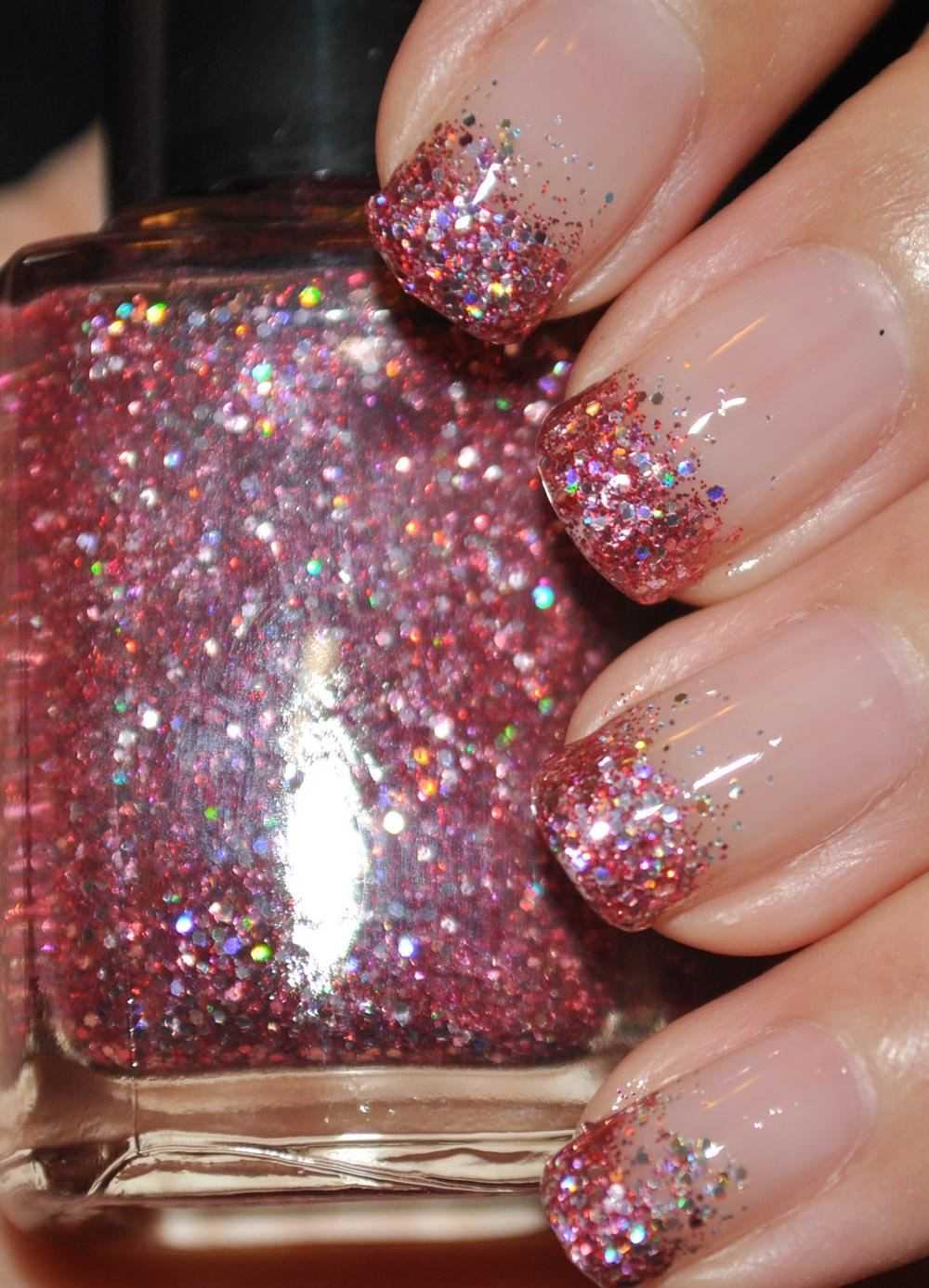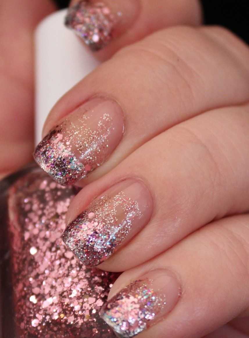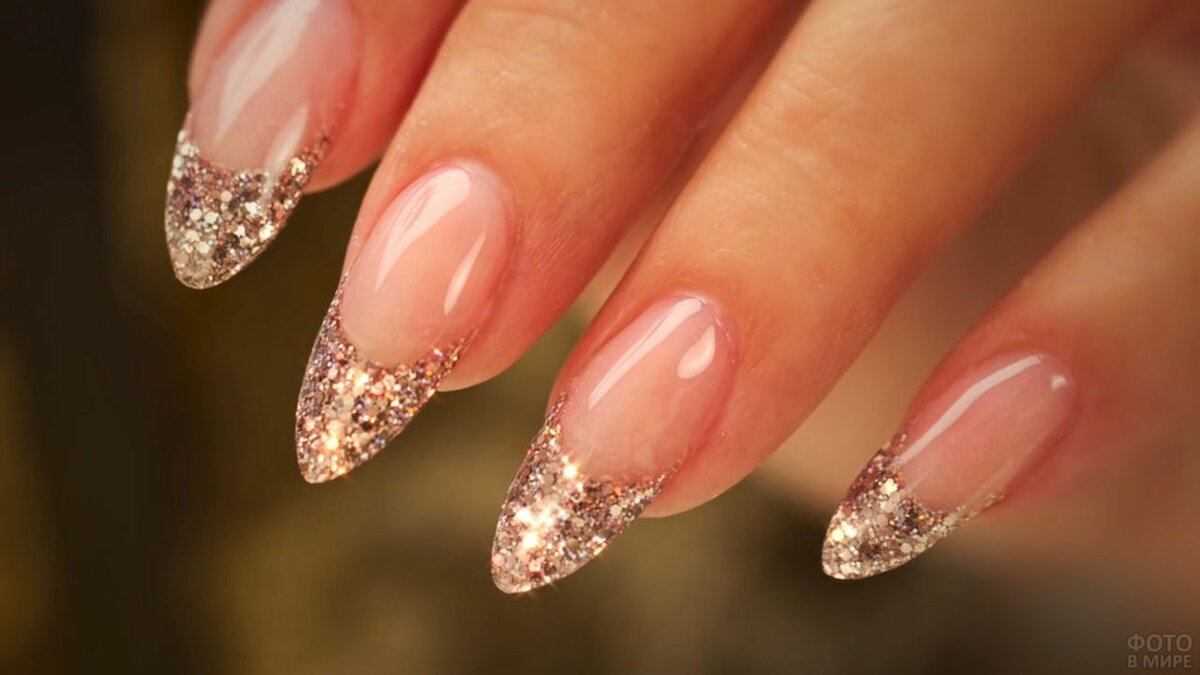 Блестки на кончиках ногтях выглядят как французский маникюр, где классический белый оттенок гель-лака заменен на блестящий декор. Такой маникюр выглядит просто, но не банально, легко создается самостоятельно и не требует особых навыков и опыта для своего выполнения.