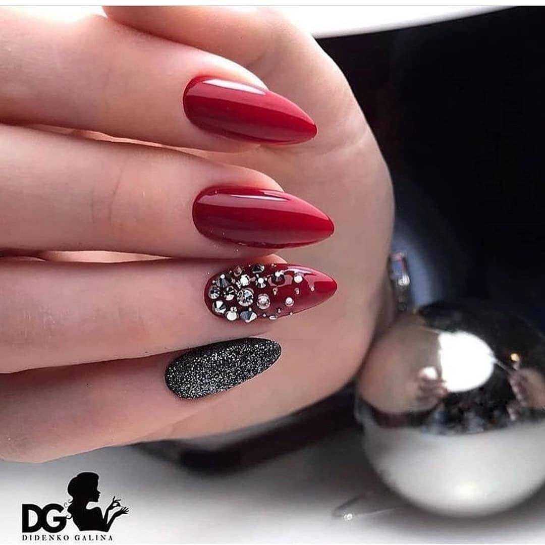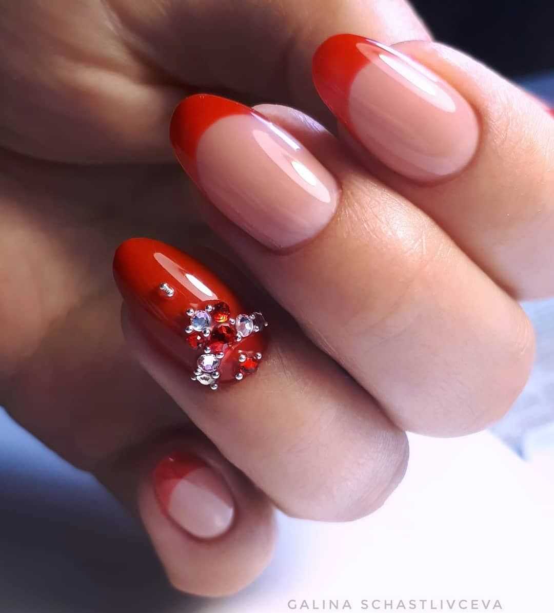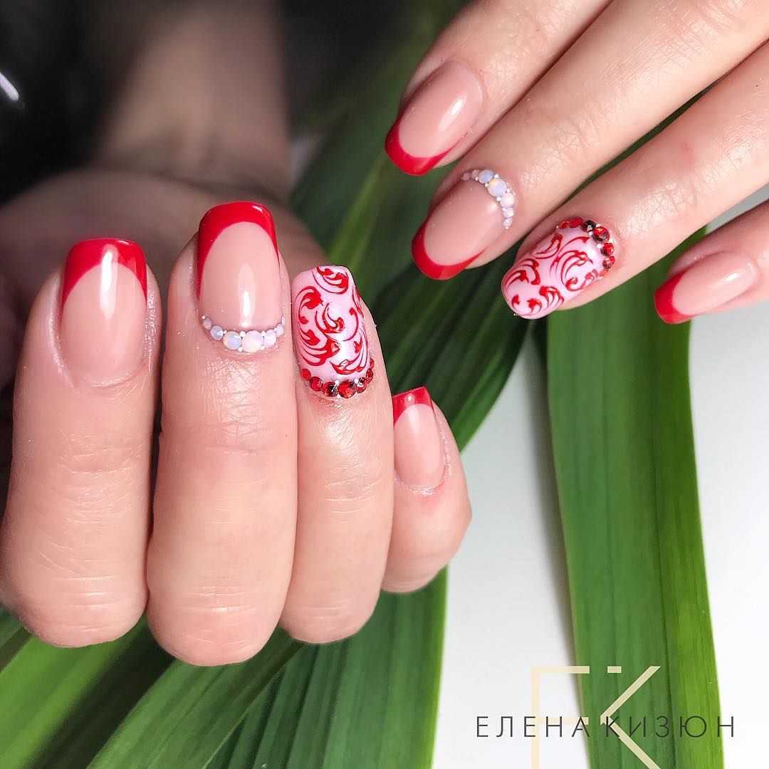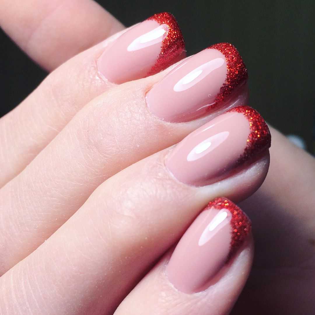 Мы уже упоминали о том, что блестки лучше всего гармонируют с классическими оттенками. О белом и черном френче мы знаем практически все. Где бы вы ни разместили их, ваш дизайн будет выглядеть ухоженно и стильно. Что касается красного или бордового френча, то тут есть несколько нюансов.