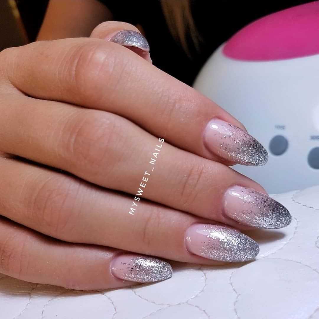 Наносим покрытие на ноготки и украшаем разными вариациями блёсток. Можно применить технику омбре, акцентировать блестящие материалы на безымянном пальчике или любой части ноготков в виде лунок, полосок, оригинальных орнаментов или узоров