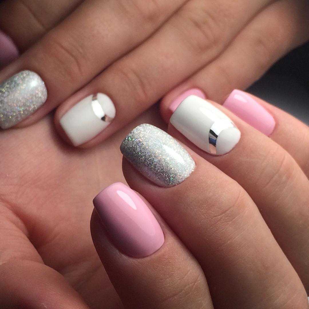 Не ограничивайтесь только однотонными нейл-артами. Добавьте в дизайн кружевной узор, выделите прикорневую зону. Используйте в качестве дополнения розовый цвет. Сочетание белого, розового и серебряного оттенков смотрится на ногтях благородно и очень сдержанно. Пример такого нейл-арта вы можете видеть на фото ниже.