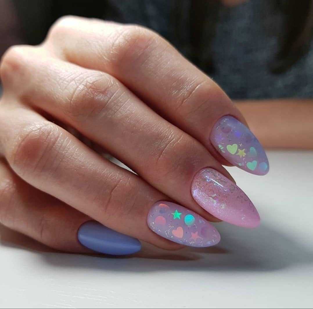 Девушки и женщины уже успели по достоинству оценить оригинальность данного предложения, поэтому оформление маникюра с разными оттенками лака на руках становится всё более популярным. Такой подход в нейл-искусстве позволяет не только экспериментировать и создавать удивительный, не похожий на все остальные маникюр, но и считается очень удачным решением в ситуации, когда ну очень сложно определиться между несколькими приглянувшимися оттенками лака. Наносим на ногтевые пластины правой и левой руки разные по цвету покрытия, и украшаем блёстками на своё усмотрение. Это могут быть как полностью покрытые блестящими частицами ноготки, так и вариации маникюра с блестящими узорами либо сочетание декора с рисунками или стразами.