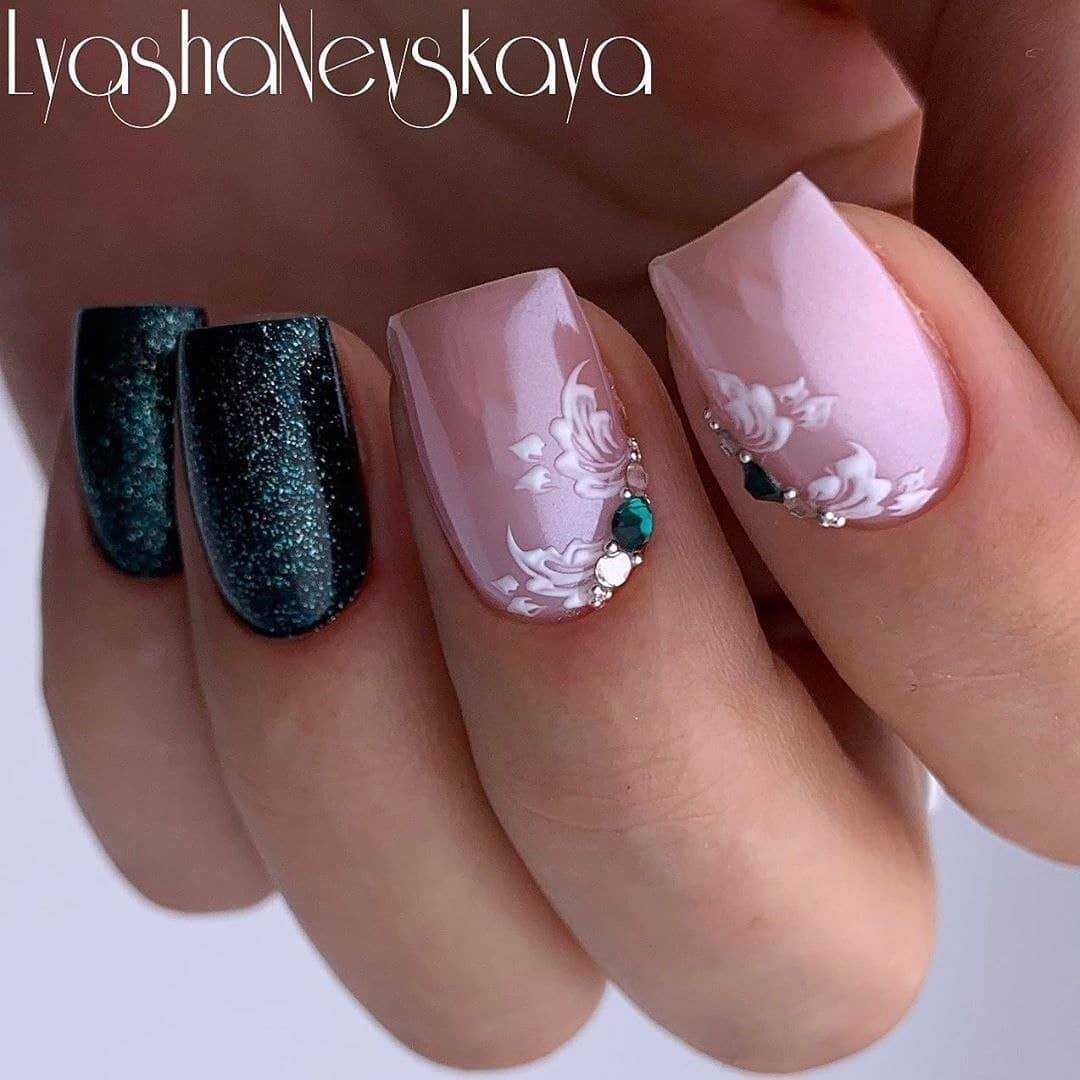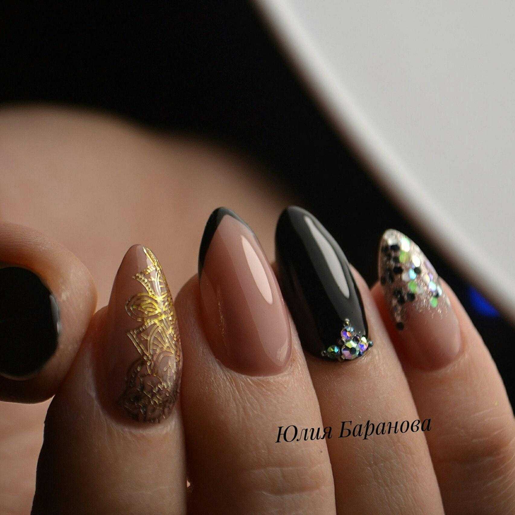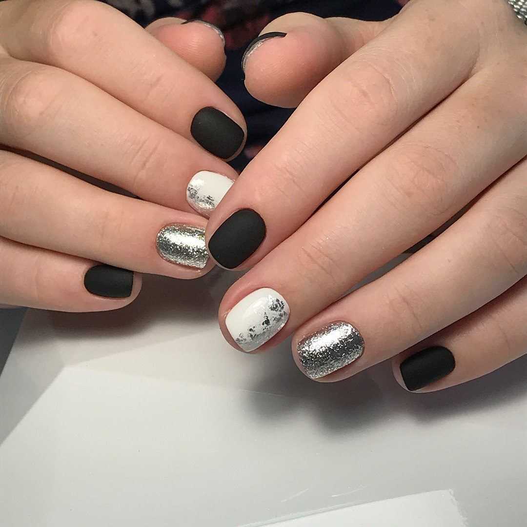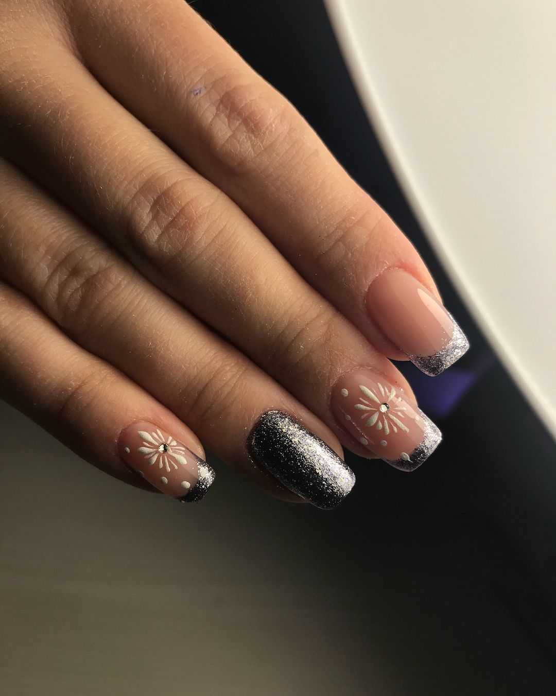 Многие читательницы сейчас удивлённо приподняли бровь, но мы вас уверяем, что столь необычное предложение смотрится не менее эффектно и привлекательно, чем другие нейл-идеи. Тем более, что блёстки в этом случае выступают не только в качестве стильного украшения, но и в некотором роде смягчают и сглаживают границу между тонами. Вы можете просто использовать чёрный цвет и блёстки для выделения пары акцентных ноготков или создать на пластинах необычную растяжку. Не менее интересным вариантом можно назвать «леопардовый» дизайн с прорисовкой тёмных пятен глиттером, мраморные узоры с оттисками фольги либо маникюр в стиле «ночное небо». Вариантов на самом деле множество.