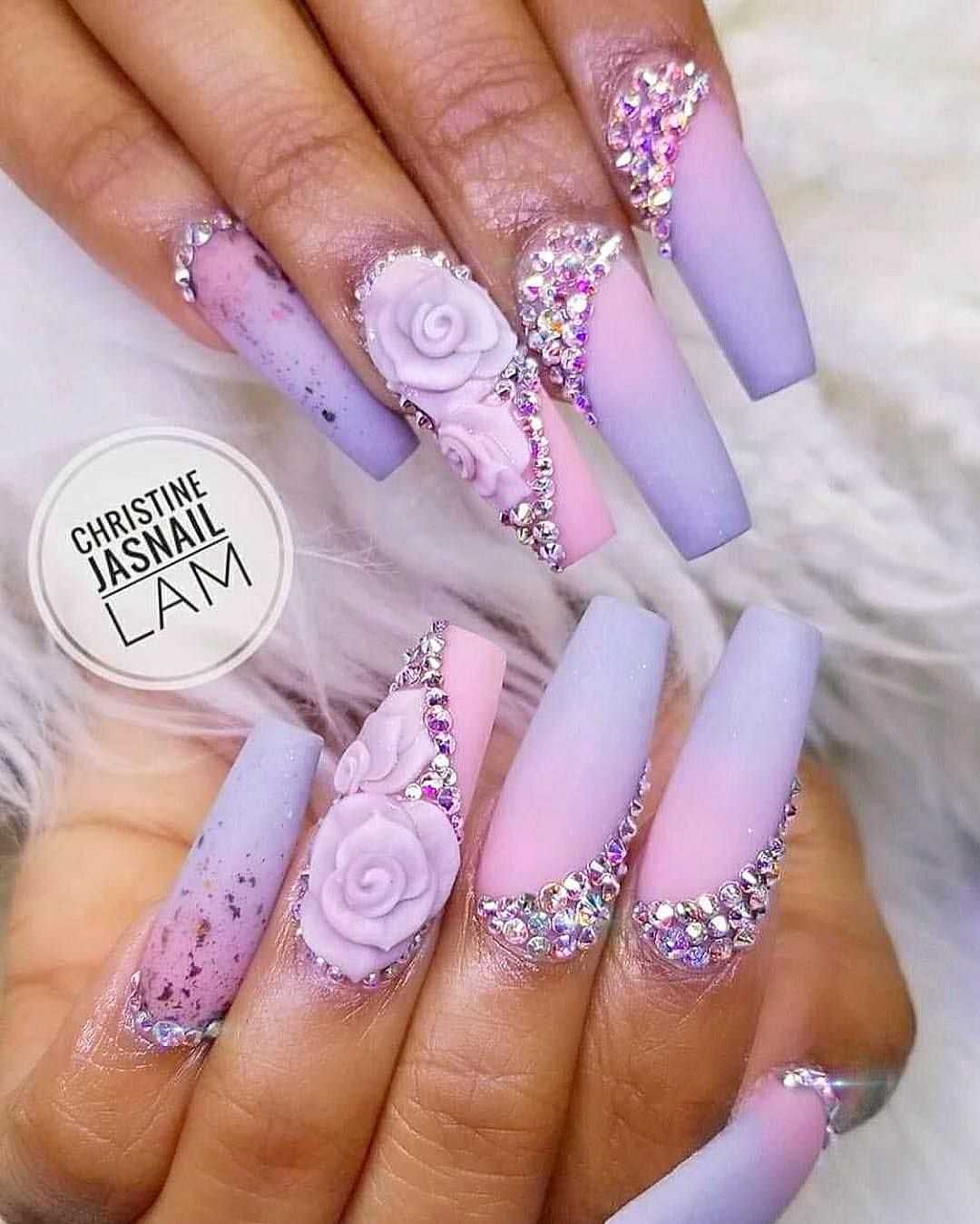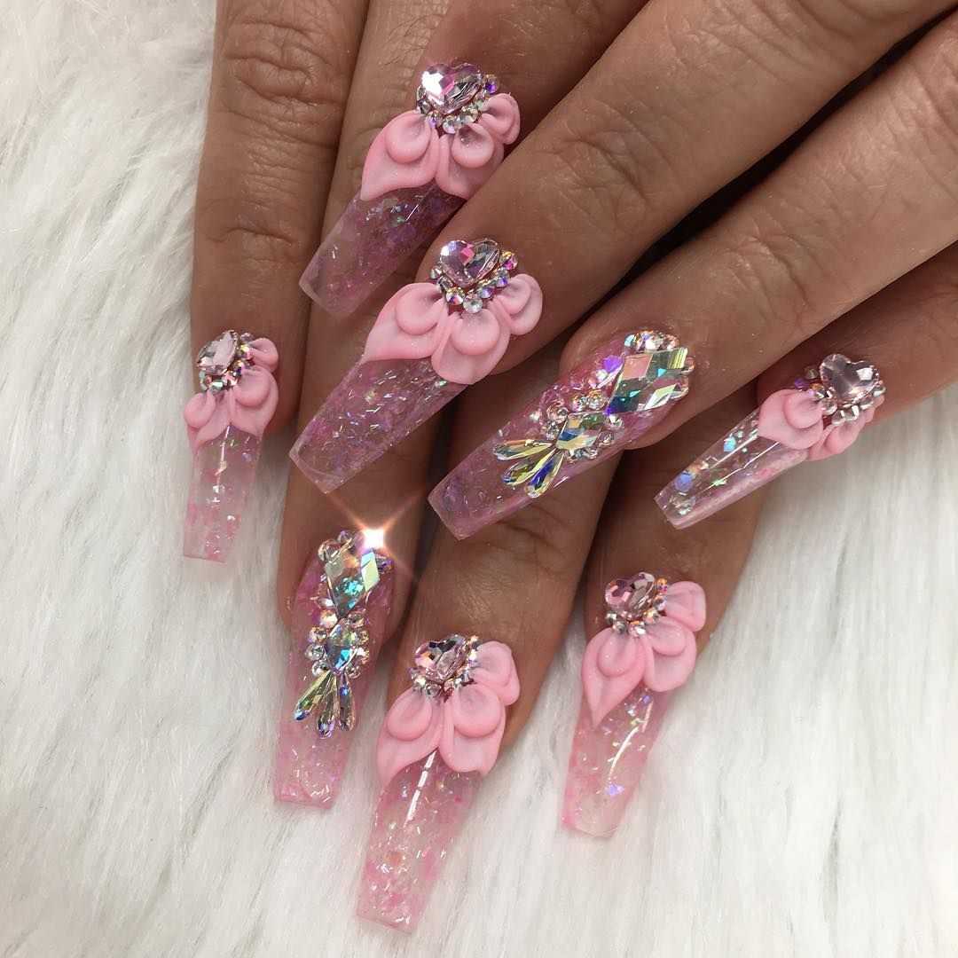 При выполнении маникюра на длинных ноготках всегда можно пофантазировать и воплотить в реальность самые невероятные идеи. При помощи различных блёсток можно создавать на ногтевых пластинах интересные узоры или выделять сиянием лишь часть ногтя. Френч, лунный дизайн и многие другие идеи являются в этом случае наглядным примером. Розовый маникюр с блёстками допускает использование как ярких, так и сдержанных оттенков, а также серого, белого или чёрного лака. Помимо блестящих дополнений также приветствуются рисунки, объёмные детали и комбинирование нескольких техник.