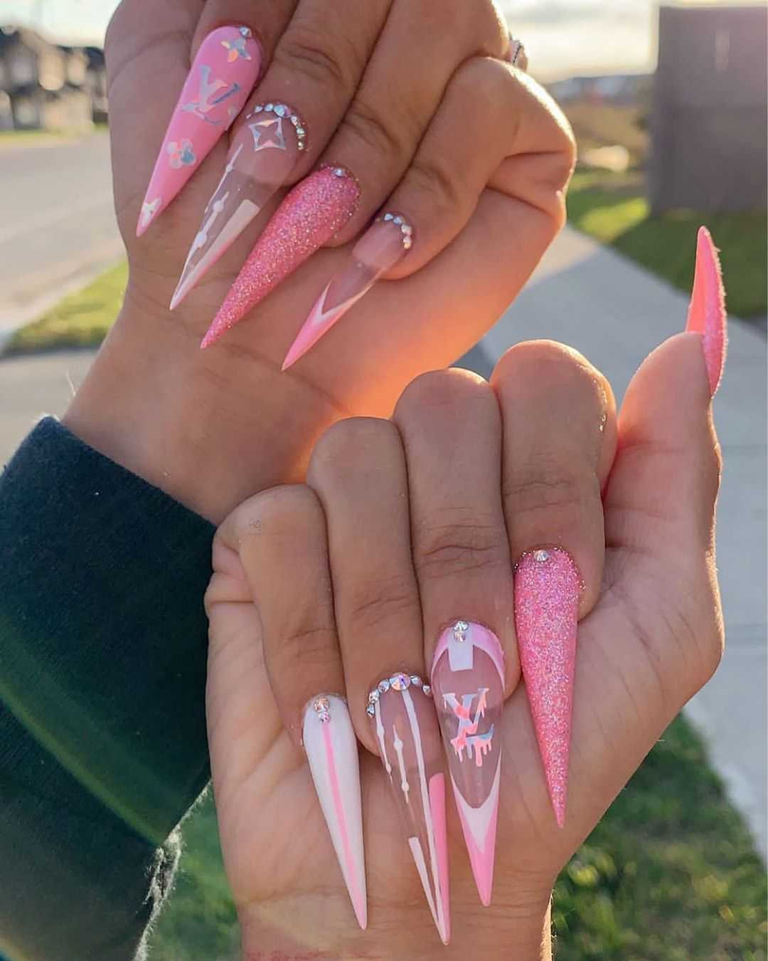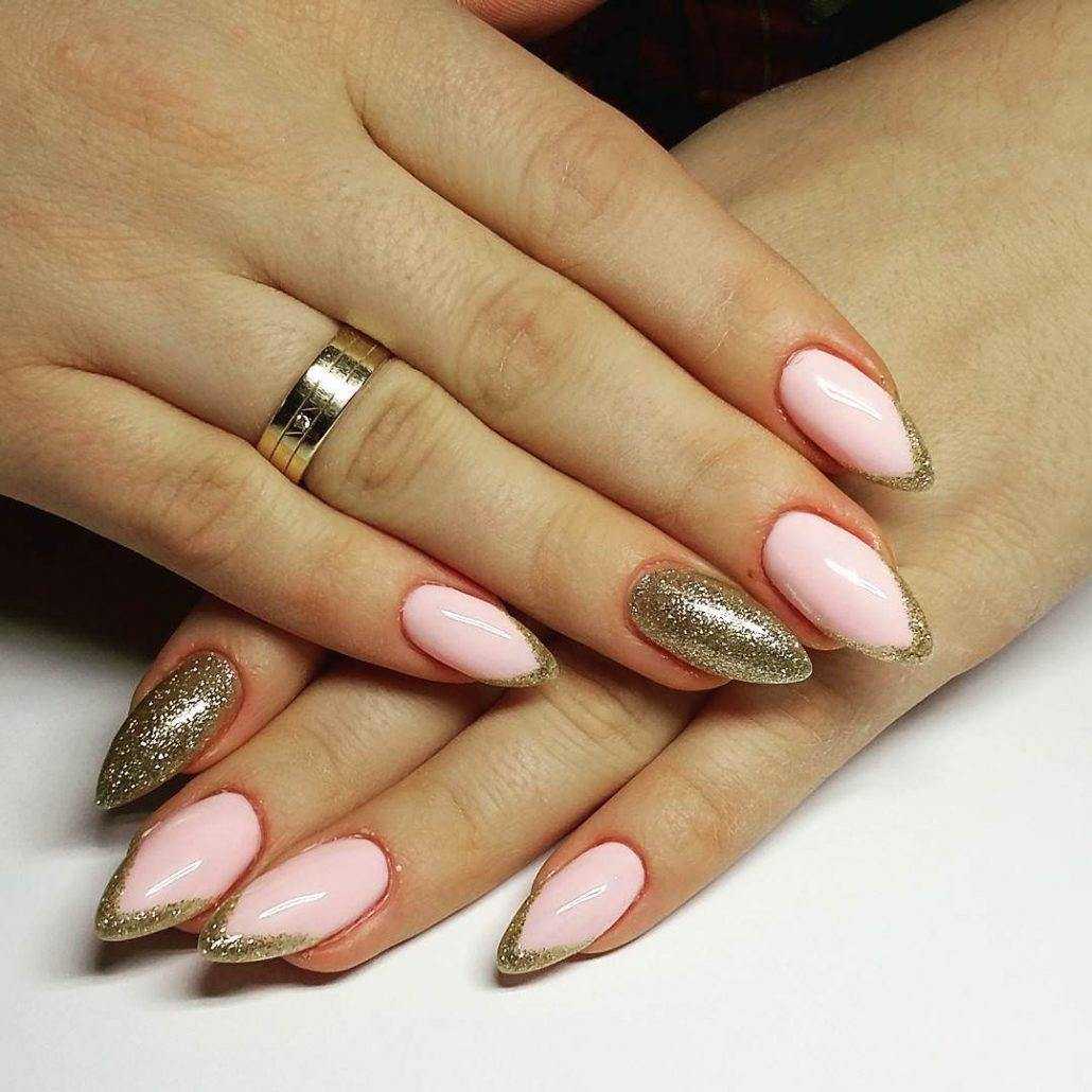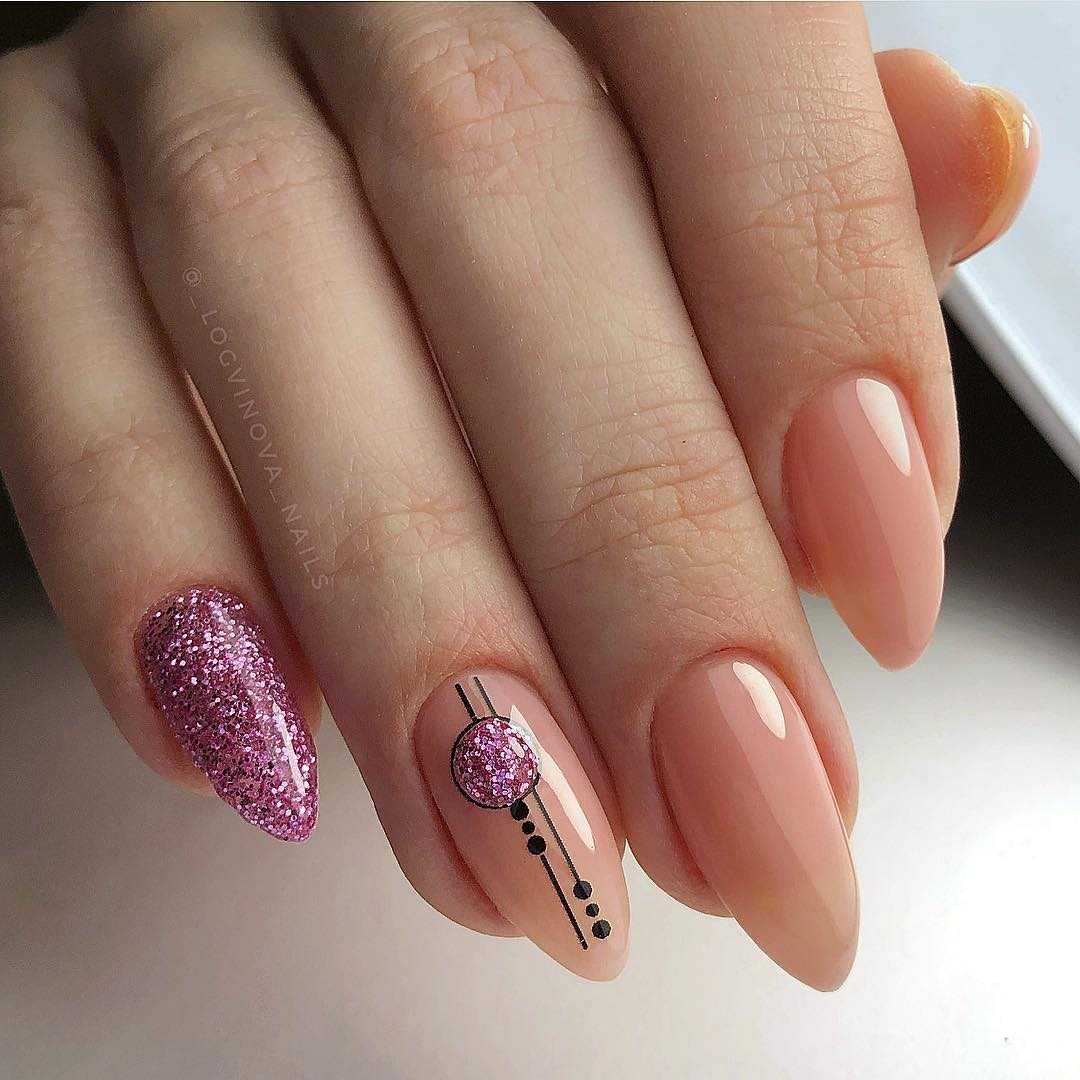 Длинные острые ноготки стилеты — самый модный вариант. А еще всем известно, что классический «миндаль» визуально придает утонченность рукам. В общем, идеальная форма, на которой также экспериментируют с блестками. Например, маникюр в розовом оттенке — отличный выбор. Пожалуй, стоит дополнить его блестящими графическими элементами, надписями — это выглядит более современно. В остальном длинные ноготки практически универсальны в цветовых сочетаниях. Однако лучше всего они смотрятся со светлыми и классическими оттенками — получите стильный дизайн.