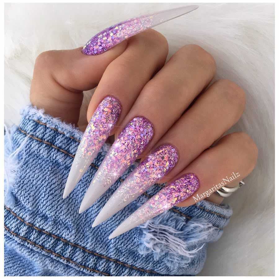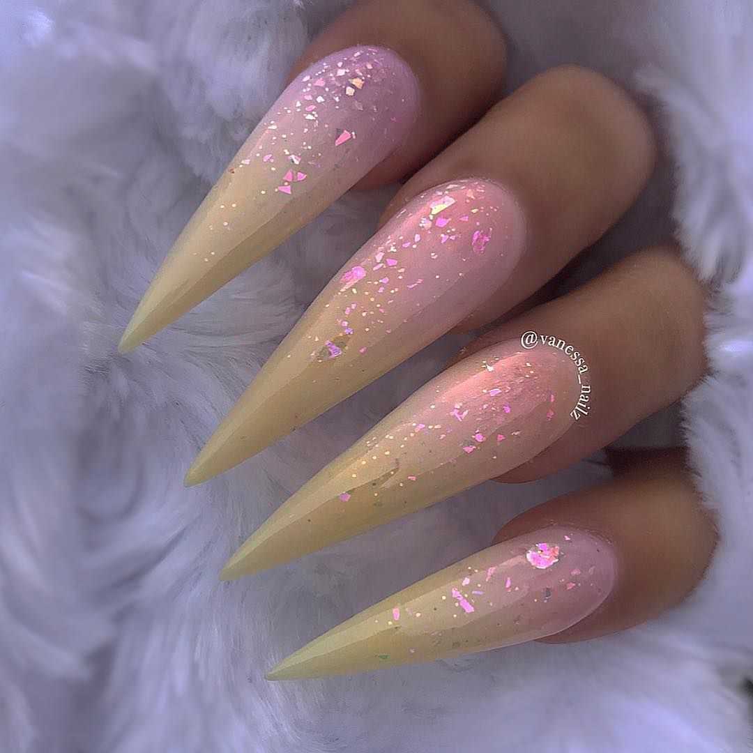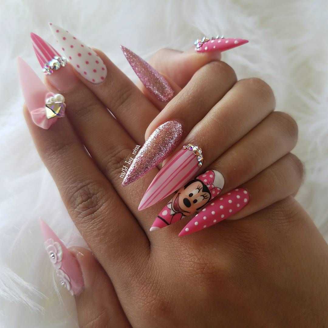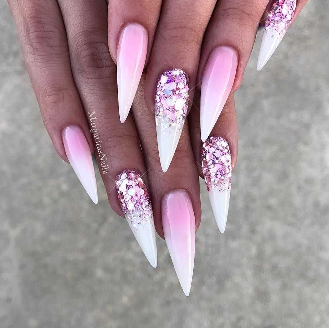 Длинные острые ноготки стилеты — самый модный вариант. А еще всем известно, что классический «миндаль» визуально придает утонченность рукам. В общем, идеальная форма, на которой также экспериментируют с блестками. Например, маникюр в розовом оттенке — отличный выбор. Пожалуй, стоит дополнить его блестящими графическими элементами, надписями — это выглядит более современно. В остальном длинные ноготки практически универсальны в цветовых сочетаниях. Однако лучше всего они смотрятся со светлыми и классическими оттенками — получите стильный дизайн.
