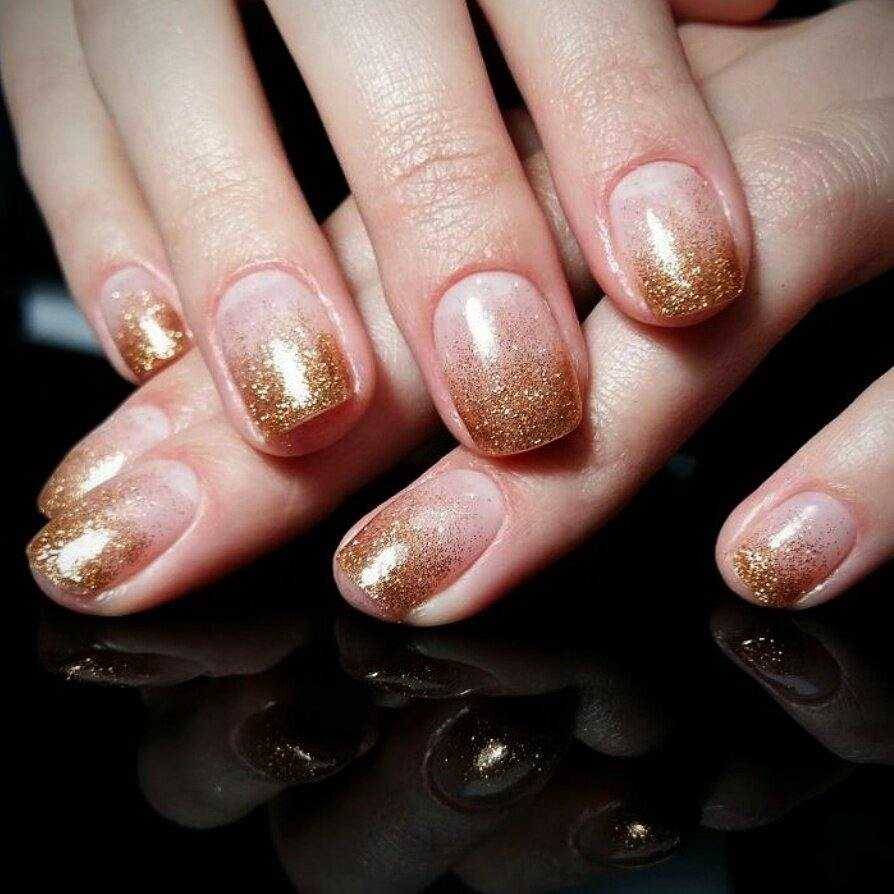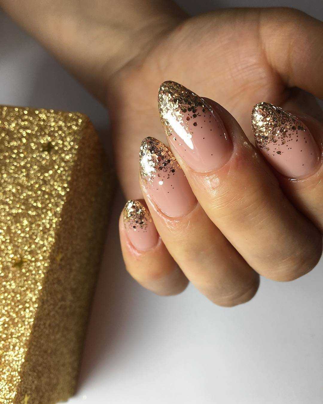 Золотой декор используется для сплошного покрытия ногтей, растяжки блестками, выделения края ногтевой пластины и прикорневой зоны. Дизайн с золотыми блестками ничем не отличается от идентичного маникюра с серебром. Золотой глиттер шикарно смотрится с кофейным, розовым, бежевым, молочным оттенками.