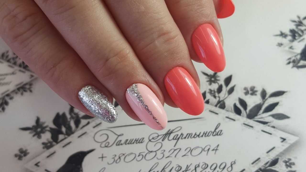 Еще один вариант однотонного маникюра – это сплошное покрытие одного из ноготков серебряным или золотым глиттером. В качестве сопутствующего оттенка гель-лака можно выбрать сдержанные пастельные тона, черный, бордовый, темно-синий оттенки. В летних образах очень ярко и насыщенно выглядит оранжевый, лимонный, лаймовый оттенки. Они отлично гармонируют с серебряным глиттером, втиркой, пайетками.