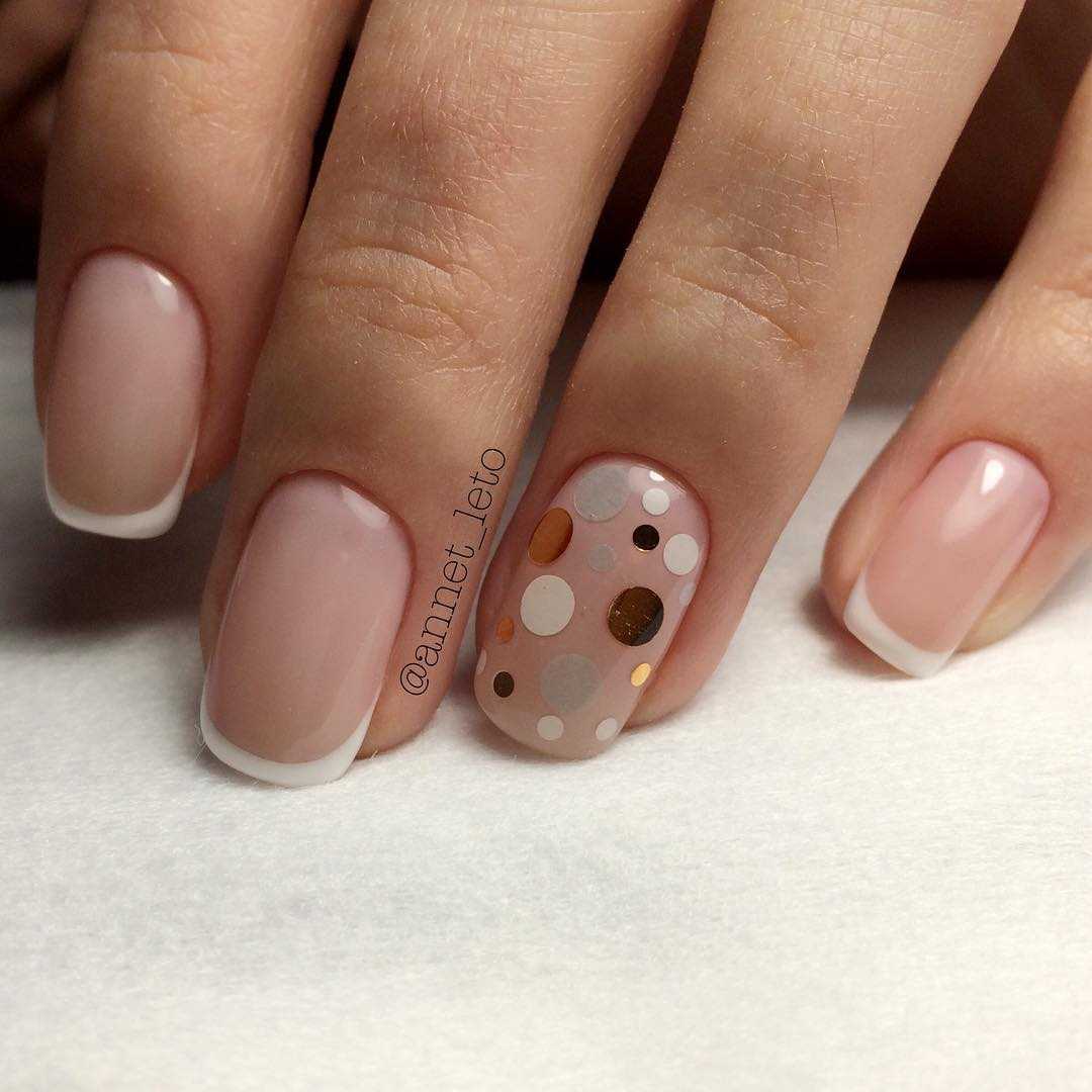 Что касается оформления блестками, то в данном случае лучше использовать их только в качестве акцента. То есть в небольшом количестве на линии улыбки, лунках или же в качестве дизайна. Благодаря такому подходу маникюр не будет перегруженным деталями.