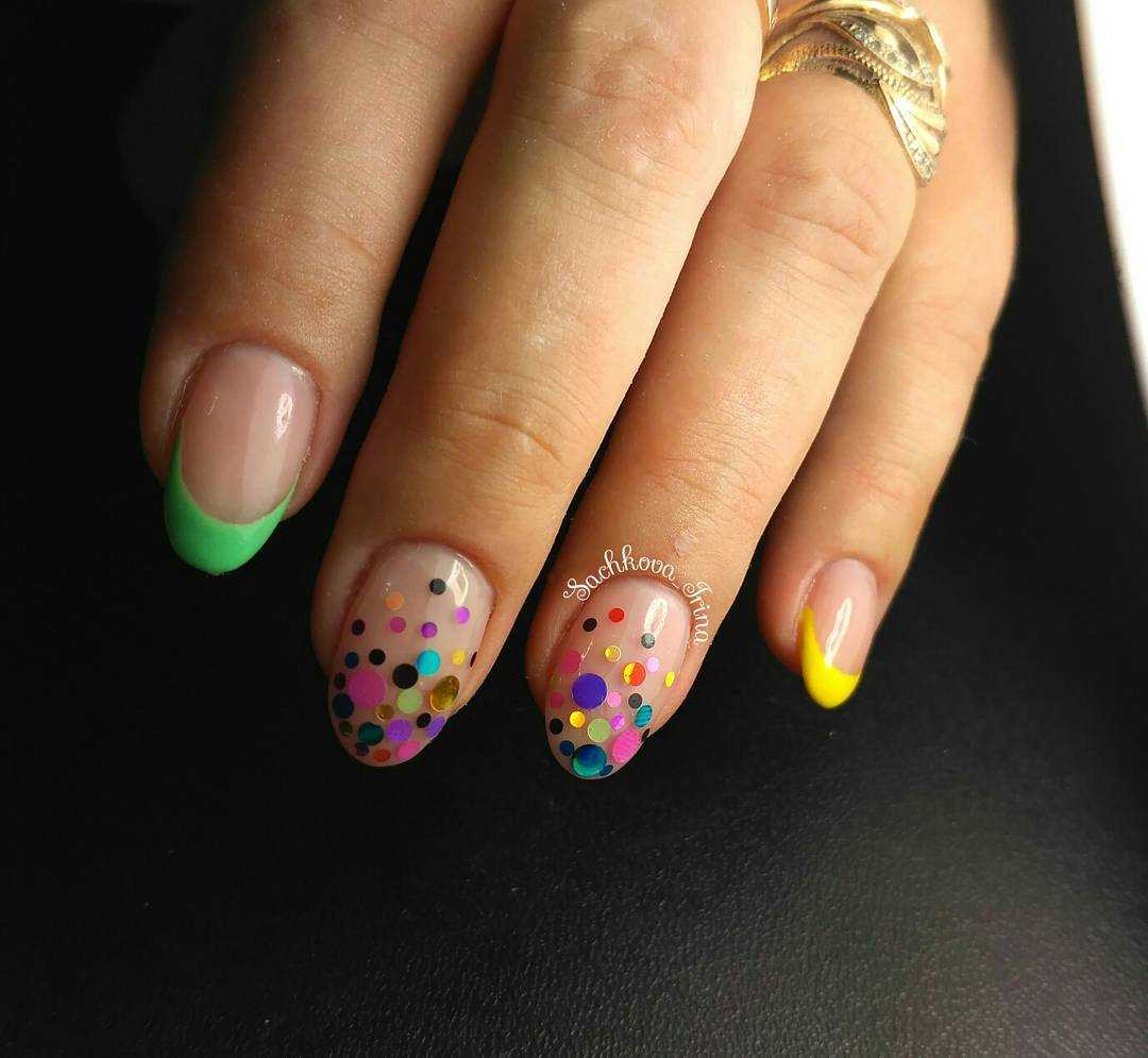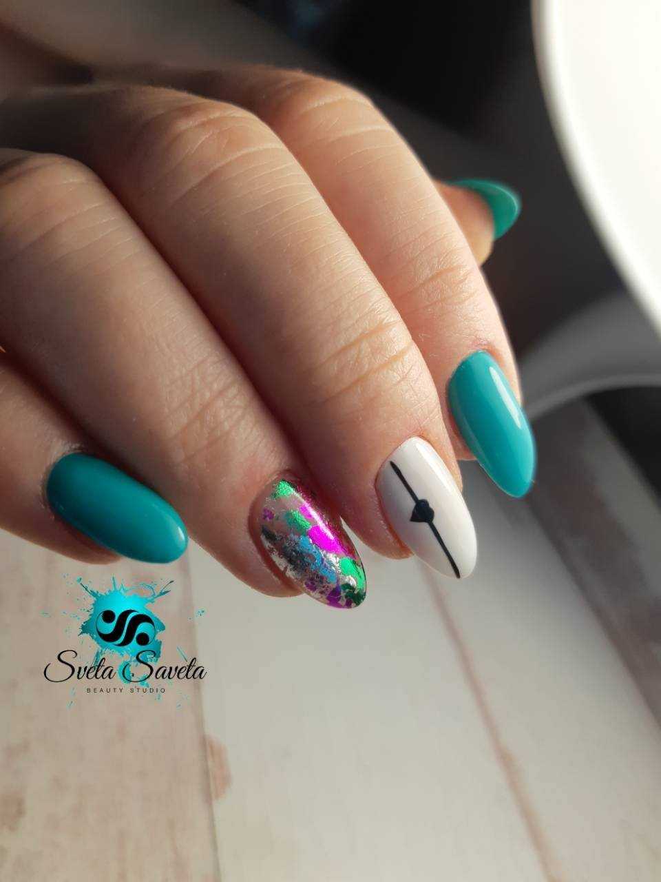 Одним из популярных трендов в нейл-индустрии является однотонный дизайн. Он не требует особого подхода к своему выполнению и позволяет использовать любые яркие тона, которые представлены в маникюрном наборе вашего мастера. Это могут быть оттенки из неоновой палитры или слегка приглушенные пастельные тона, а также любые другие вариации цветов, например, мятный, оранжевый, нежно-голубой, бордовый либо лимонный. У вас полная свобода выбора. В качестве блёсток можно использовать глиттер, пайетки, втирку или кусочки фольги, красиво расположив материалы на одном-двух ноготках.