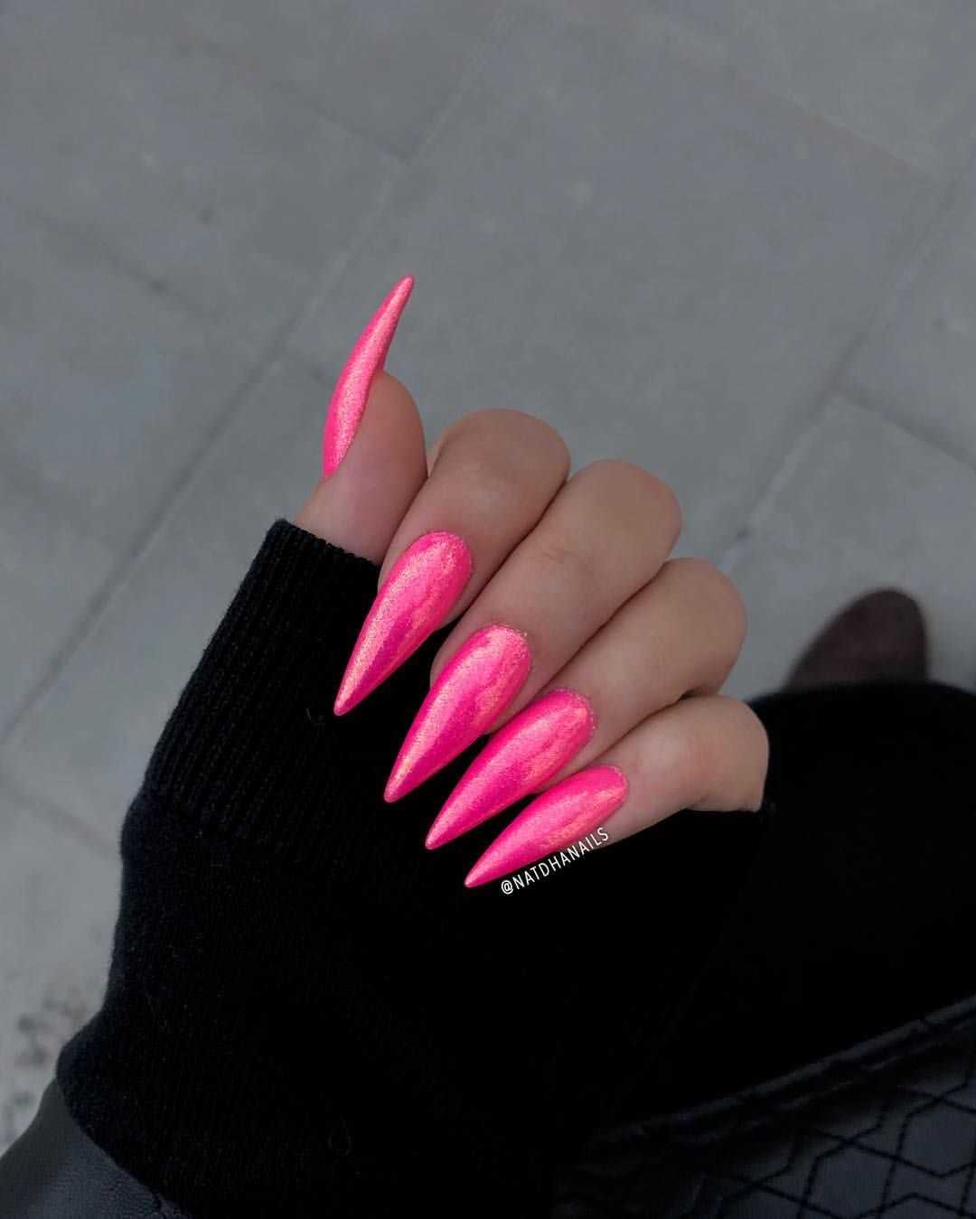 Всем барышням нравится внимание, поэтому идея яркого розового маникюра с блёстками обязательно найдёт своих поклонниц. Малиновый, фуксия, цикламен или другие яркие оттенки розового должны браться за основу при оформлении