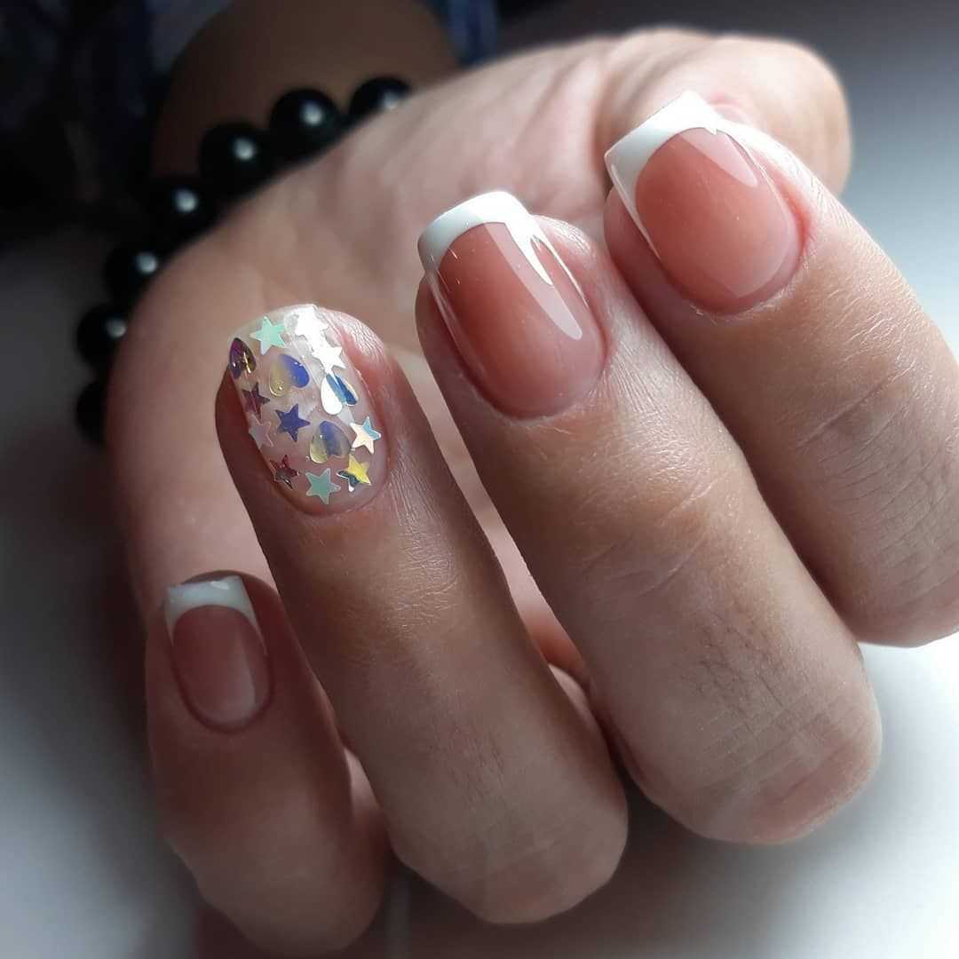 Модный французский маникюр в светлых тонах порадует своих поклонниц оригинальными решениями, которые представлены не только различными вариациями оттенков основания, но и незаконченным, двойным, треугольным или асимметричным вариантом улыбки, которая в свою очередь также может быть белоснежной или цветной. Ноготки могут оформляться в классическом стиле, где блёстки дублируют линию «смайлика». А могут украшать всевозможные дополнения в виде цветочных узоров, геометрии или абстракции на акцентном ноготке. Как вариант, попробуйте совместить глиттерные полоски и нестандартную линию улыбки или оформить кончик ноготка при помощи блестящих частиц.