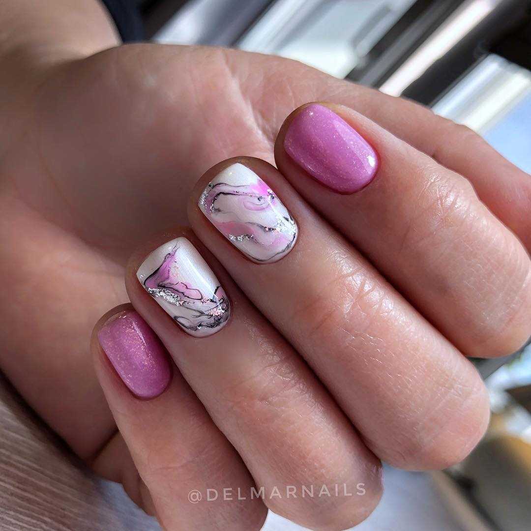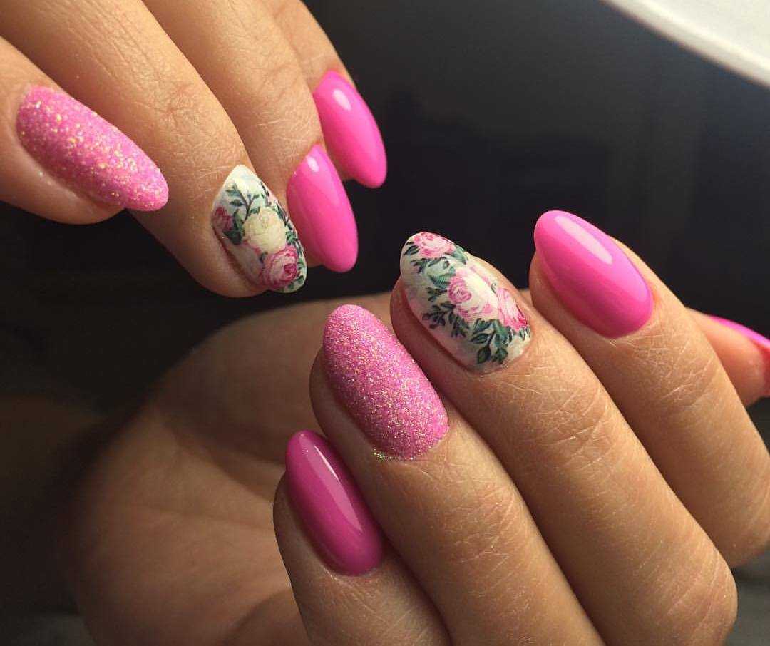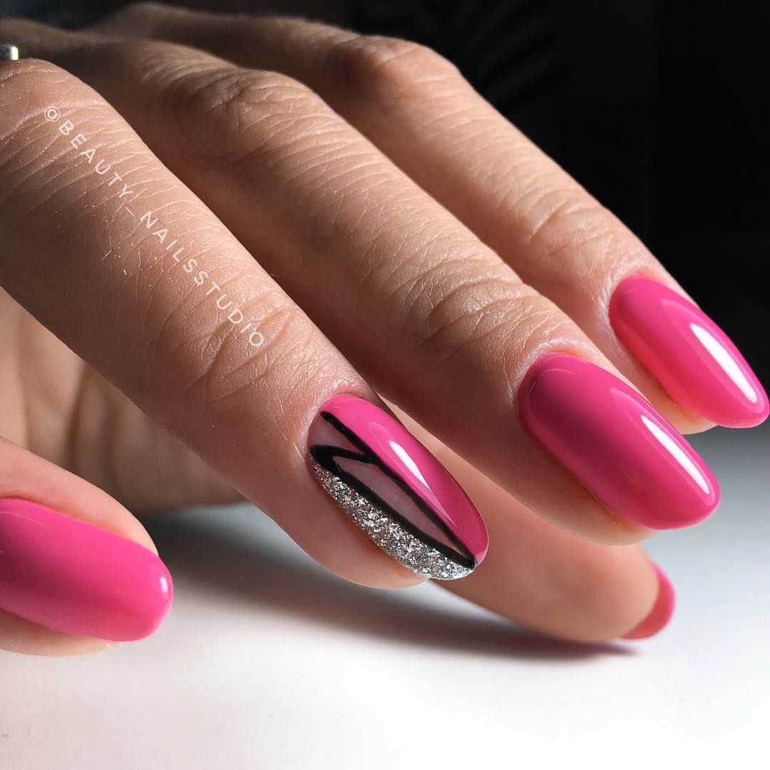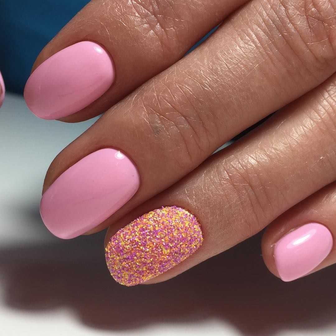 Одной из шикарных идей считается сочетание розового с золотыми нотками. Это может быть золотистый лак, глиттерные блёстки, золотые конфетти или пайетки. Для оформления подобного дизайна актуальнее отдать предпочтение светлым, пастельным покрытиям или розовым полупрозрачным лакам. Яркие и неоновые цвета лучше оставить для других вариантов. Вы можете оформлять золотым блеском узоры и рисунки на ногтевых пластинах или акцентировать золотистым сиянием несколько пальчиков. При оформлении маникюра с использованием перламутровых розовых лаков увлекаться золотыми деталями не стоит.