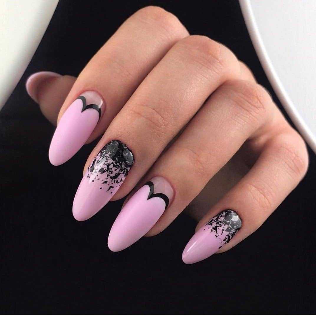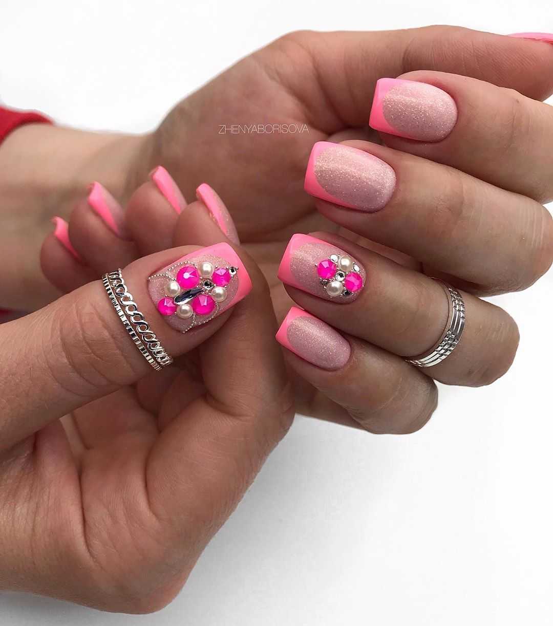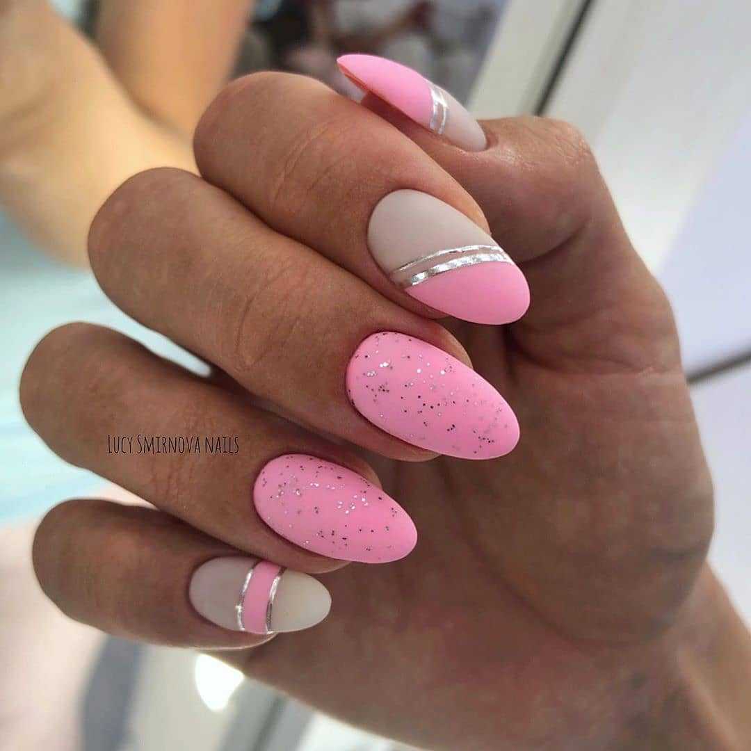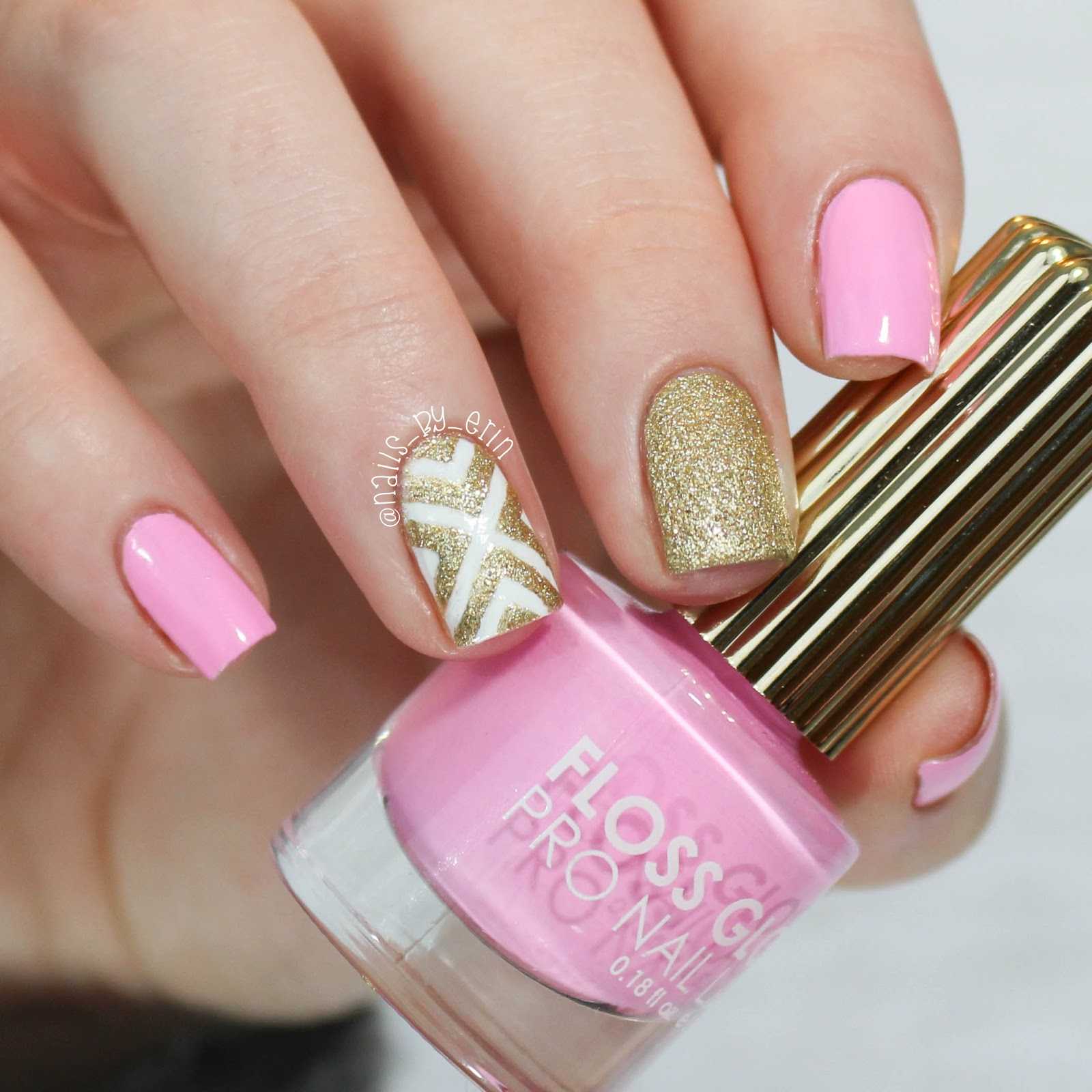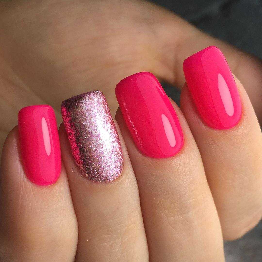 Одной из шикарных идей считается сочетание розового с золотыми нотками. Это может быть золотистый лак, глиттерные блёстки, золотые конфетти или пайетки. Для оформления подобного дизайна актуальнее отдать предпочтение светлым, пастельным покрытиям или розовым полупрозрачным лакам. Яркие и неоновые цвета лучше оставить для других вариантов. Вы можете оформлять золотым блеском узоры и рисунки на ногтевых пластинах или акцентировать золотистым сиянием несколько пальчиков. При оформлении маникюра с использованием перламутровых розовых лаков увлекаться золотыми деталями не стоит.