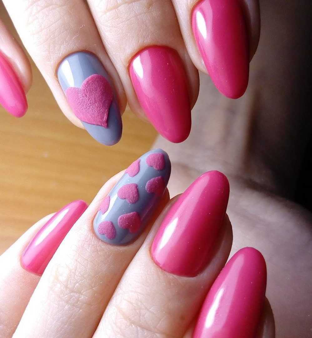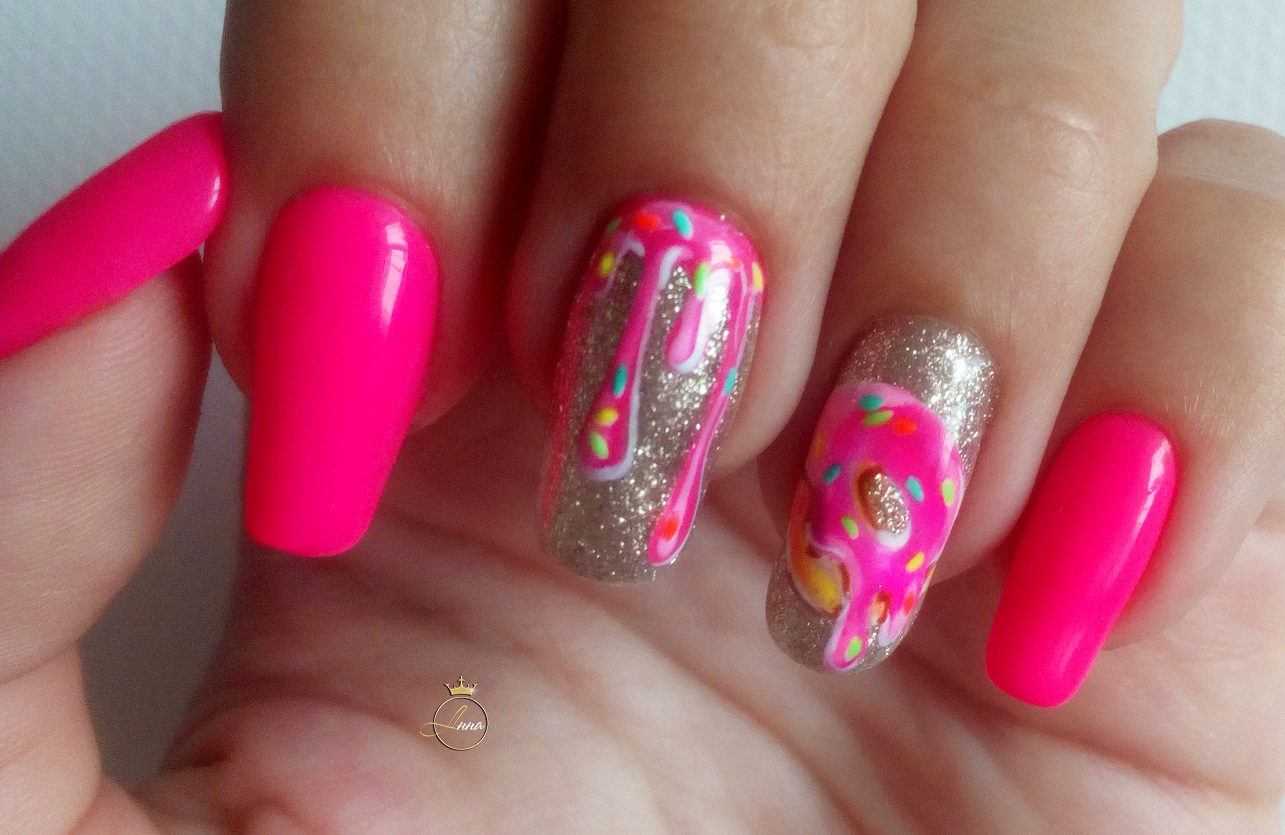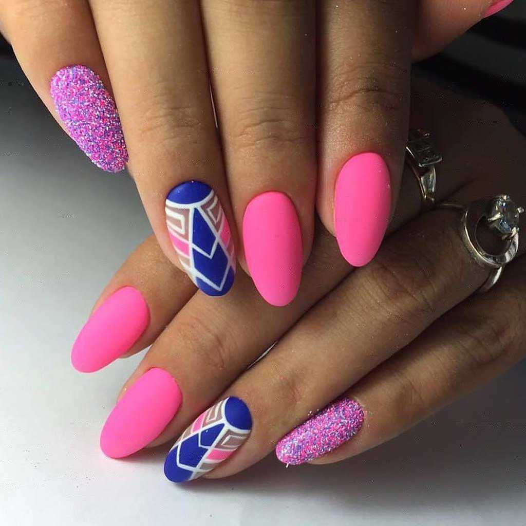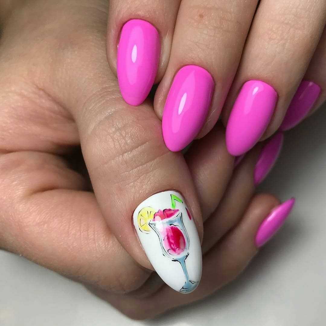 Одной из шикарных идей считается сочетание розового с золотыми нотками. Это может быть золотистый лак, глиттерные блёстки, золотые конфетти или пайетки. Для оформления подобного дизайна актуальнее отдать предпочтение светлым, пастельным покрытиям или розовым полупрозрачным лакам. Яркие и неоновые цвета лучше оставить для других вариантов. Вы можете оформлять золотым блеском узоры и рисунки на ногтевых пластинах или акцентировать золотистым сиянием несколько пальчиков. При оформлении маникюра с использованием перламутровых розовых лаков увлекаться золотыми деталями не стоит.