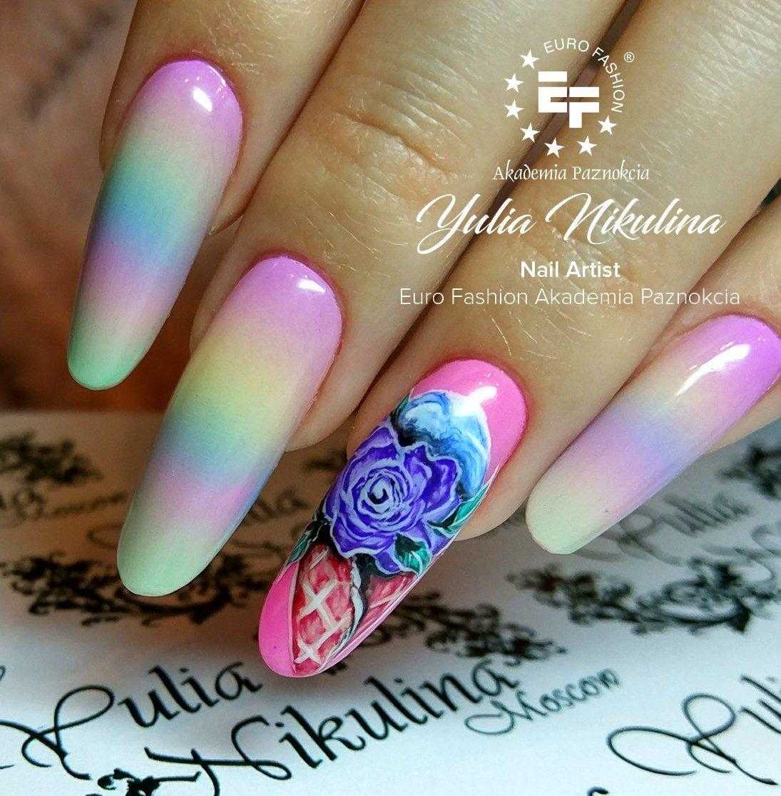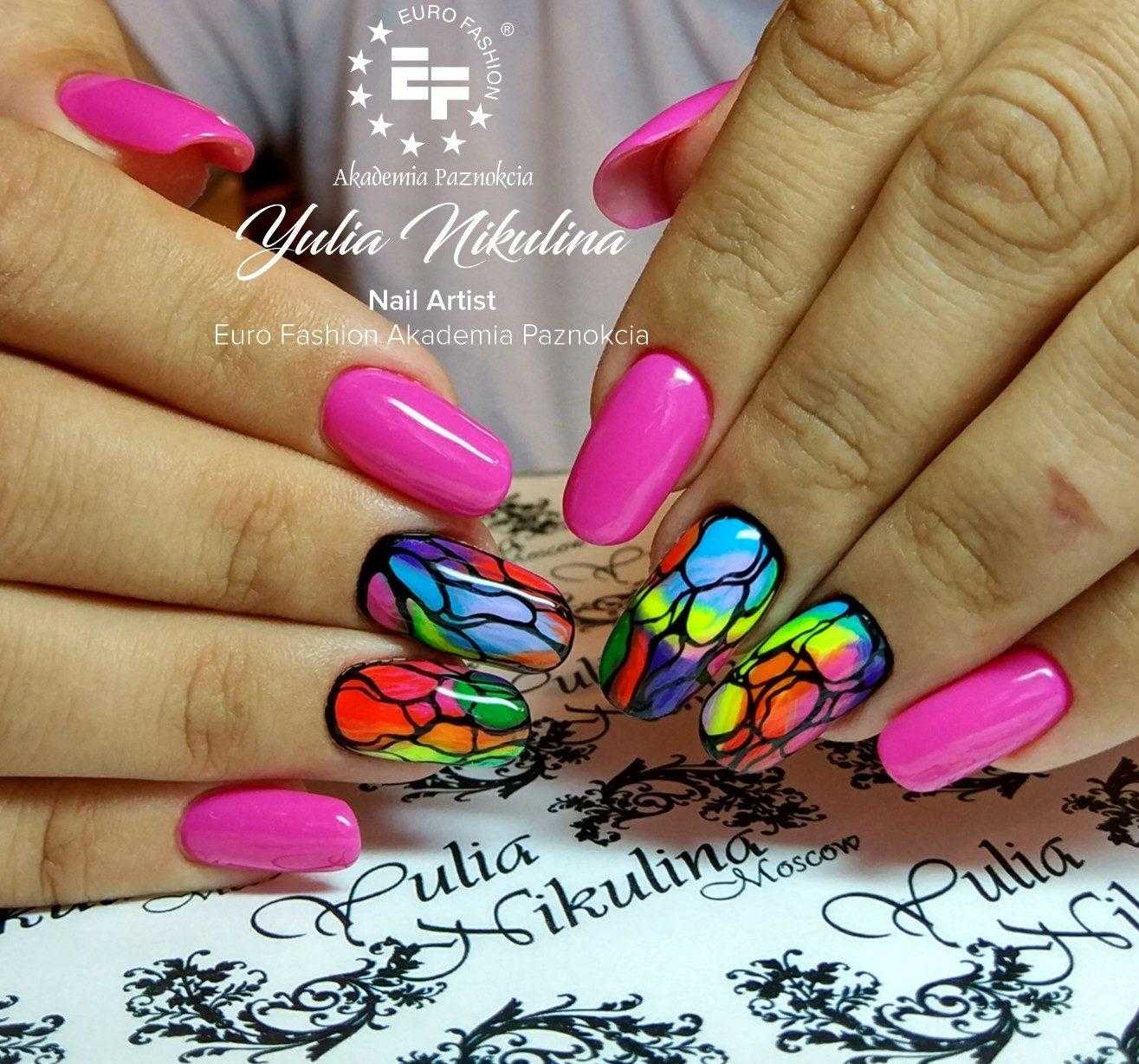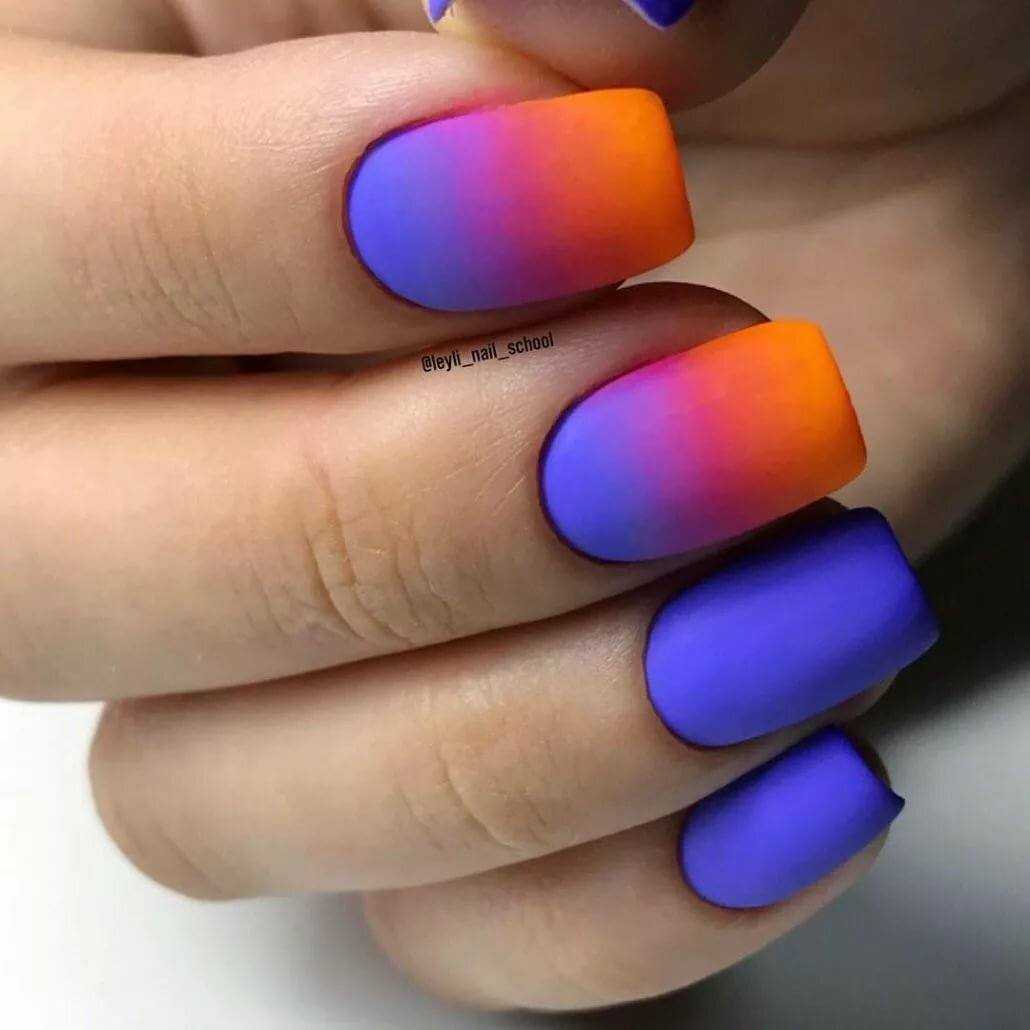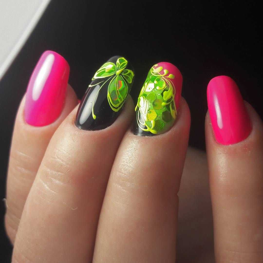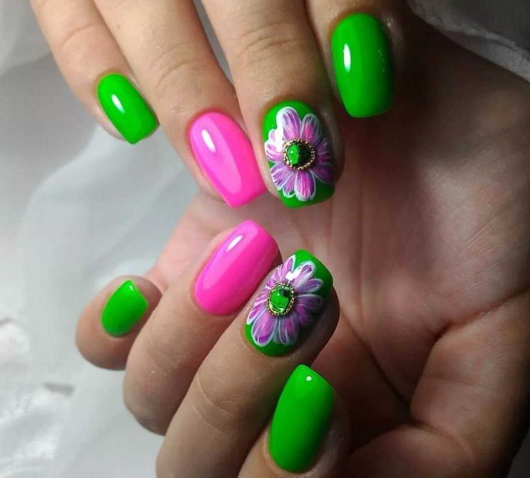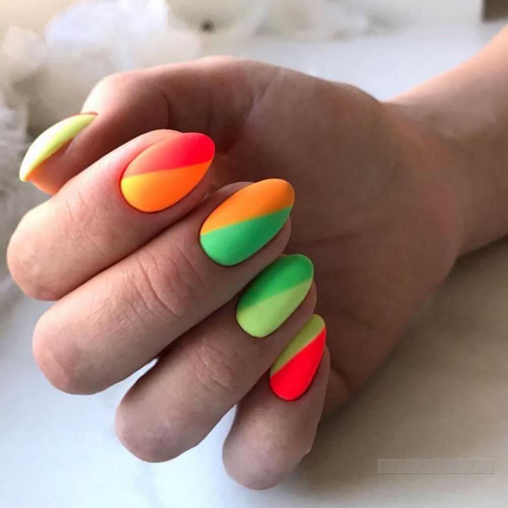 Такой маникюр выглядит необычно. Если вы желаете немного сгладить эффект, следует использовать градиент. Также можно выбрать пастельные оттенки цветов.