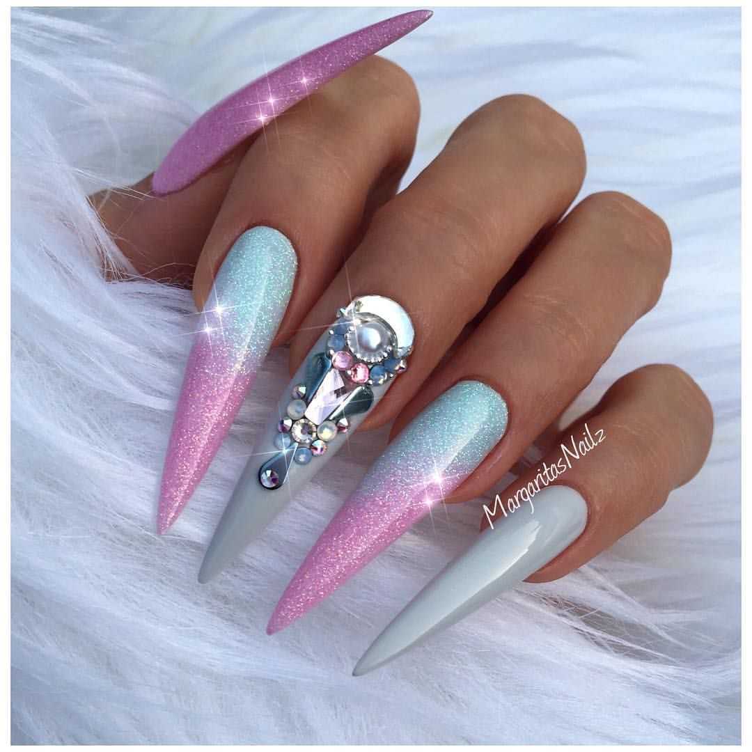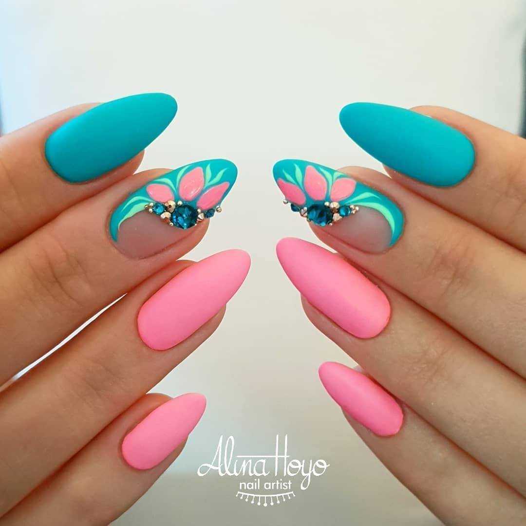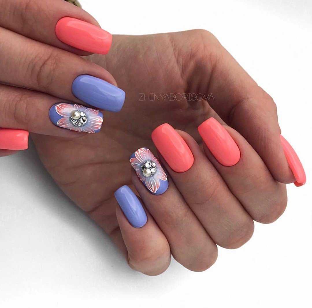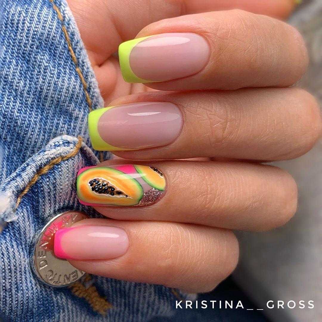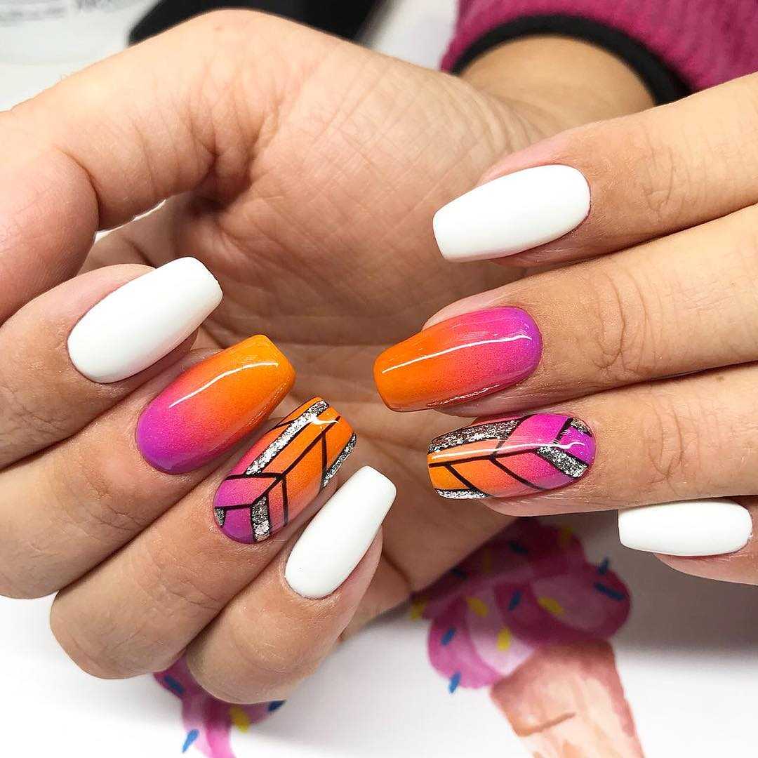 Такой маникюр выглядит необычно. Если вы желаете немного сгладить эффект, следует использовать градиент. Также можно выбрать пастельные оттенки цветов.