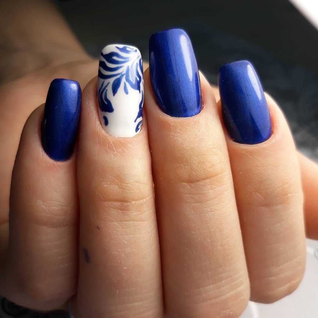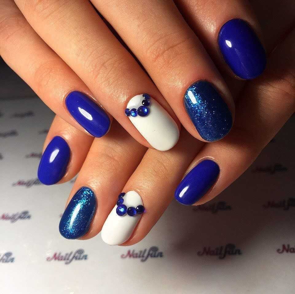 Сочетание синего и белого цвета сегодня считается наиболее распространённым вариантом дизайна. Это просто отличное решение, благодаря которому образ получится весьма интересным и нескучным. Синий оттенок может быть любым, от глубокого тёмного до нежного светлого. Благодаря белому цвету, любые сочетания будут смотреться стильно, свежо и эффектно. Сине-белый вид маникюра часто называют морским или используют этот дуэт для создания зимнего дизайна. Вы можете нанести белые рисунки на один из оттенков синего, или наоборот, украсить синими изображениями белые ноготки. Также очень красиво смотрится в таком маникюре выделение одним из цветов акцентного пальчика или комбинирование обоих покрытий на одном ноготке.