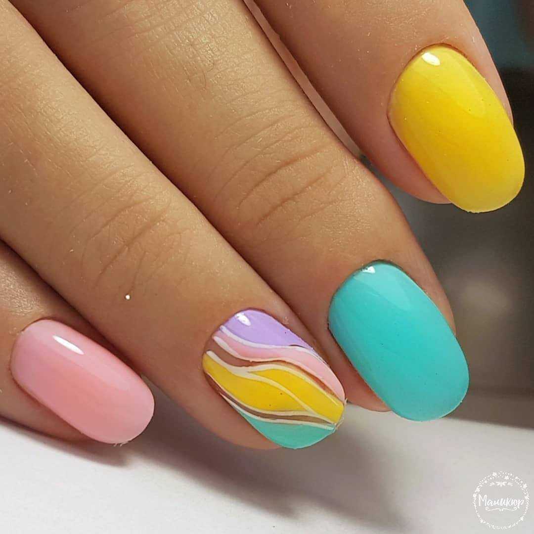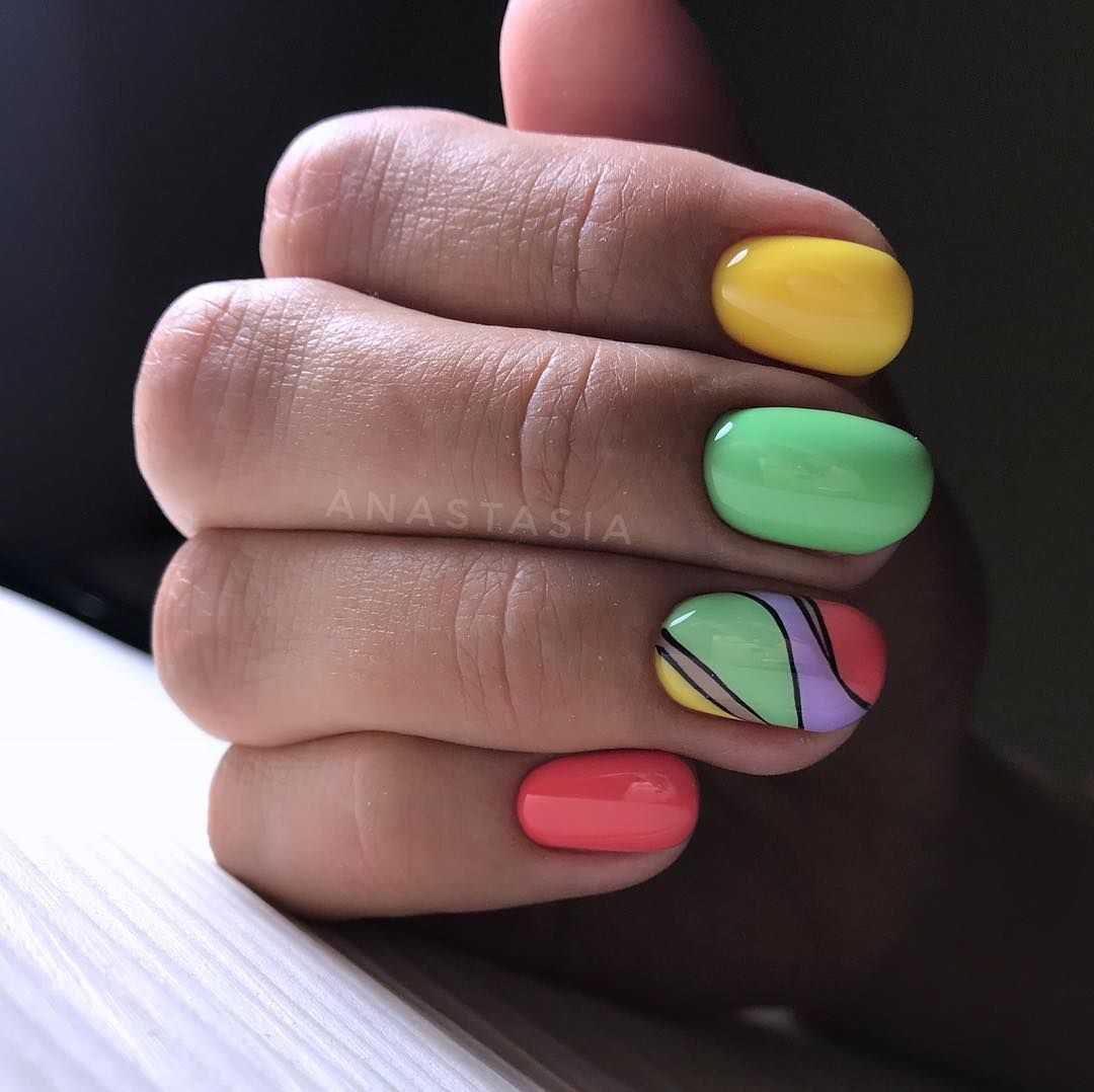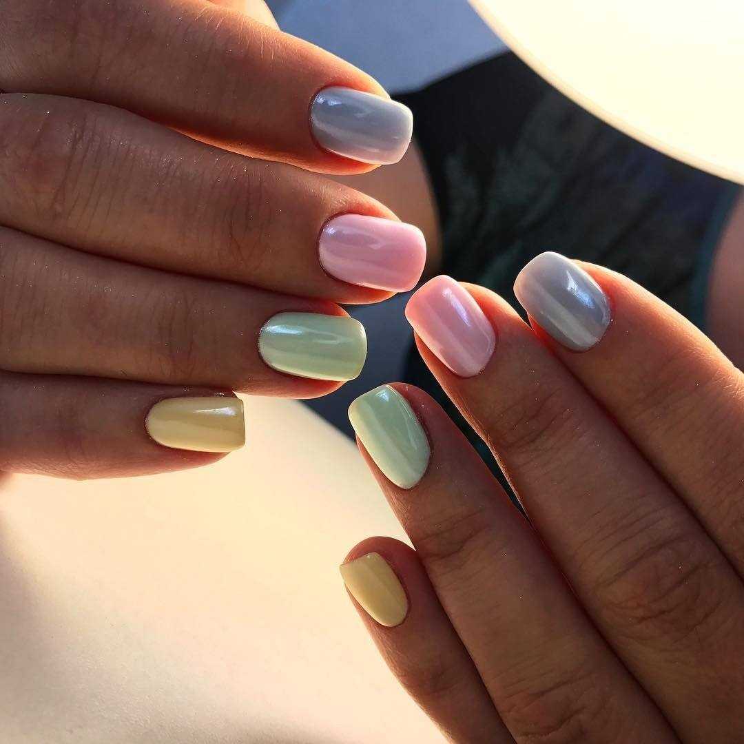 Если вам не нравится придерживаться столь строгих правил при выборе оттенков, можно просто накрасить ногти разными цветами лаков. Это решение не имеет отношения ни к одной из схем, зато очень популярно в 2020 году.