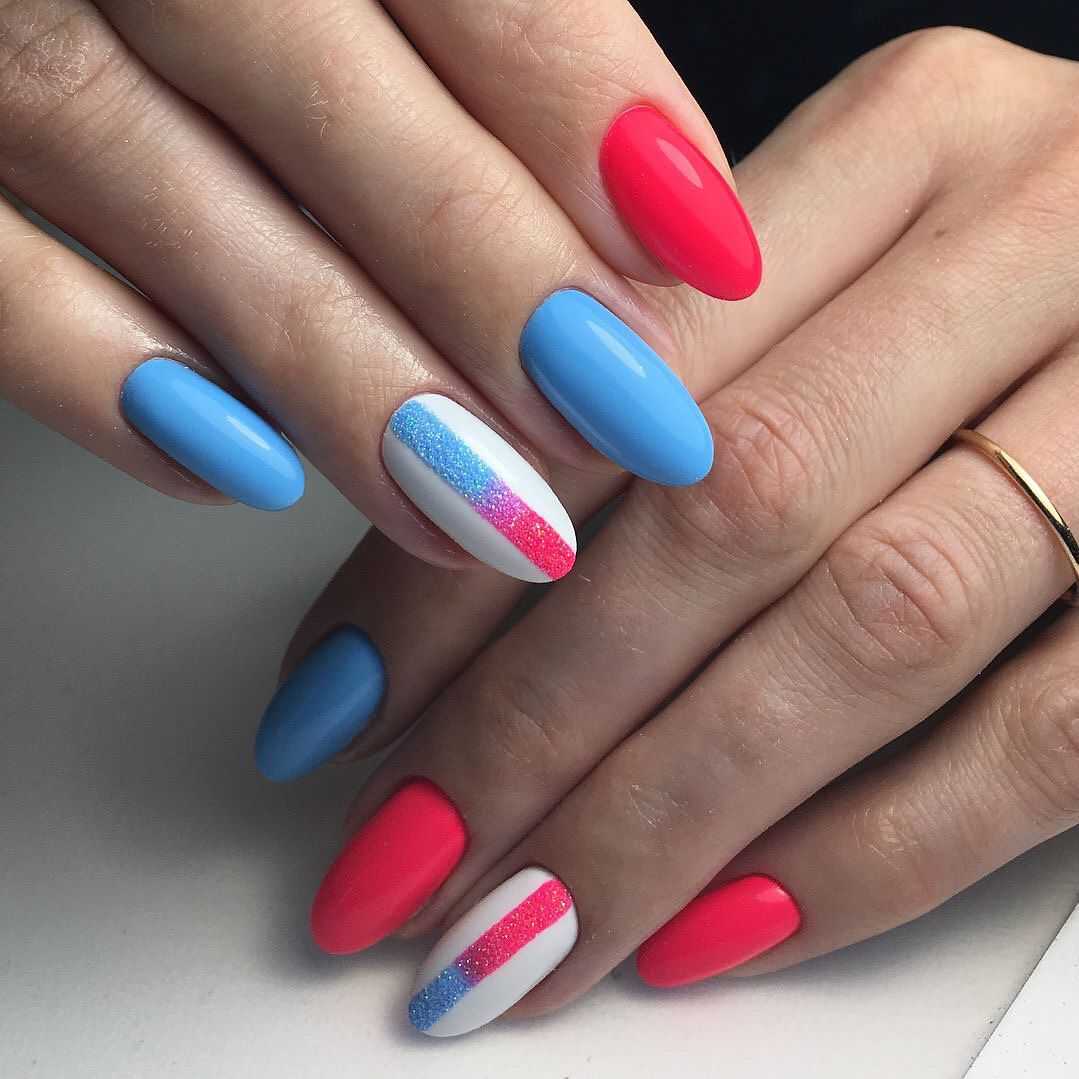 Белоснежные участки всегда выглядят привлекательно. Даже самое простое сочетание маникюр синий красный белый смотрится выигрышно. В таком сочетании можно сделать дизайн на морскую, патриотическую тематику и т.п.